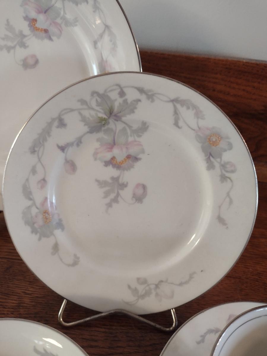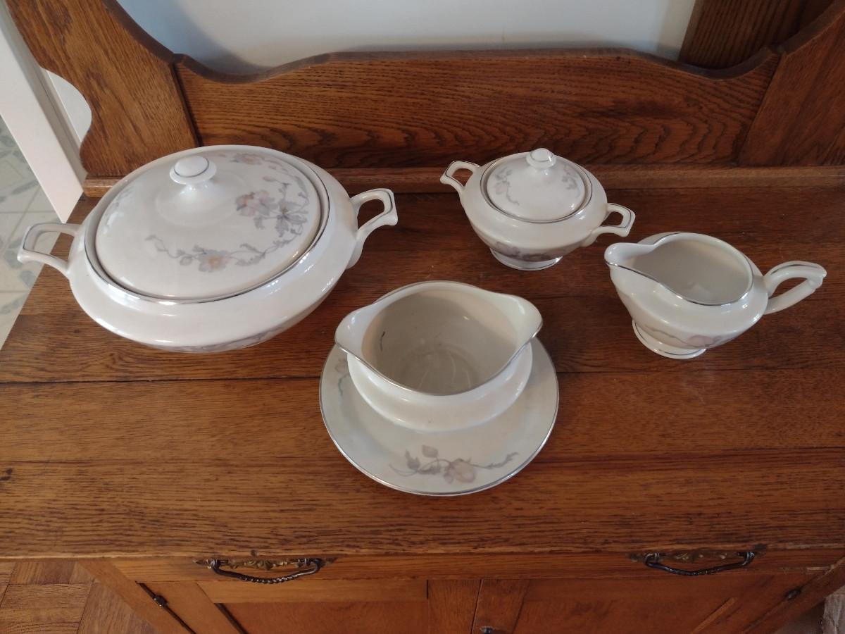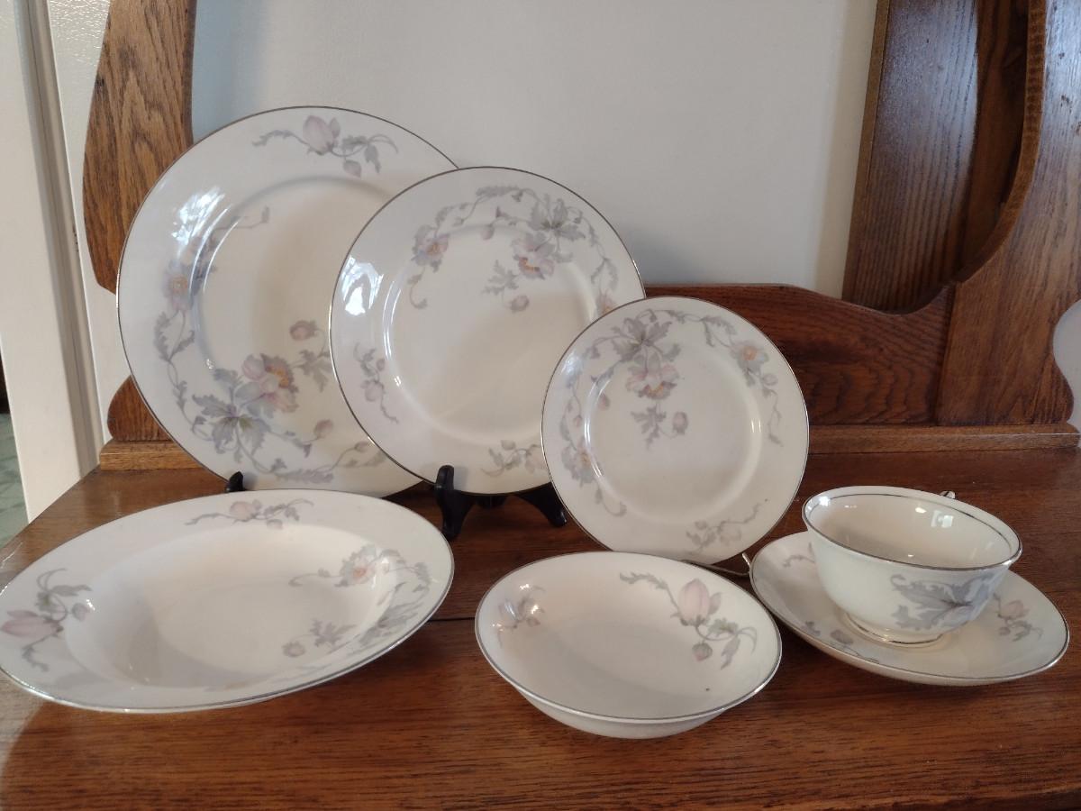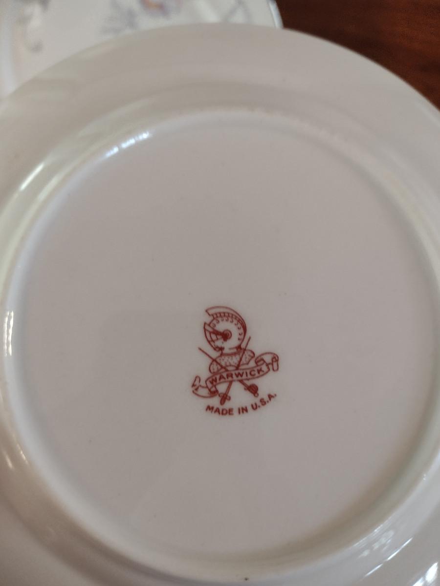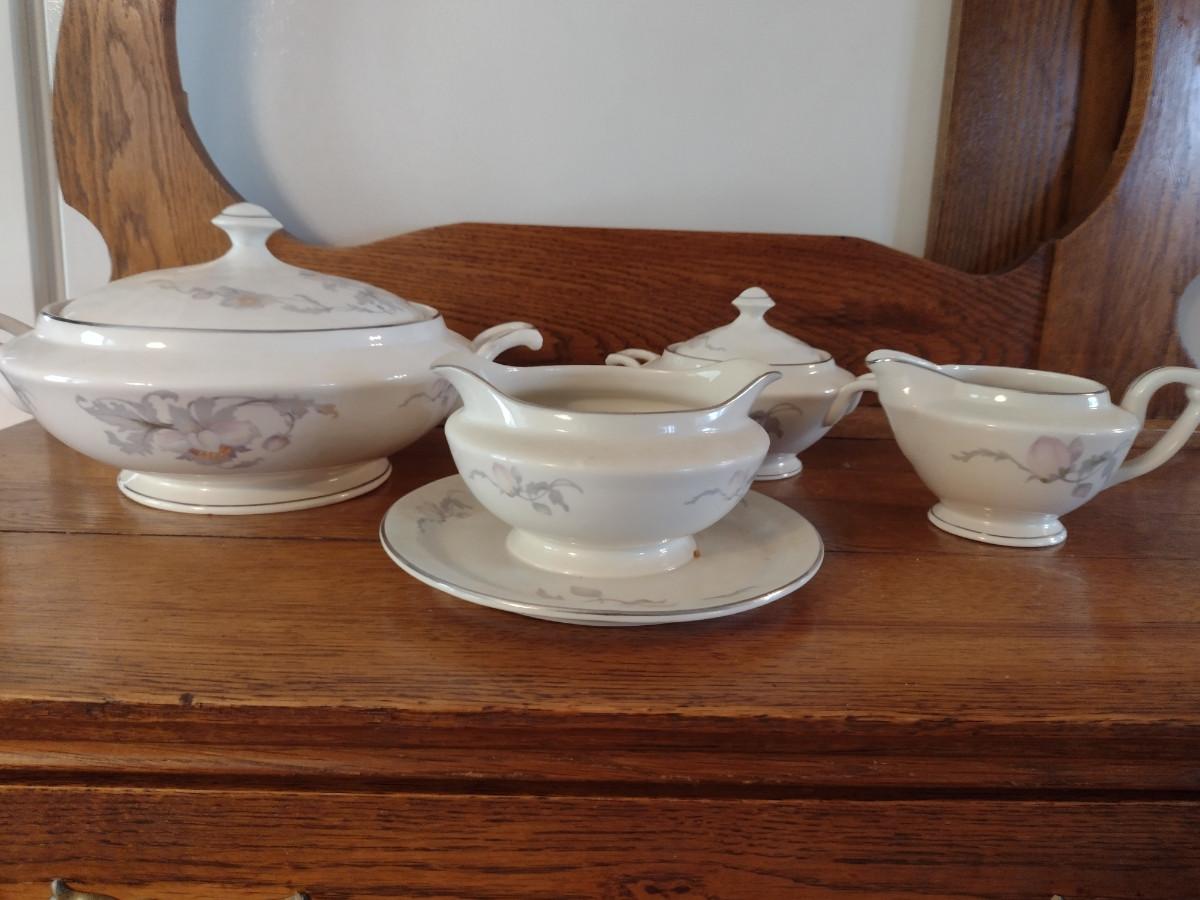 Warwick 'Silver Poppy' China- Approx 65 Pieces. Dinner plate (10")- 12, salad plate (8")- 10, bread plate (6 1/4")- 12, berry bowl- 11, saucer- 12, cup- 11, soup bowl- 12, cream and sugar, oval platters: 11 1/4"- 1, 14 1/2"- 1, soup taureen-1, oval vegetable bowl (10")- 2, gravy with under plate- 1. Items are in used condition- expect chipping.