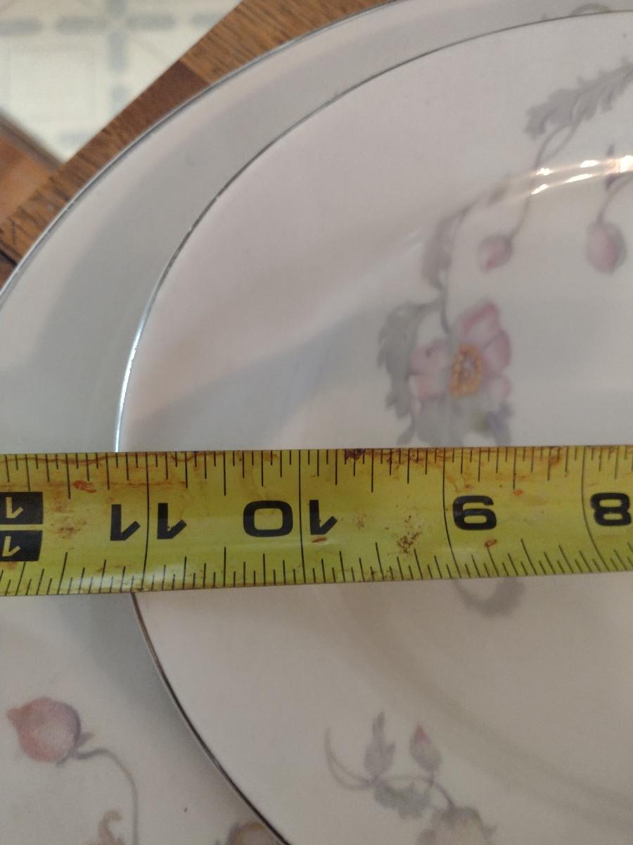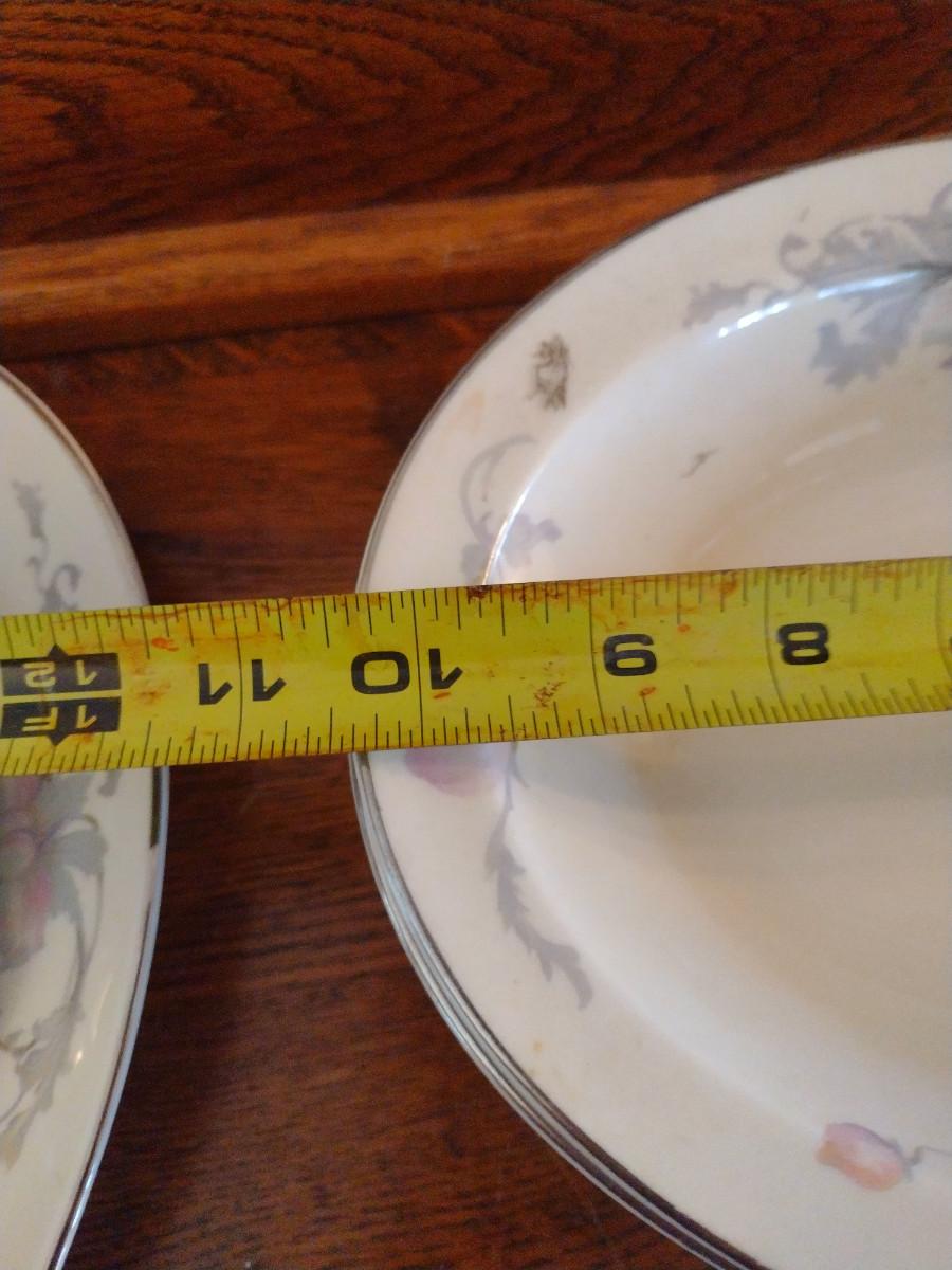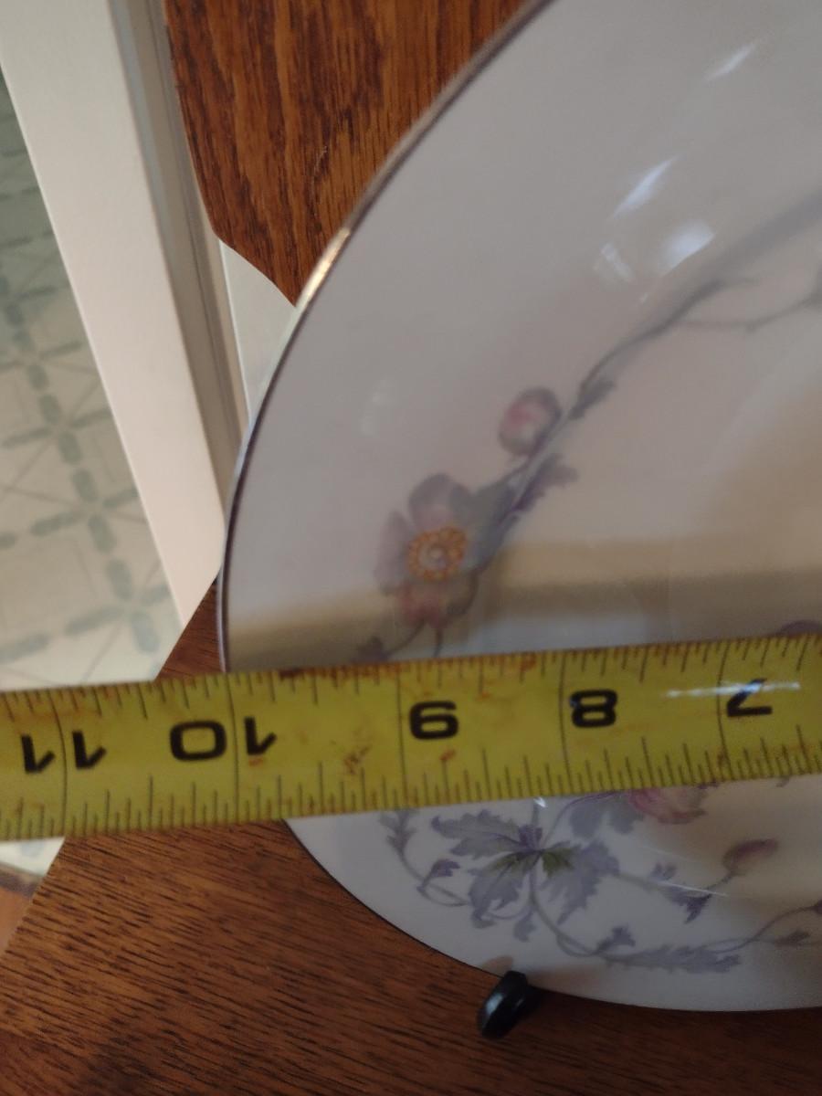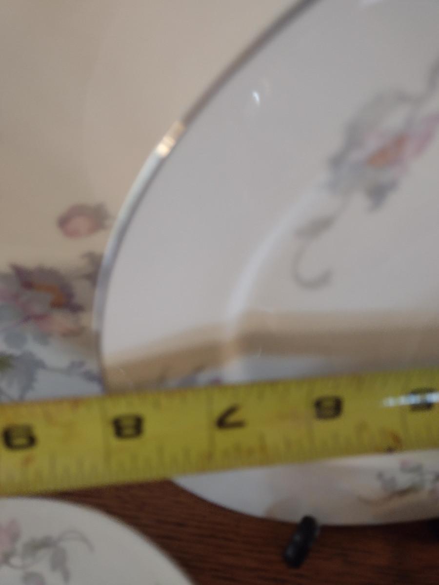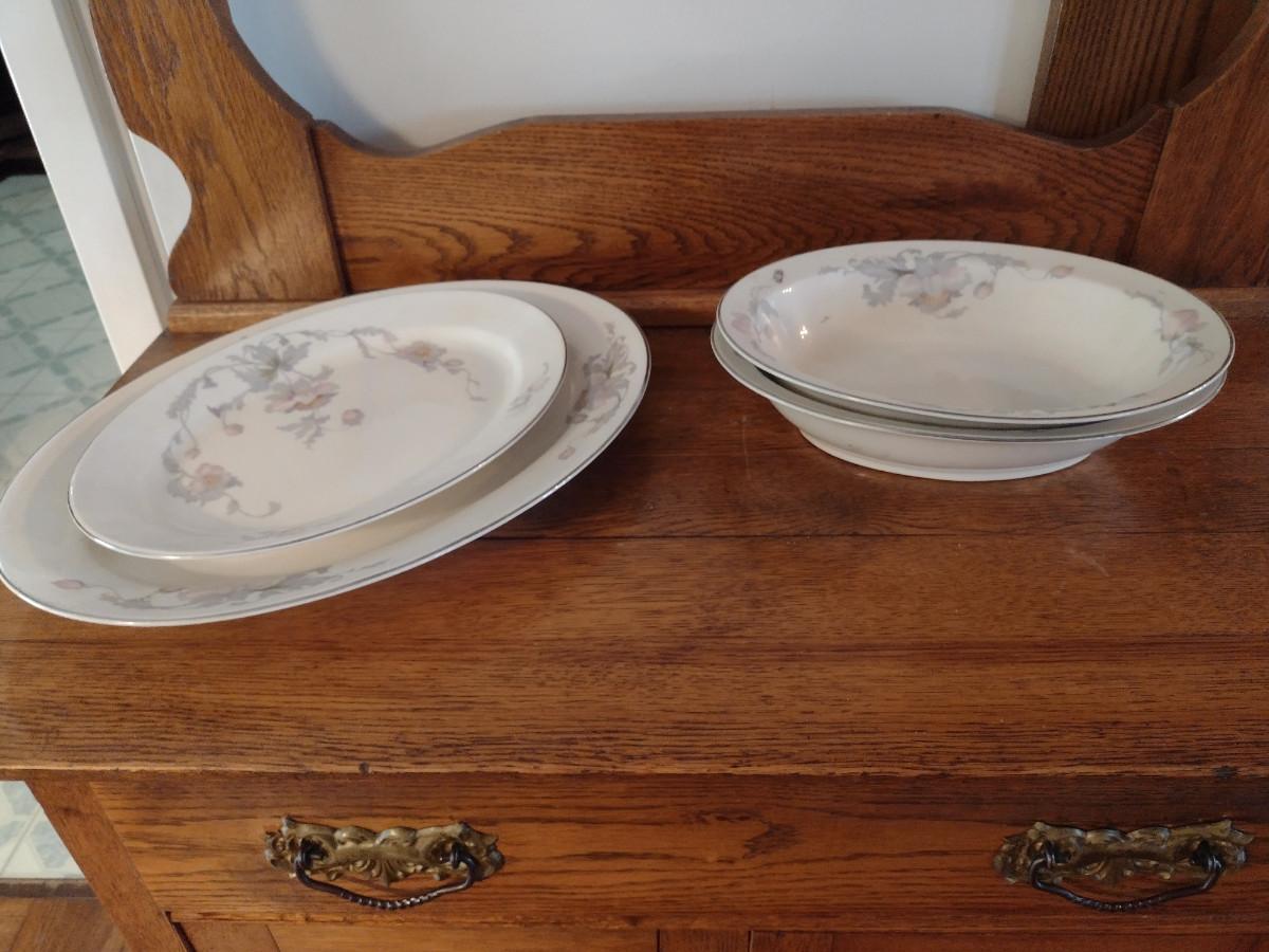 Warwick 'Silver Poppy' China- Approx 65 Pieces. Dinner plate (10")- 12, salad plate (8")- 10, bread plate (6 1/4")- 12, berry bowl- 11, saucer- 12, cup- 11, soup bowl- 12, cream and sugar, oval platters: 11 1/4"- 1, 14 1/2"- 1, soup taureen-1, oval vegetable bowl (10")- 2, gravy with under plate- 1. Items are in used condition- expect chipping.