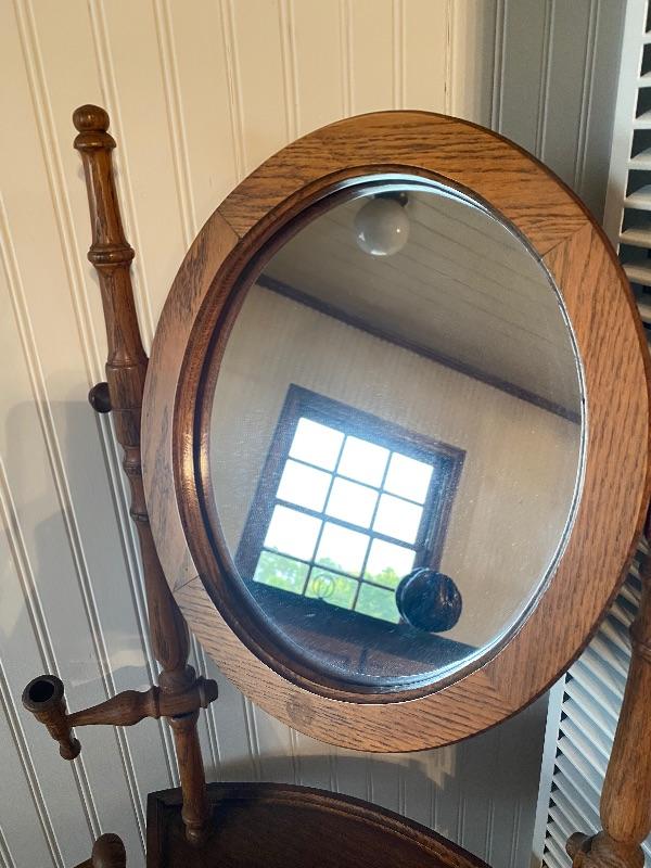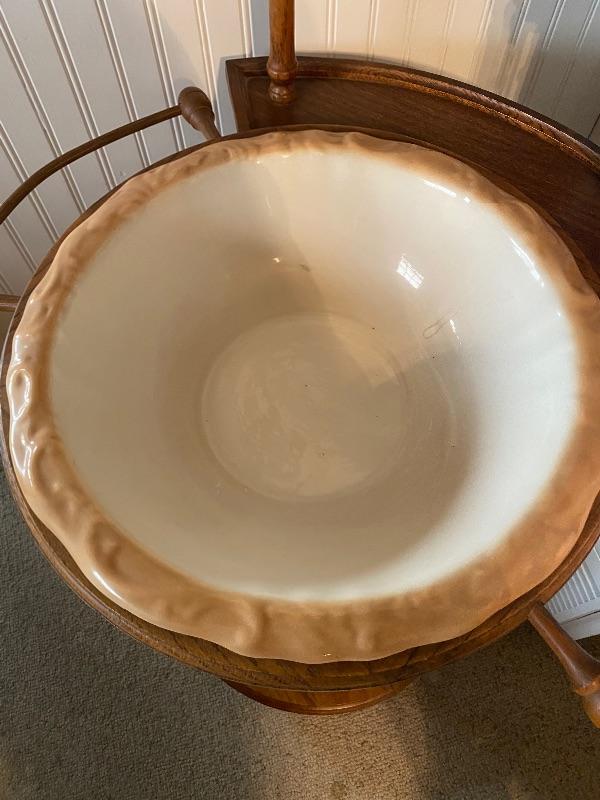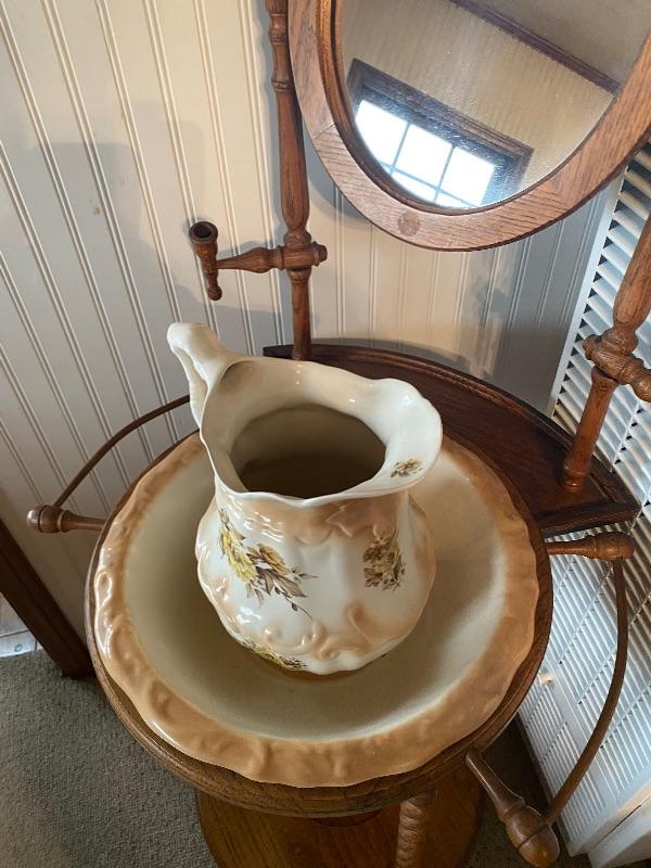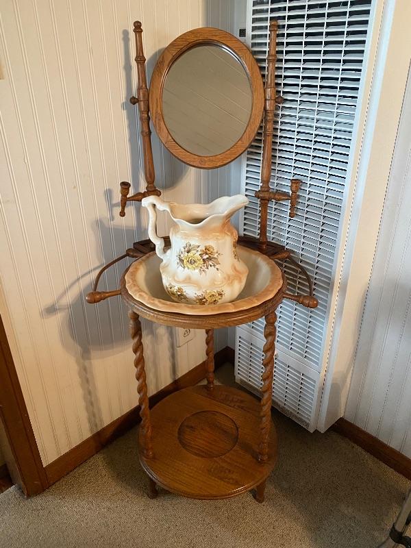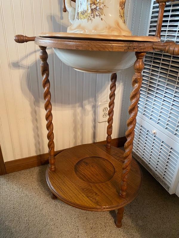 Oak barley twist wash basin stand. Medium oak finish. Swivel mirror, towel bars, and candle holders. Comes with beautiful ceramic pitcher and bowl. Stands 51” tall and is 23” wide. All pieces are in good condition but may be dusty.