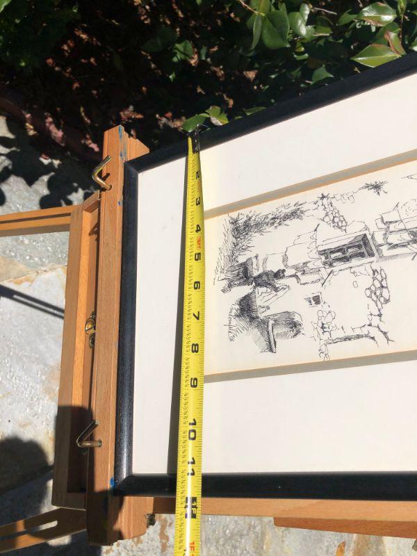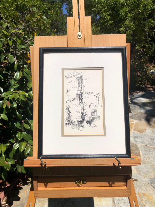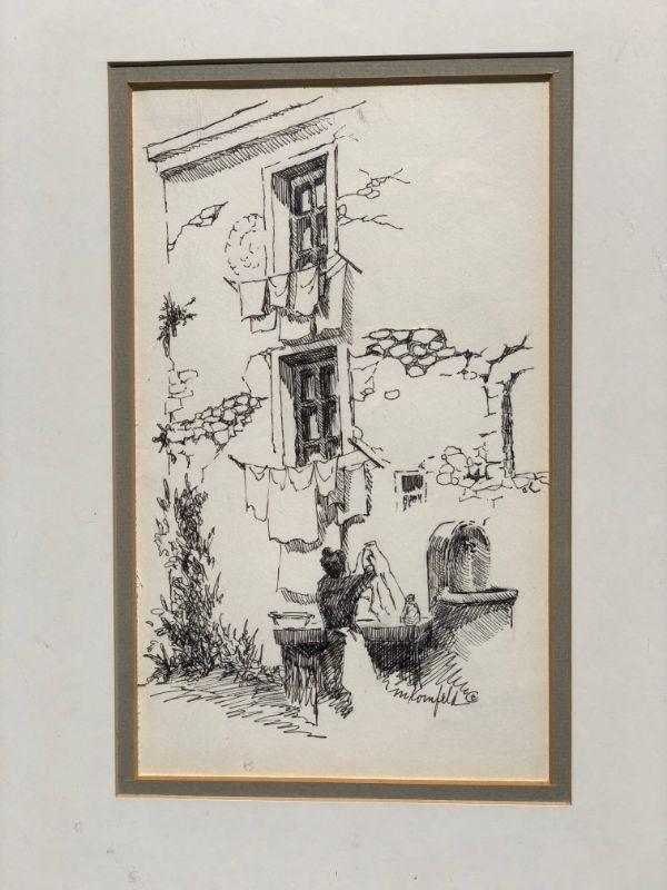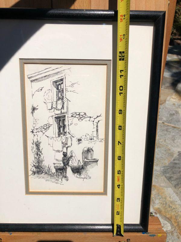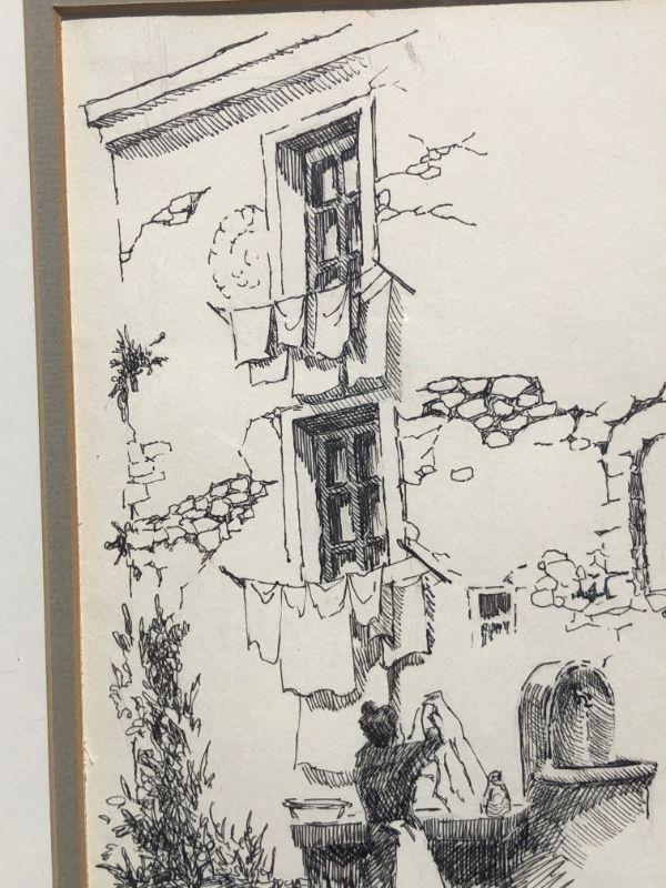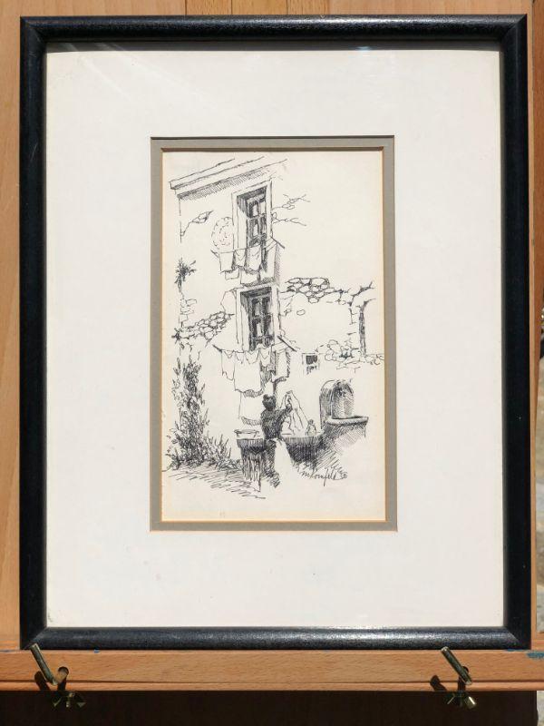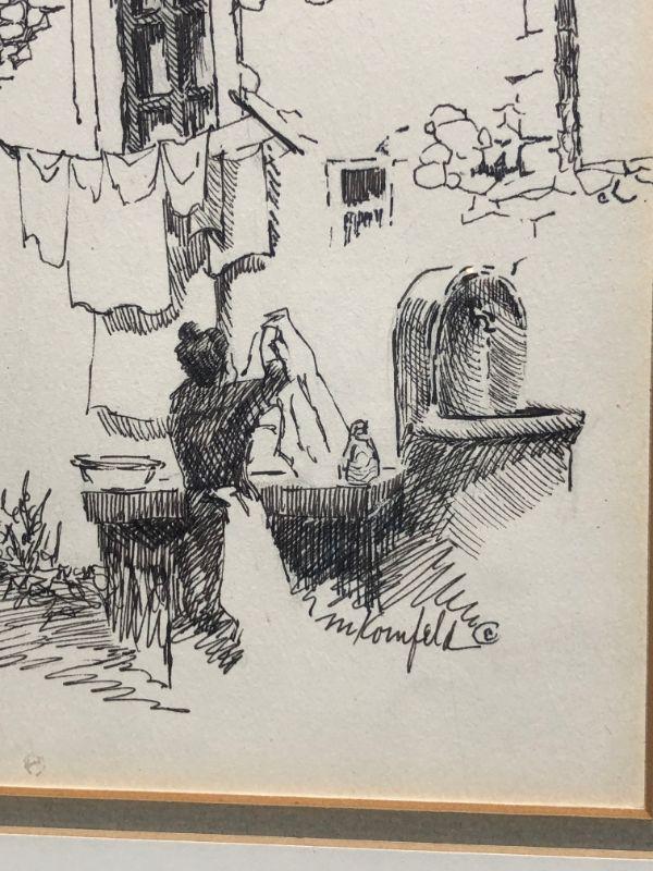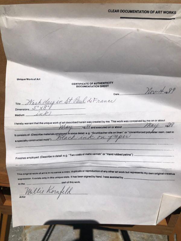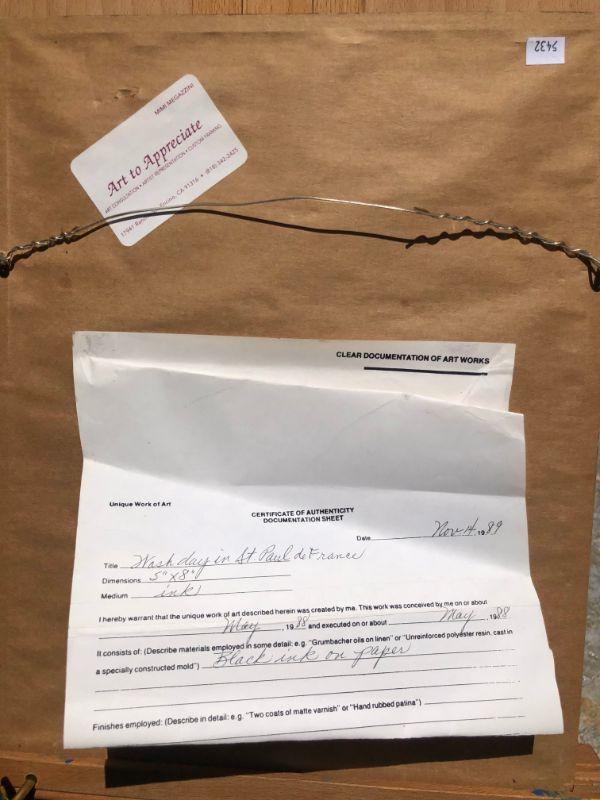 Original black ink on paper by Millie Kornfeld, "Wash Day in St Paul de France". Certificate of Authenticity on back. In very good condition.