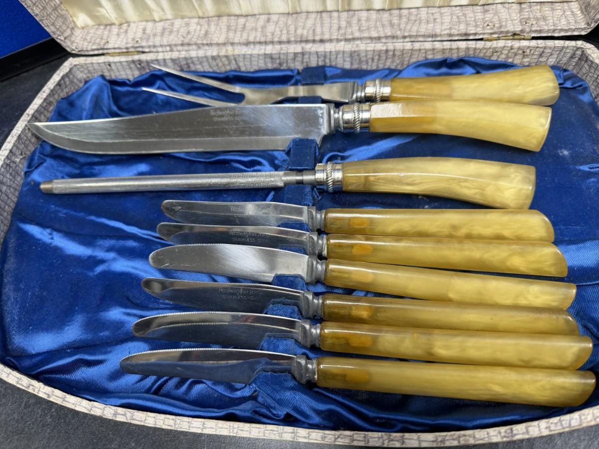 Vintage Carving set with butter knives, butterscotch colored Bakelite handles, housed in the original case.