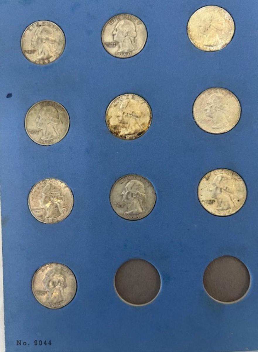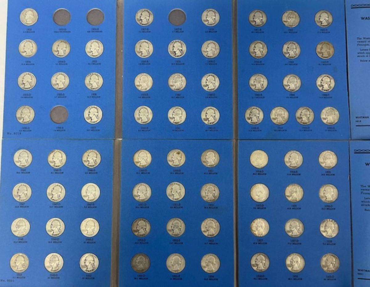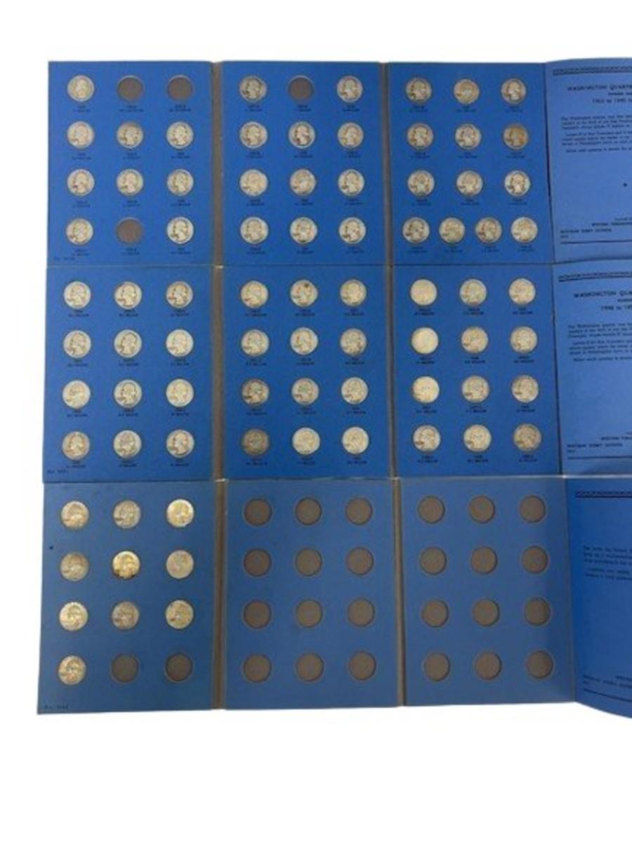 **REQUIRES WIRE TRANSFER IF SHIPPED.** Dates range from 1932 to 1964. Missing 1932D, 1932S, 1936S, and 1937S. Total of 79 quarters. Silver content is 90%. [GL]