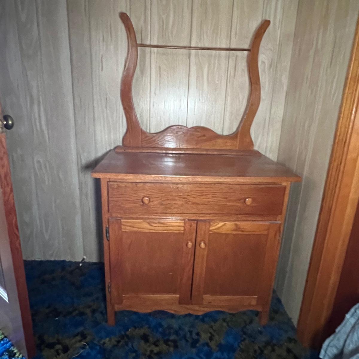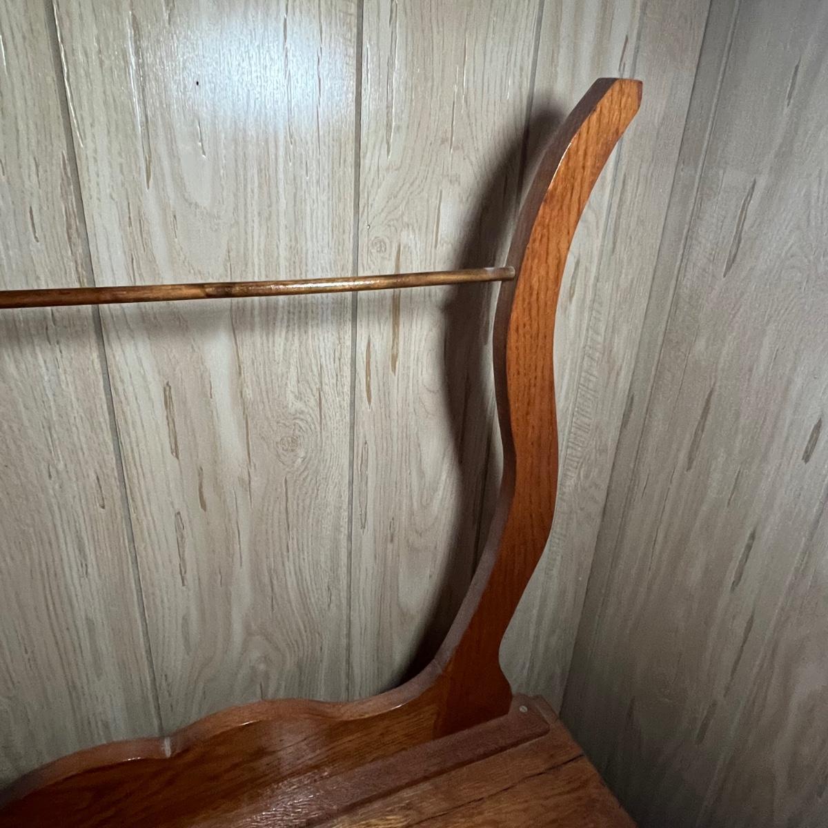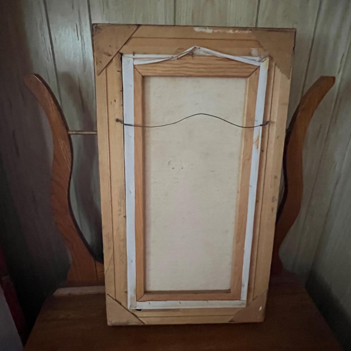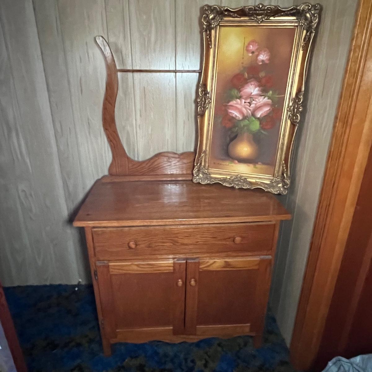 This solid wood vintage washstand has a harp towel rod back. It measures 17” x 42” x 55” H (to top of harp). It does have a small split in the top surface, see image. It has been paired with a Victorian style painting that appears to be an oil painting and bares a signature that possibly reads E. Randel or something similar. It is mounted in an ornate gold painted wooden frame that measures 17” x 2” x 28.5”.