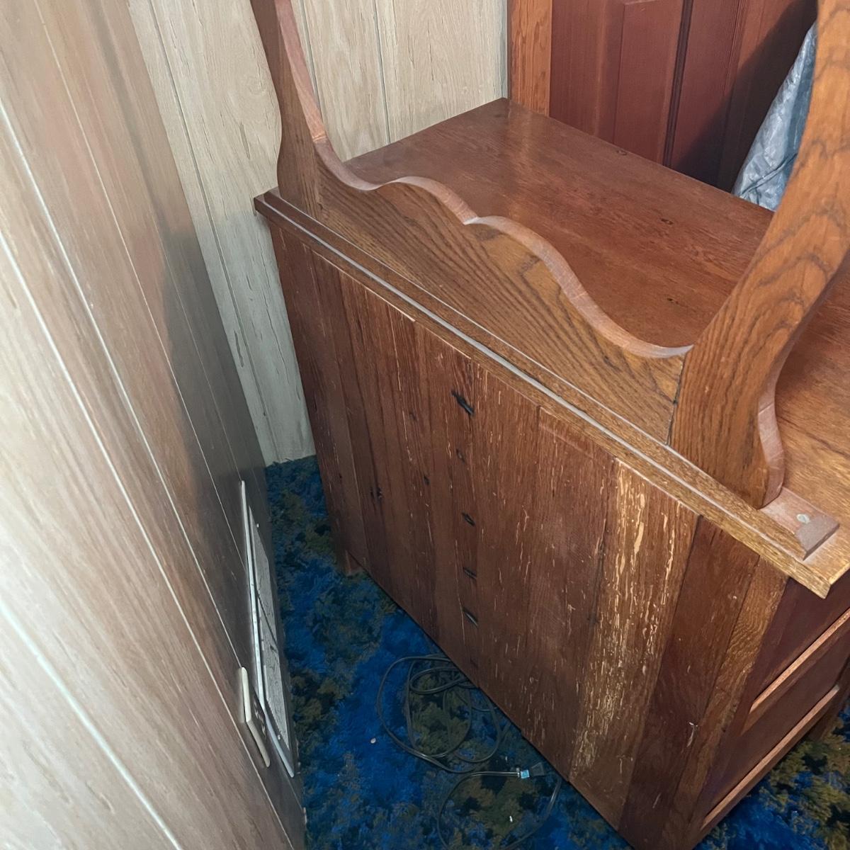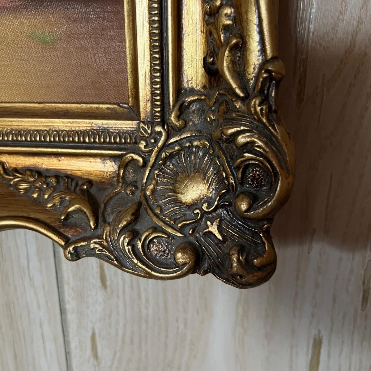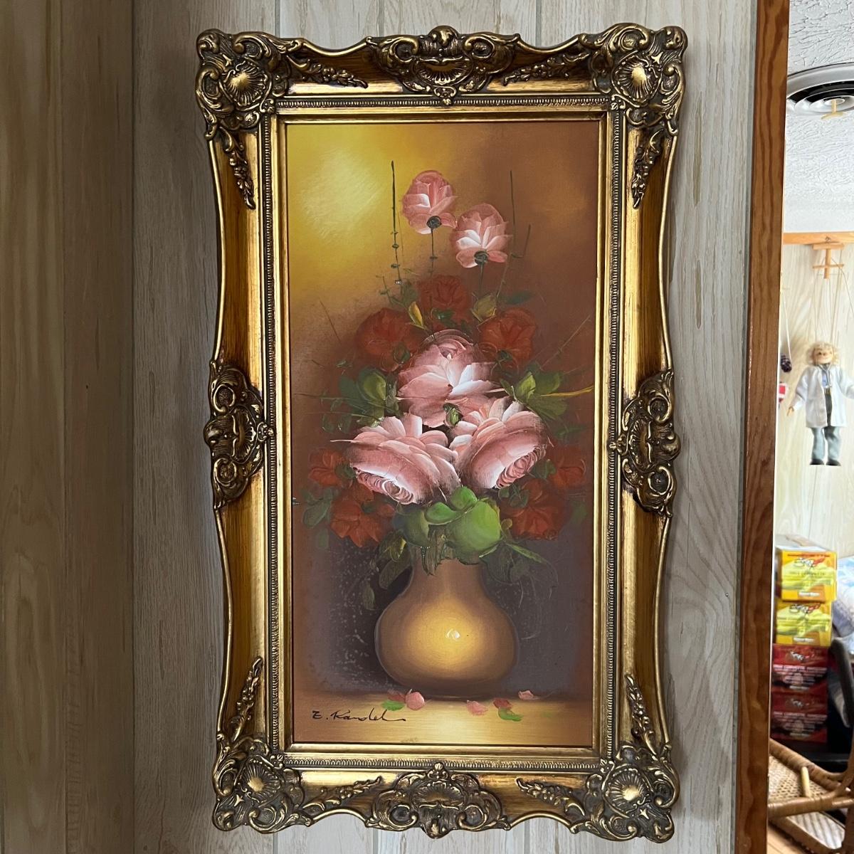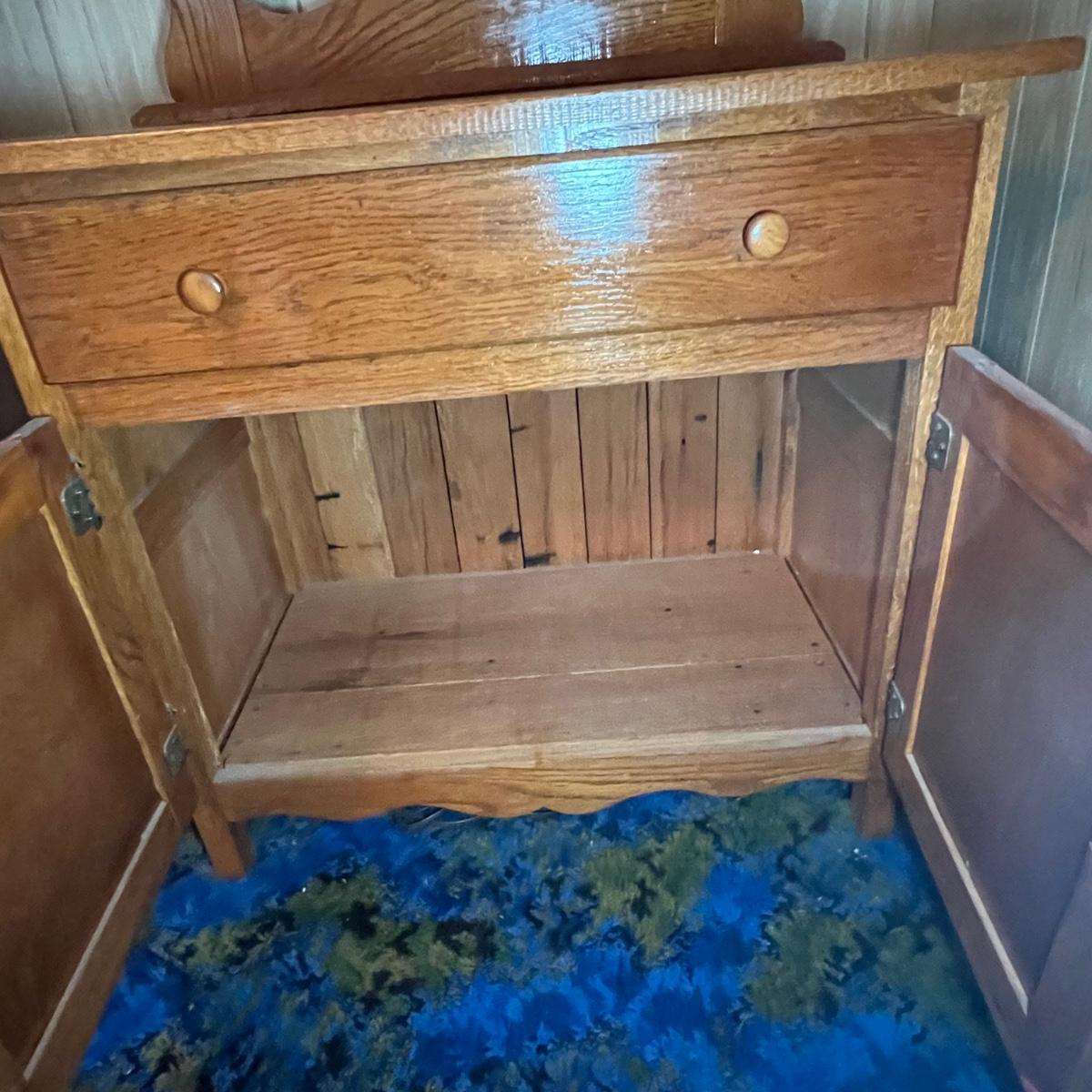 This solid wood vintage washstand has a harp towel rod back. It measures 17” x 42” x 55” H (to top of harp). It does have a small split in the top surface, see image. It has been paired with a Victorian style painting that appears to be an oil painting and bares a signature that possibly reads E. Randel or something similar. It is mounted in an ornate gold painted wooden frame that measures 17” x 2” x 28.5”.