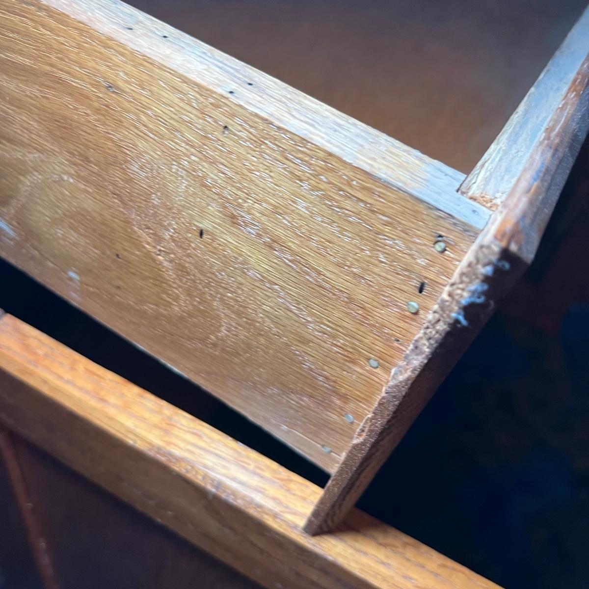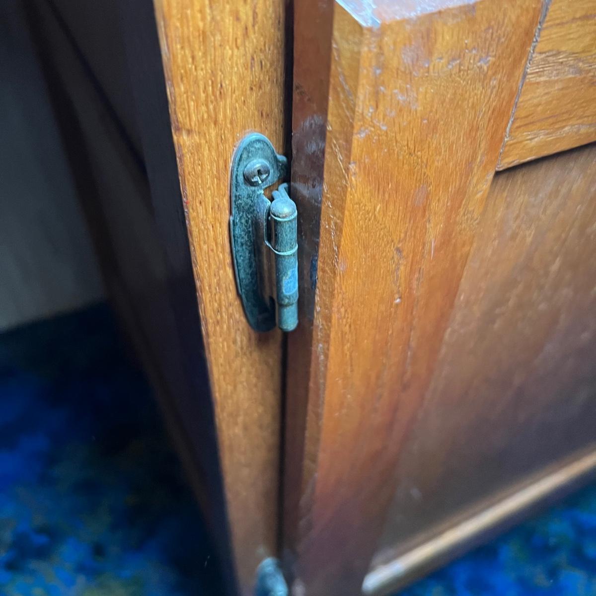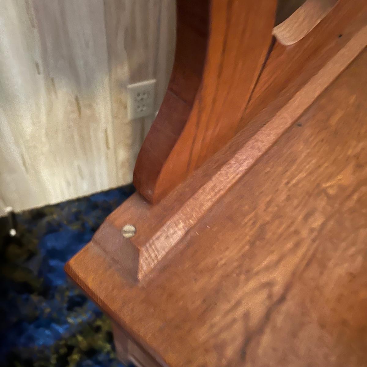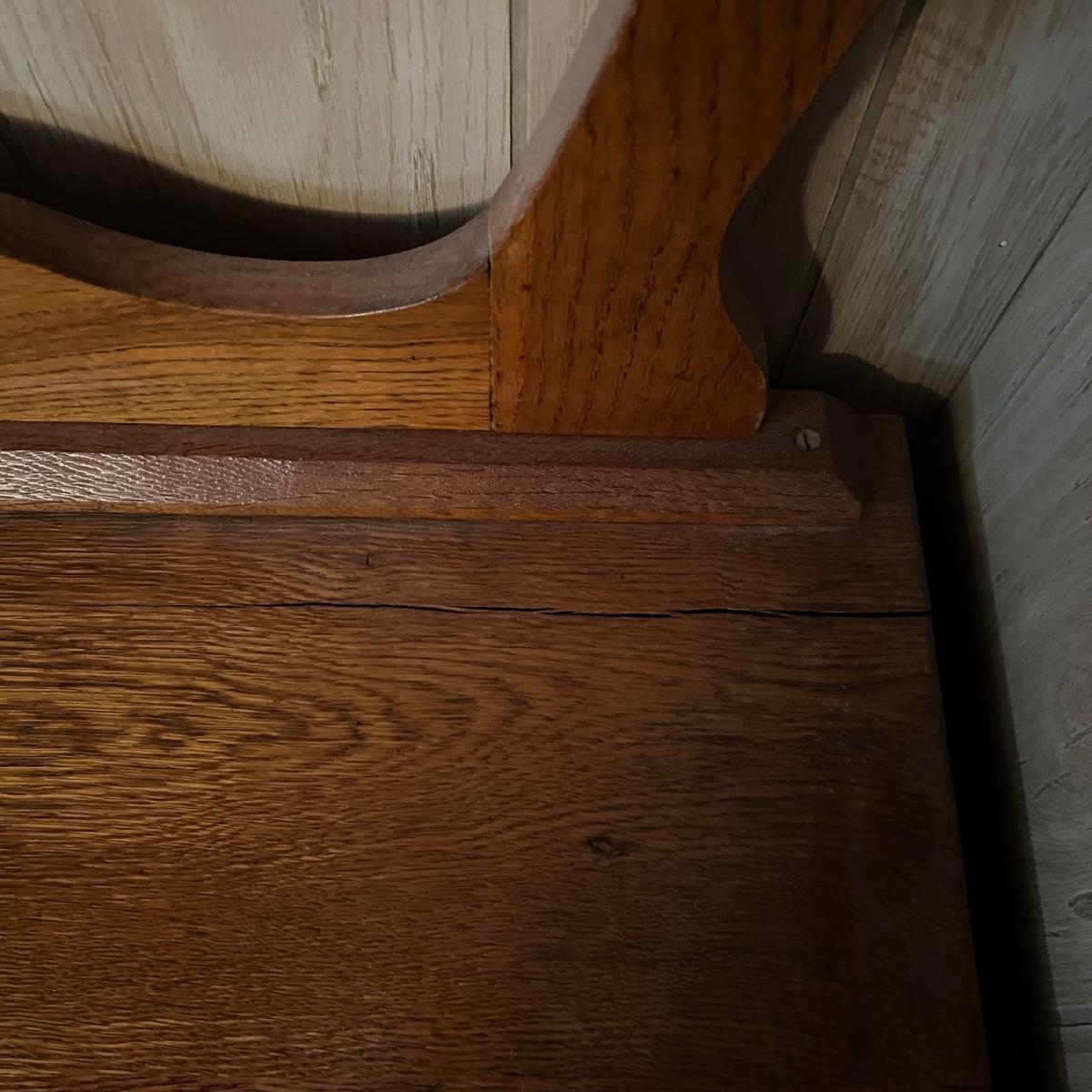 This solid wood vintage washstand has a harp towel rod back. It measures 17” x 42” x 55” H (to top of harp). It does have a small split in the top surface, see image. It has been paired with a Victorian style painting that appears to be an oil painting and bares a signature that possibly reads E. Randel or something similar. It is mounted in an ornate gold painted wooden frame that measures 17” x 2” x 28.5”.