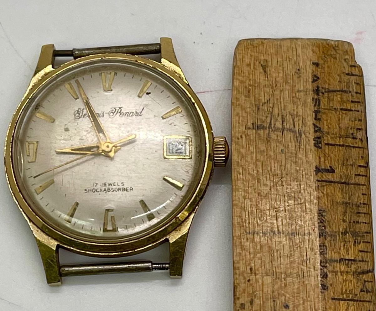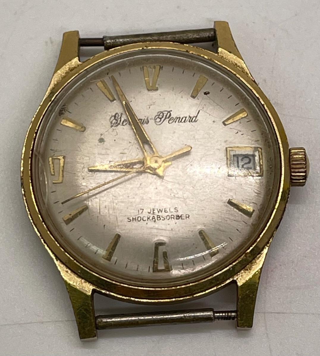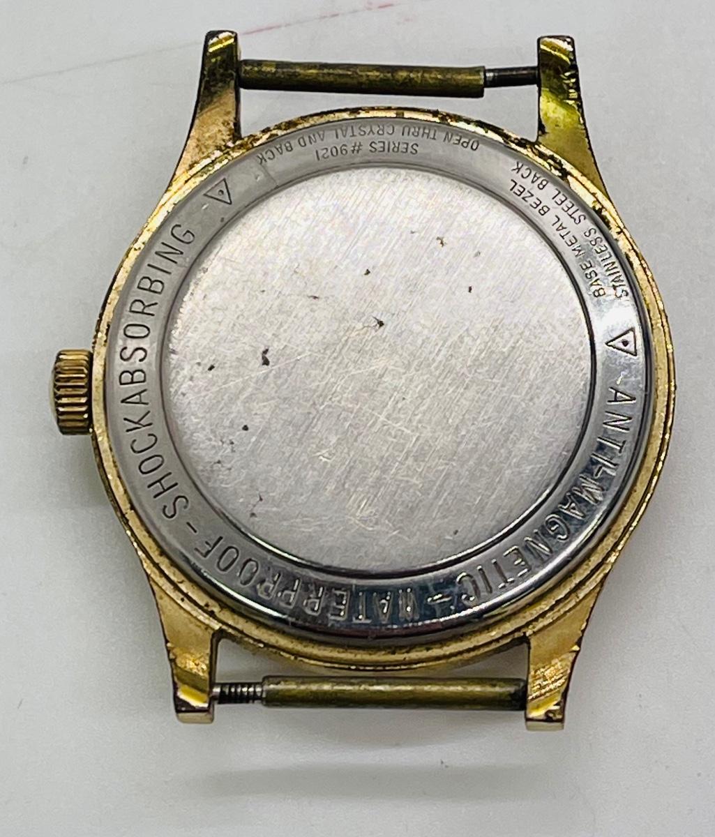Gold-tone case. Series #9021. No band, watch only. Sweep second and, small window to display day of month. 17 Jewels, anti-magnetic, waterproof, shockabsorbing. Stem pulls out to adjust hands, clicks back into place as expected. Not running, most likely needs a new battery. Crystal has some scratches and hazing, it may be possible to polish it so that is becomes clearer.