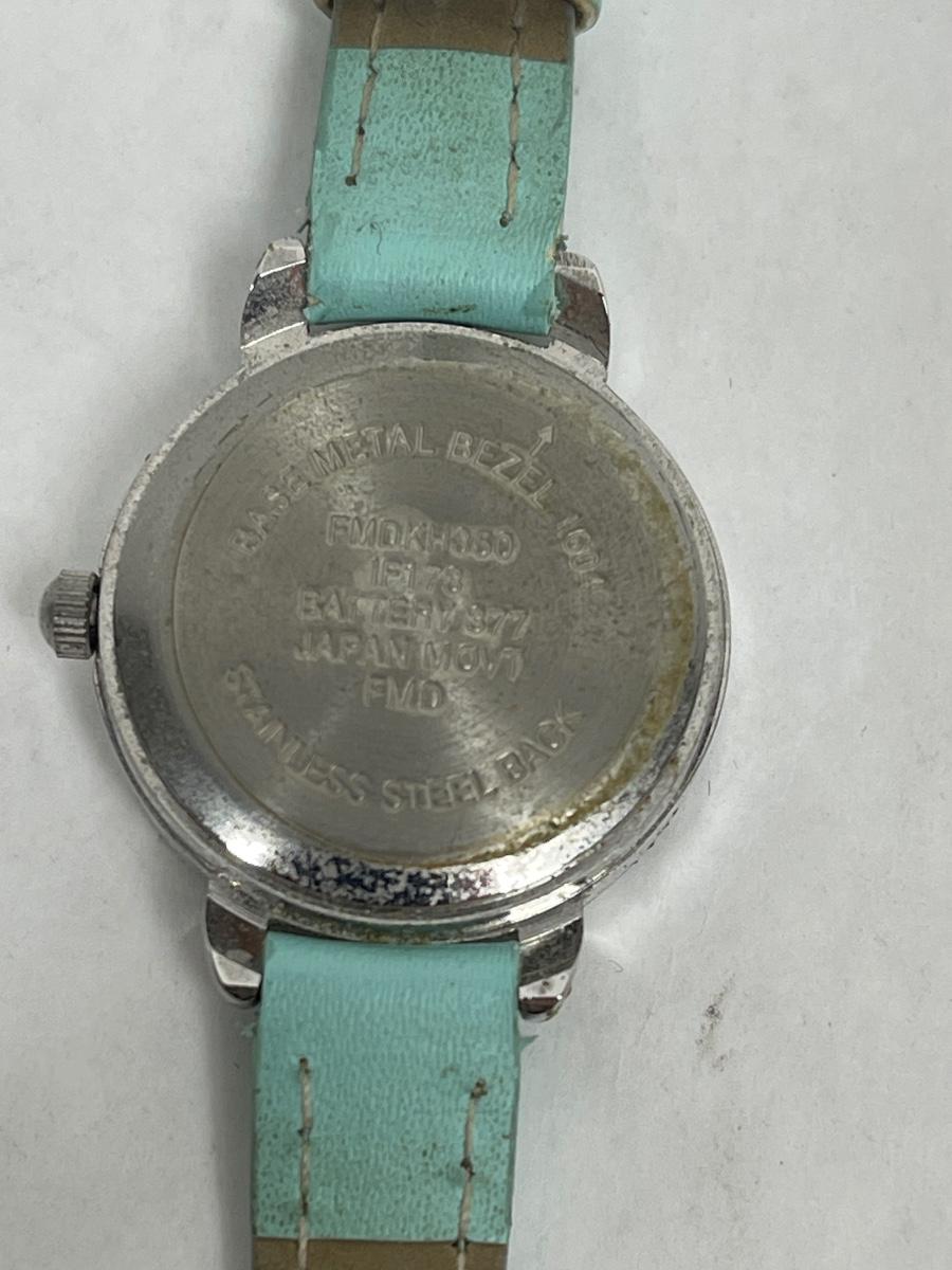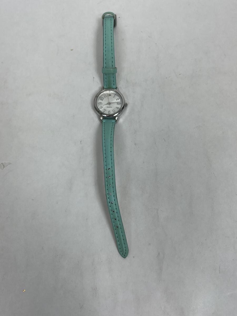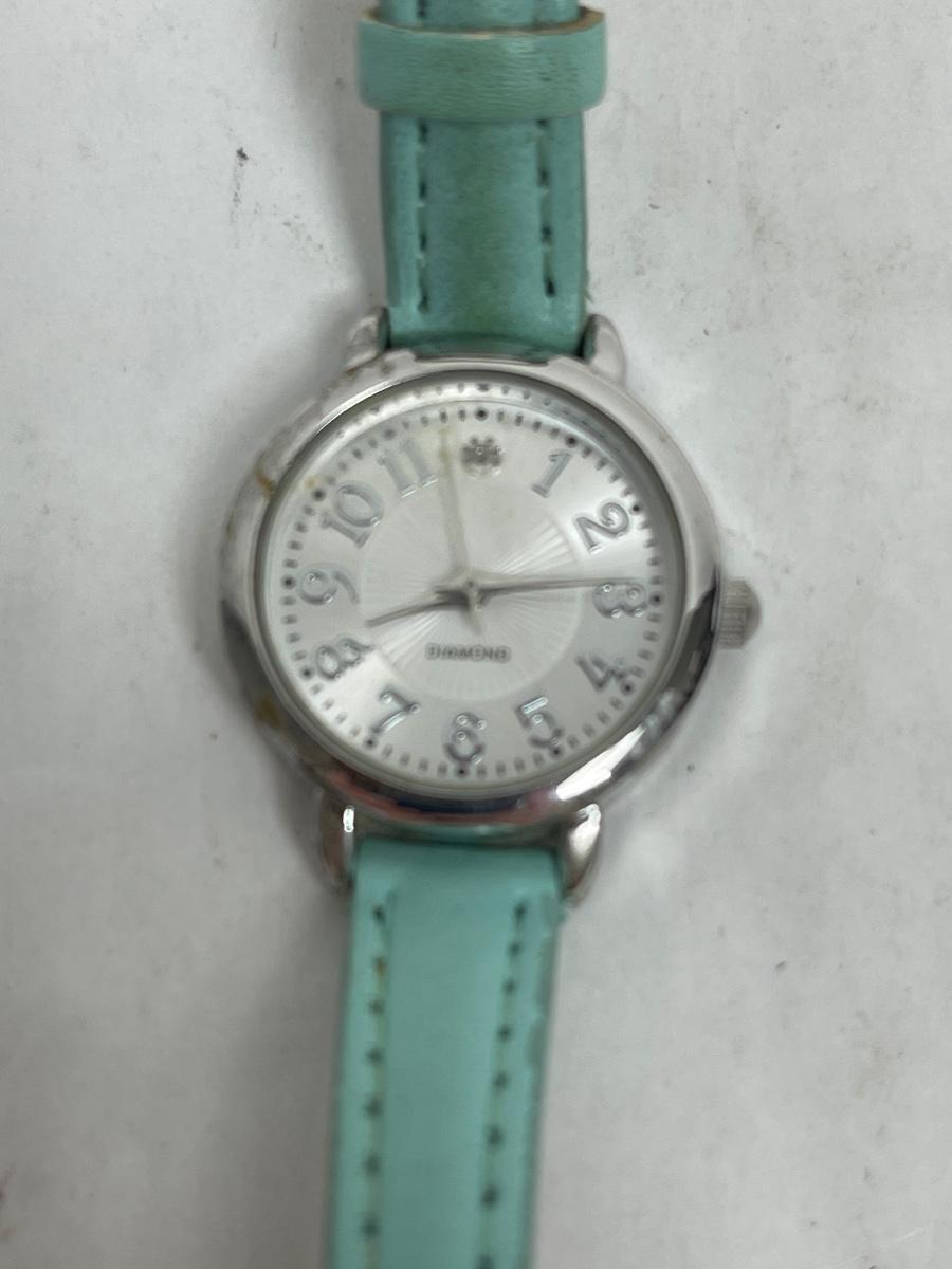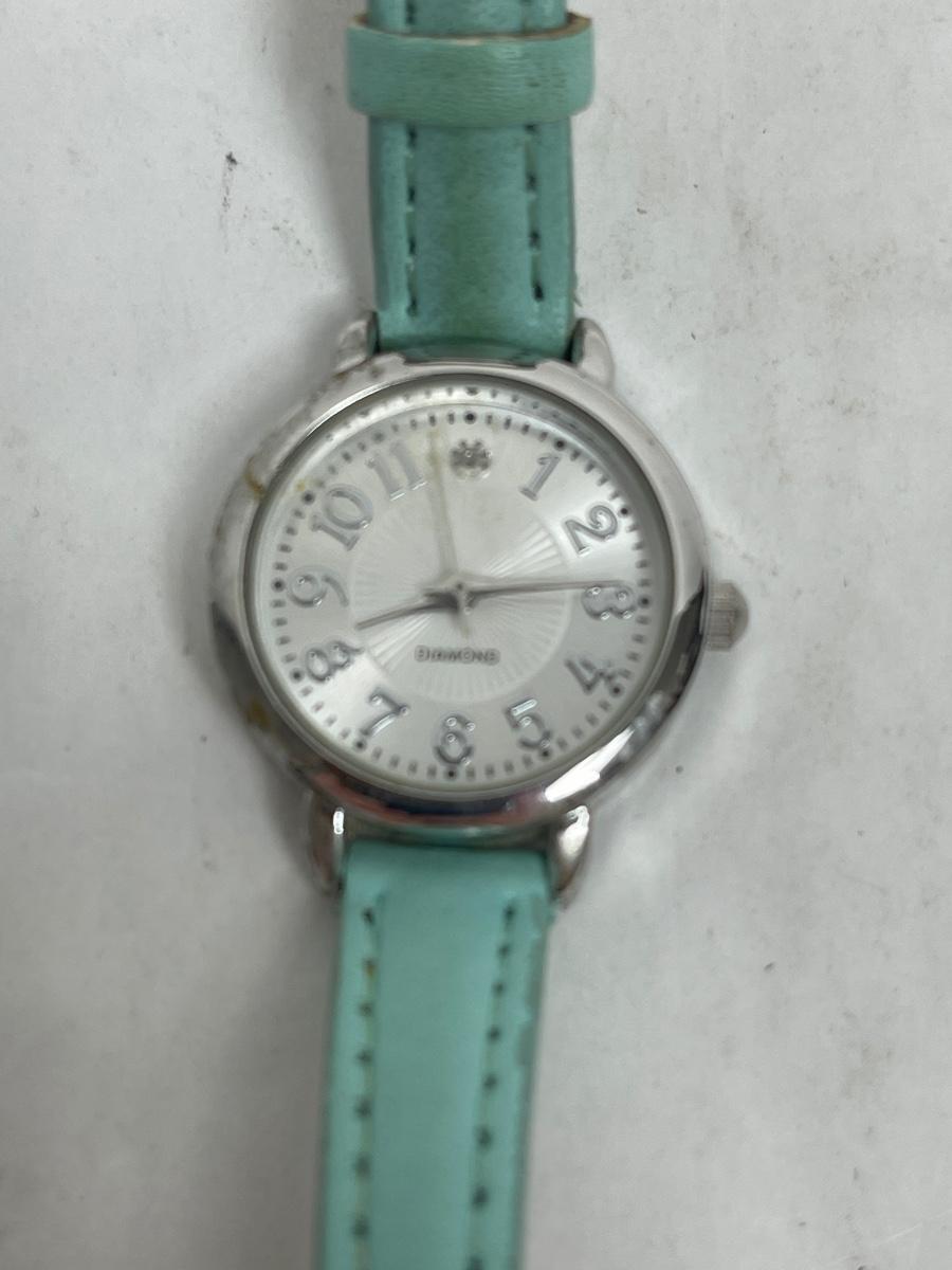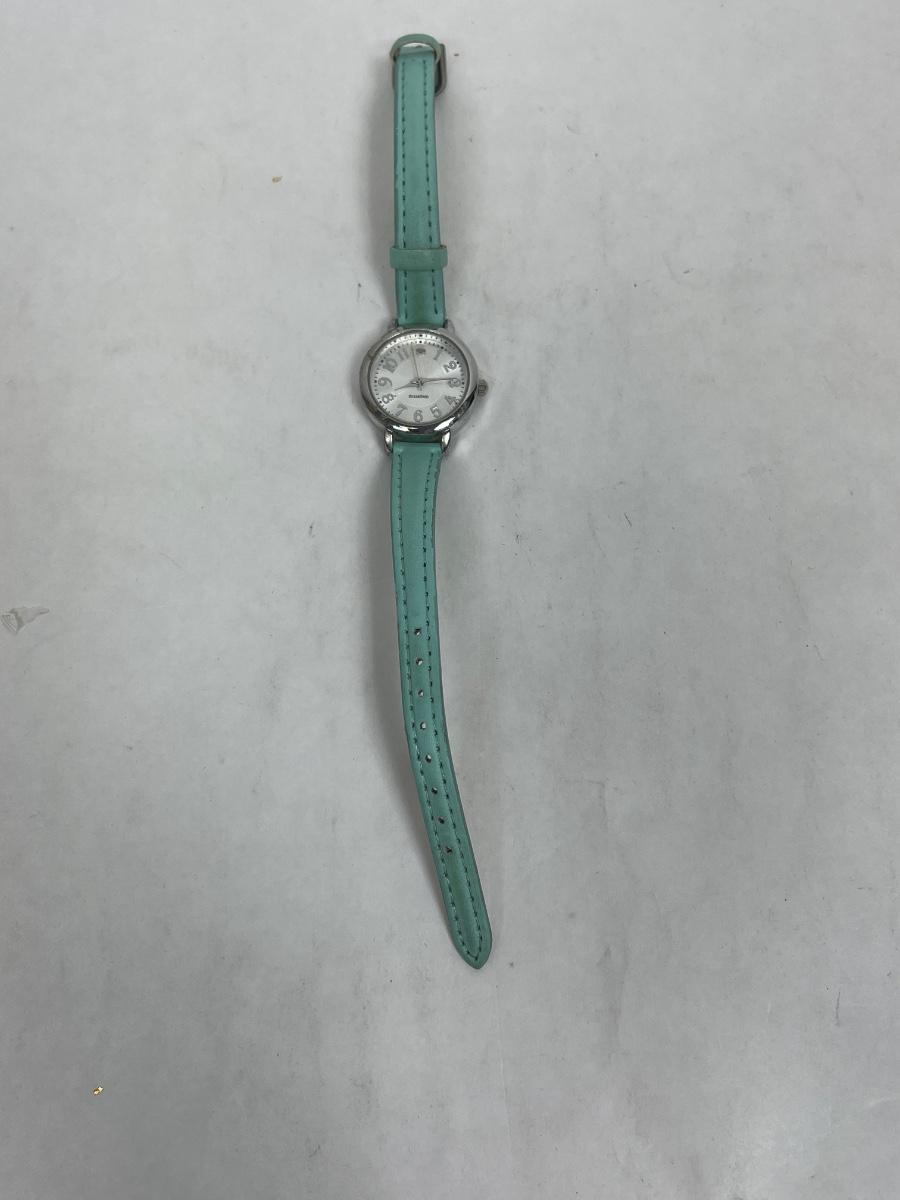 Turquoise Leather strap, silver tone dial.Clean crystal with no scratches. Most likely needs a new battery.