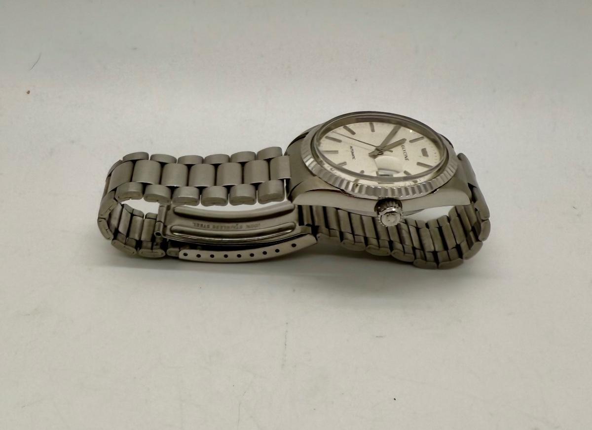 Nice working condition, Jubilee Style Band. Running, tested to confirm time and date can be adjusted and set. Nice Cherrywood box. From 2002. Case measures approx. 37mm (across the dial from 9 to 3) and approx. 42mm (top to bottom including the portion of the case where the watch band attaches).