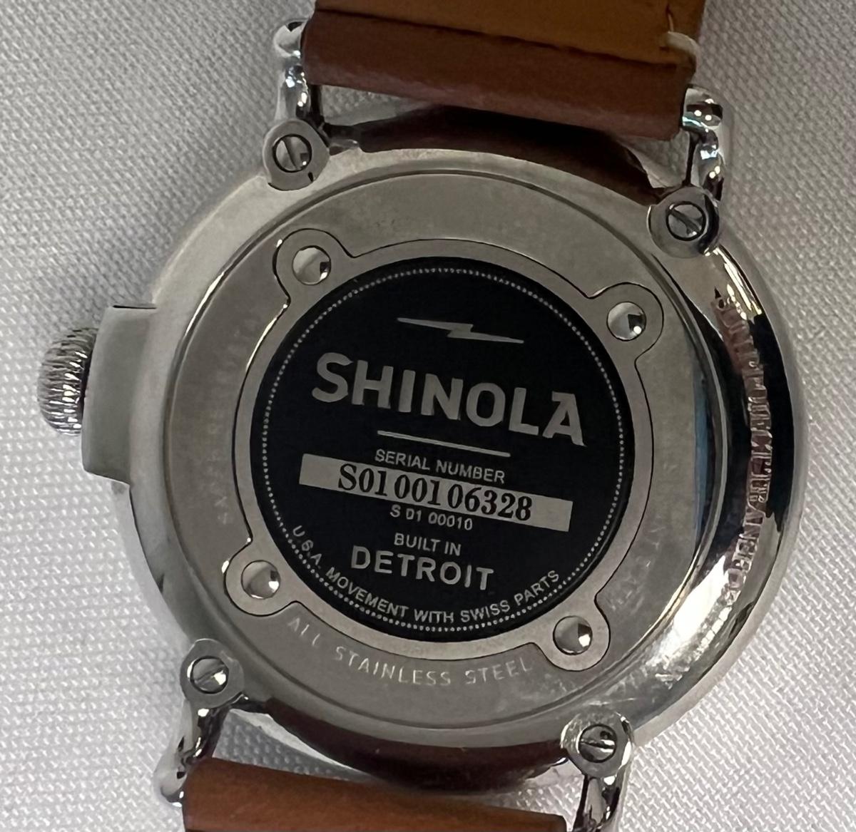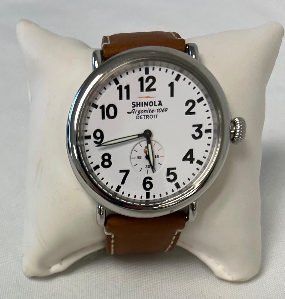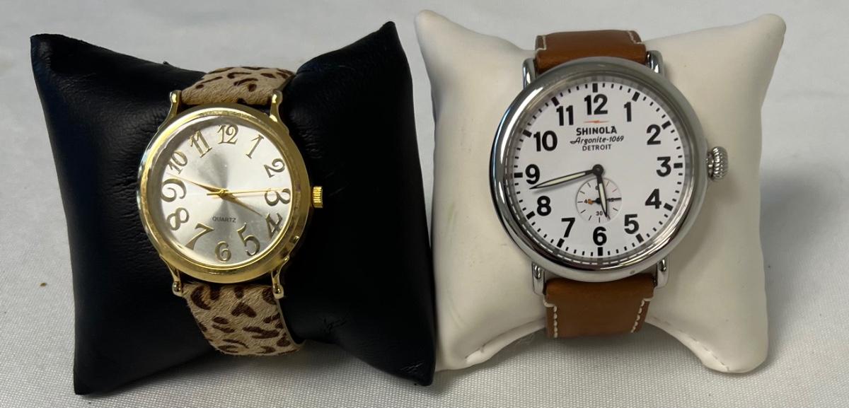 Pre-auction estimate: $200-400. Includes a ladies' large face Shinola Argonite 1069 watch, and a ladies' Chicos watch. Both are gently used. Total of 2 pieces. Not tested. Shipping dimensions: 6" x 6" x 4". [LA]