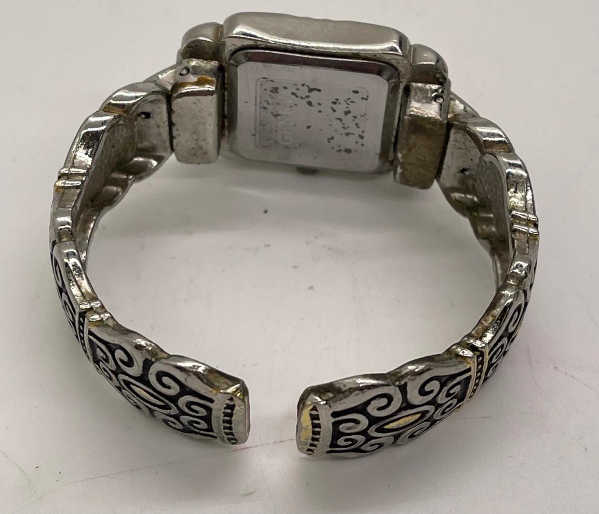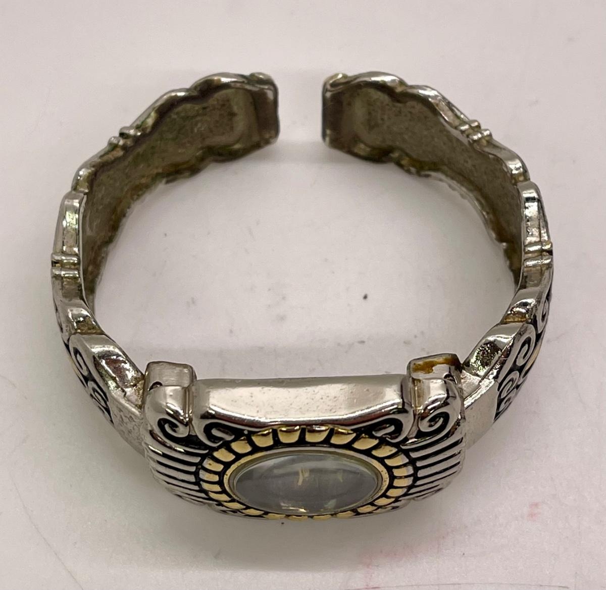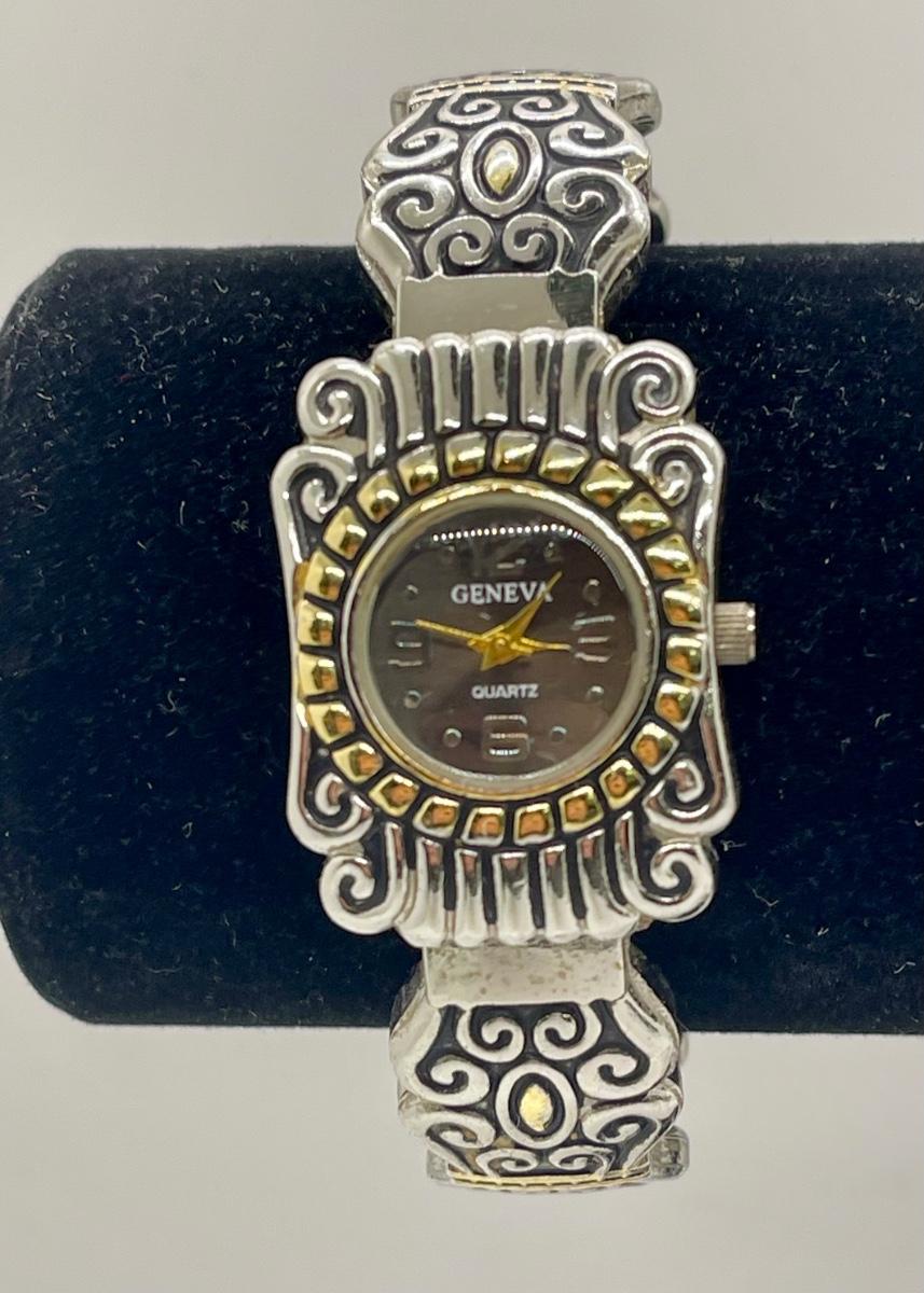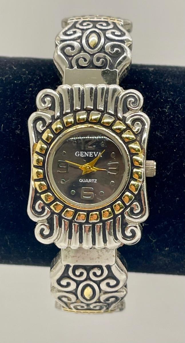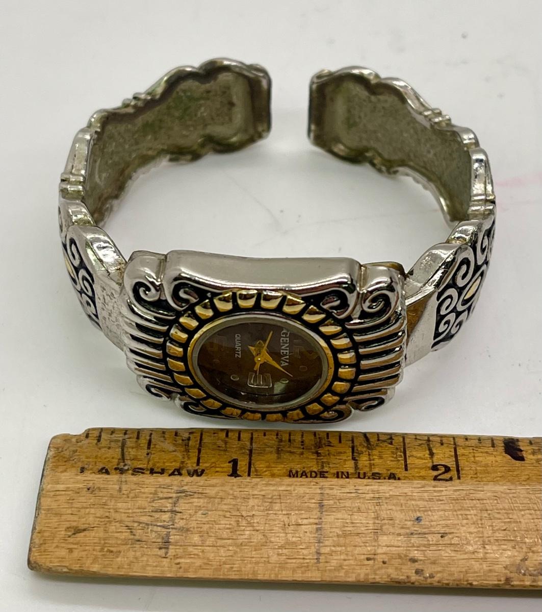 Bracelet style, silver tone with gold-tone highlights. Water resistant, quartz movement. Stem pulls out to allow hands to be set, clicks back in as expected. Most likely needs a new battery.