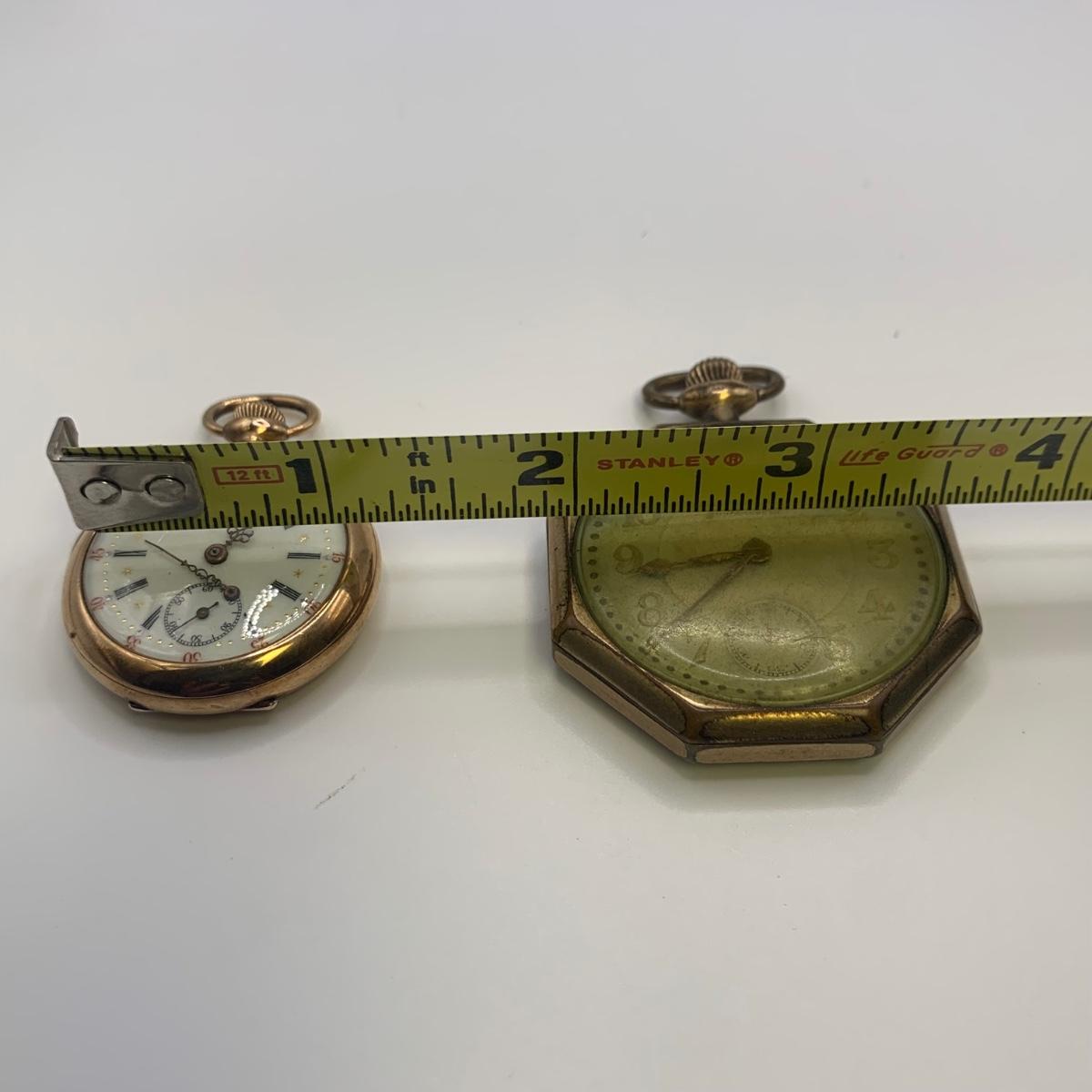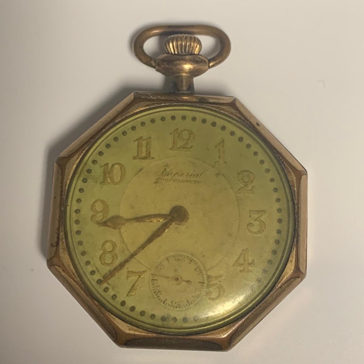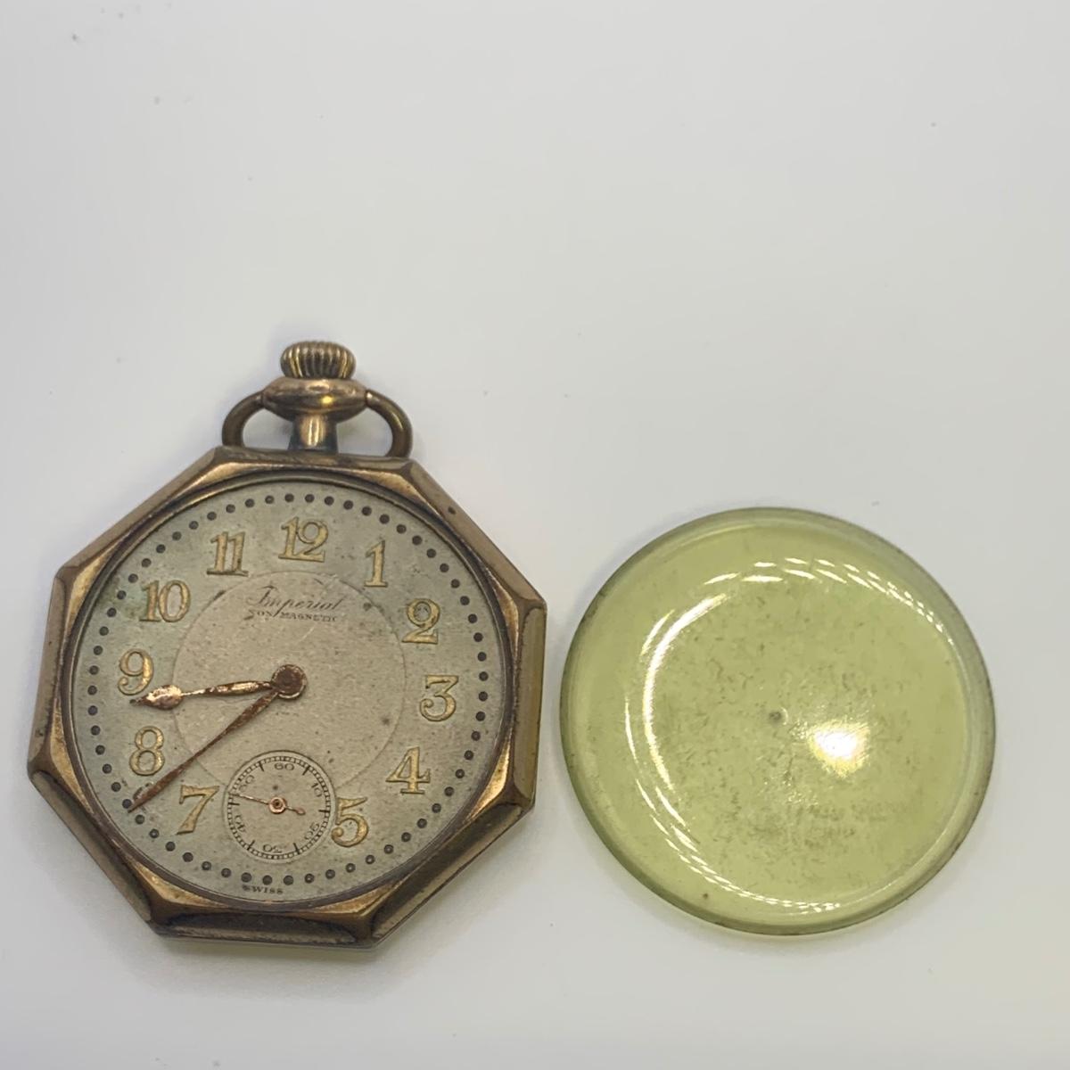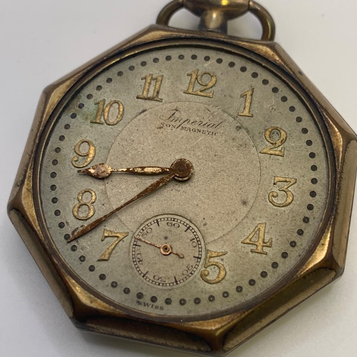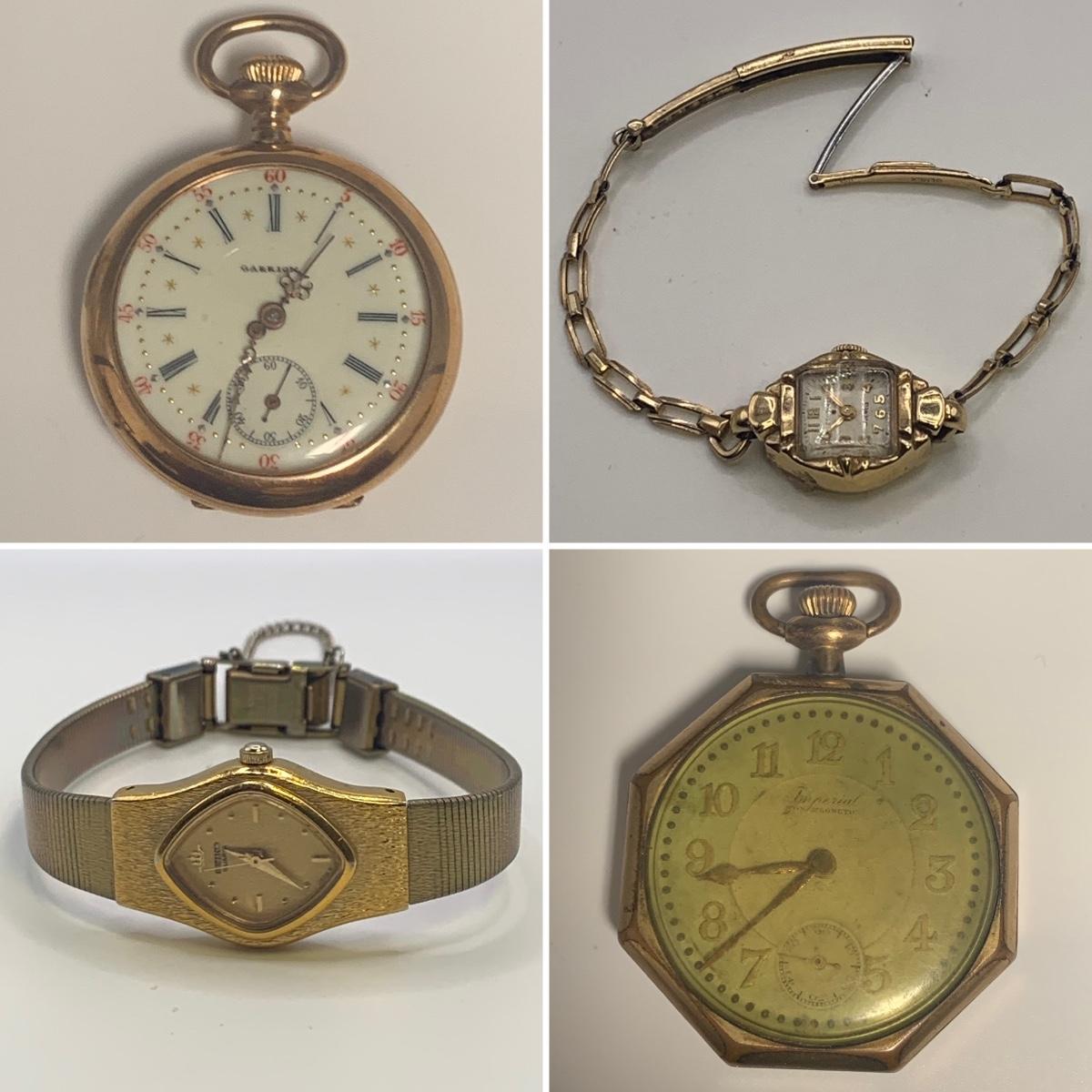 The Imperial stopwatch has a yellowed plastic face cover. There is wear on the metallic finish. The Garrick has one hand that has come loose. The second hand is currently functioning; you can see the gears move inside the back cover. None of the other items are currently working.