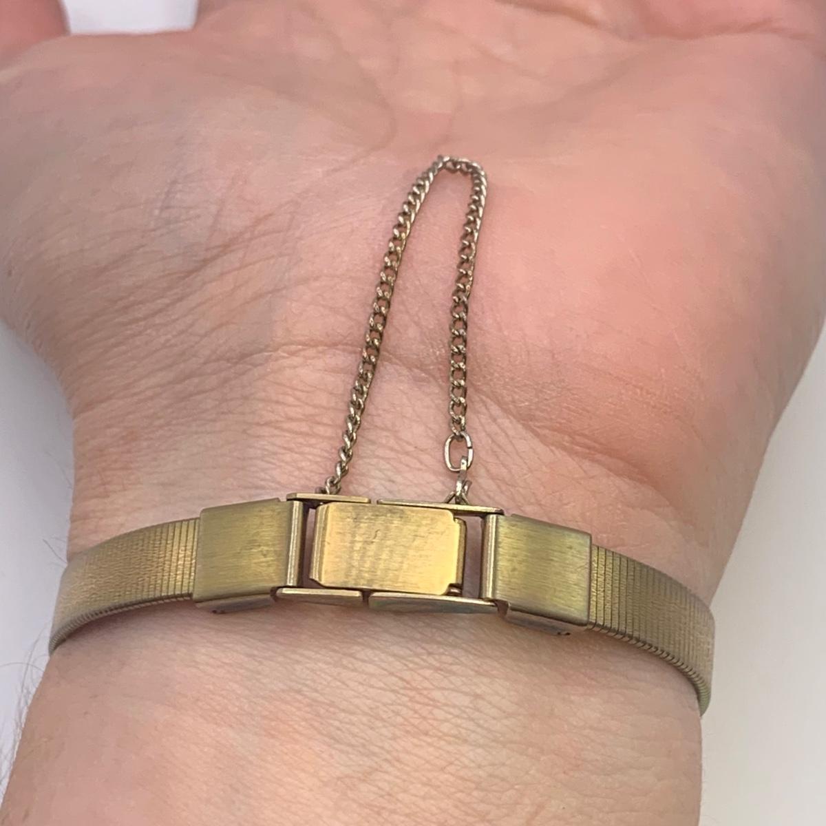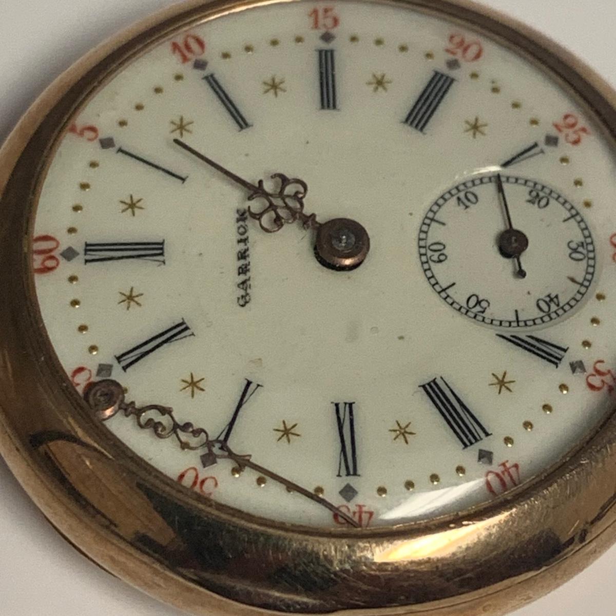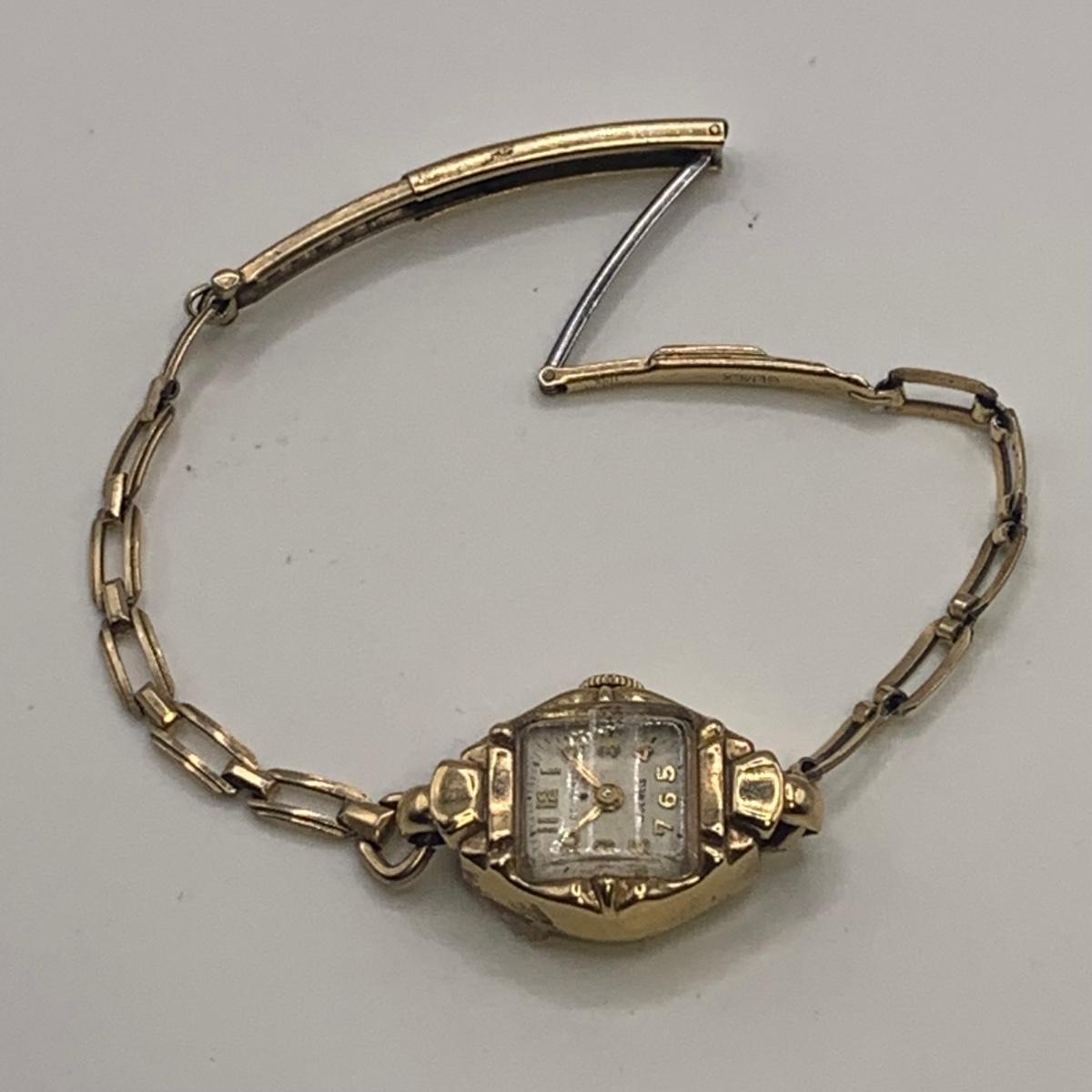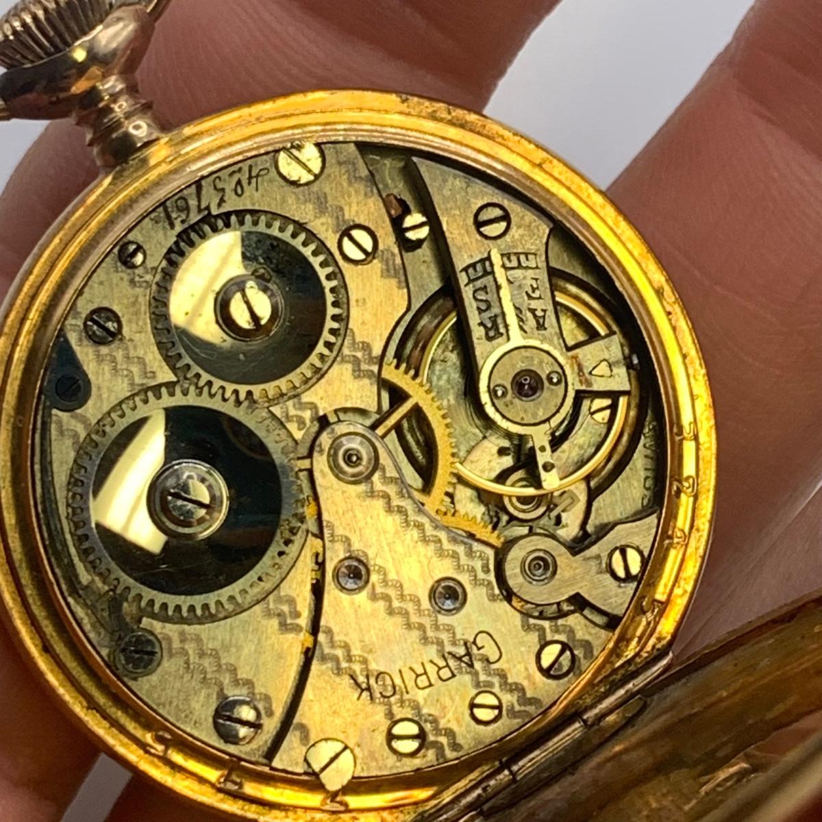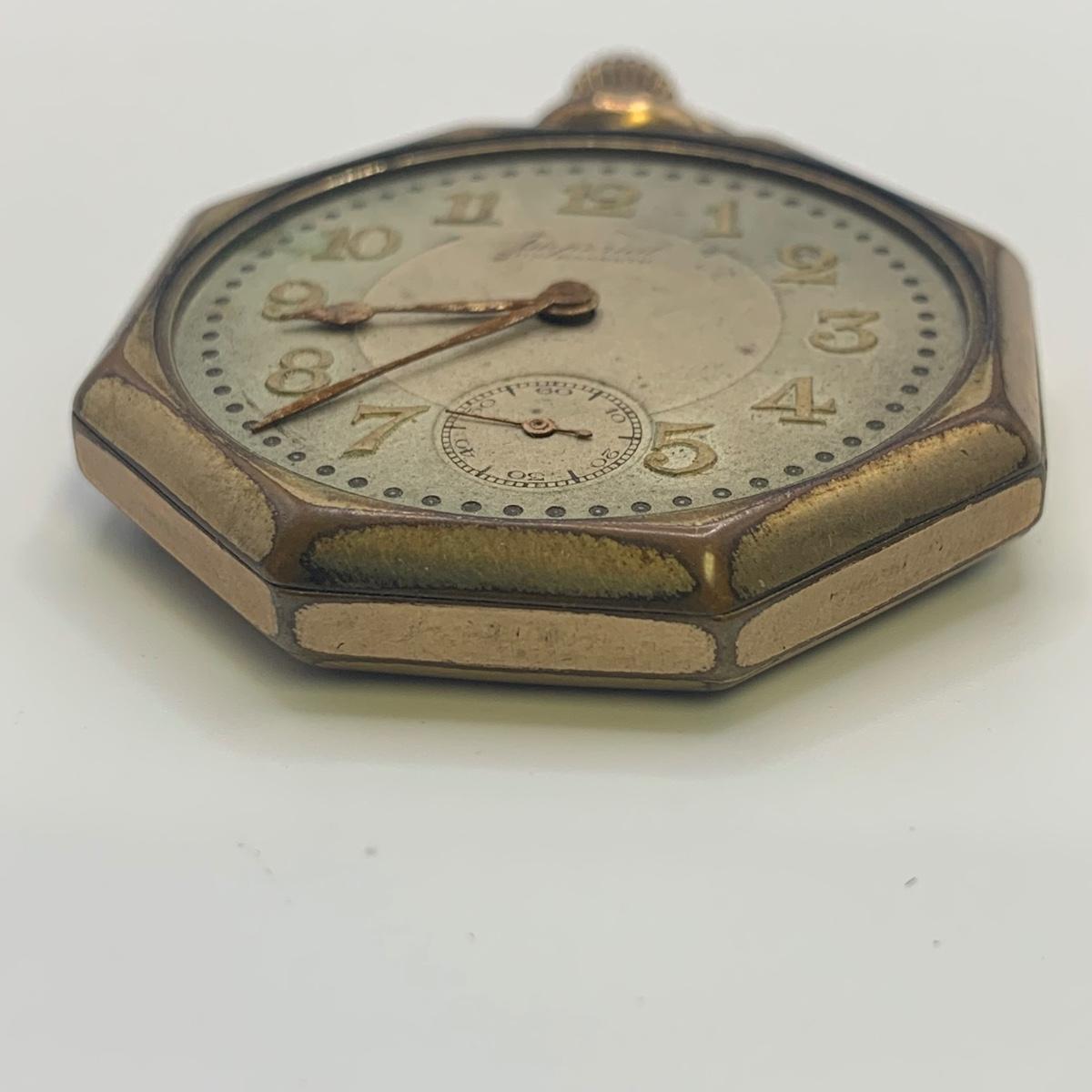 The Imperial stopwatch has a yellowed plastic face cover. There is wear on the metallic finish. The Garrick has one hand that has come loose. The second hand is currently functioning; you can see the gears move inside the back cover. None of the other items are currently working.