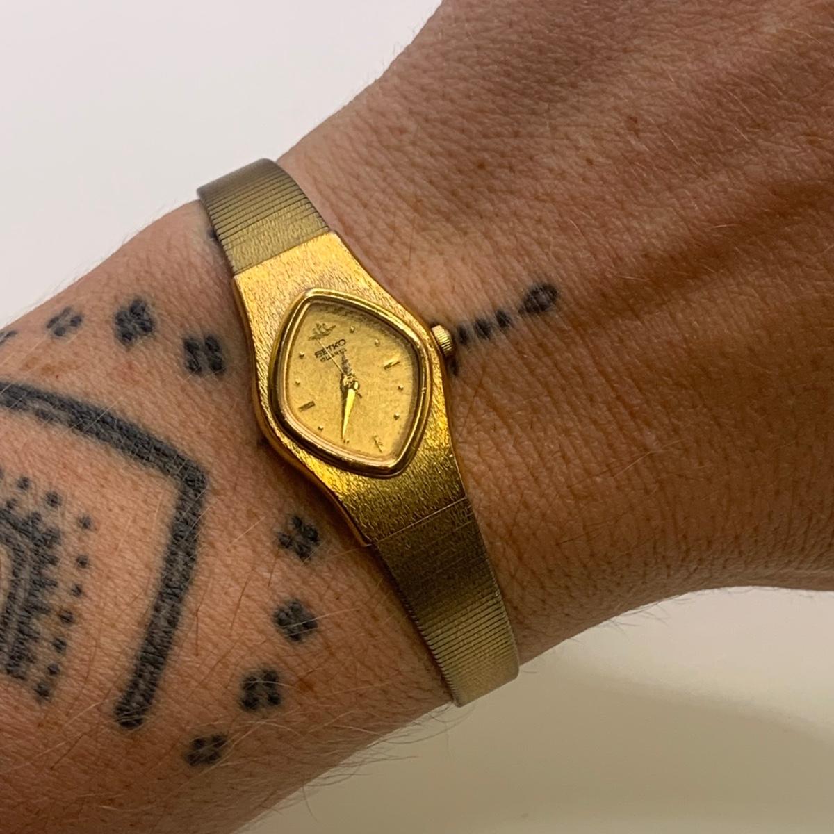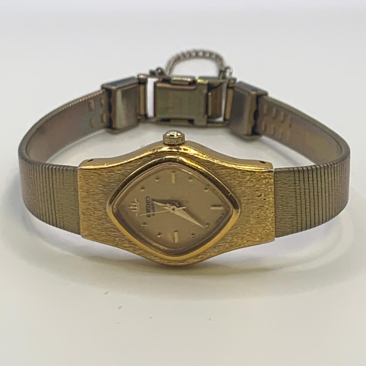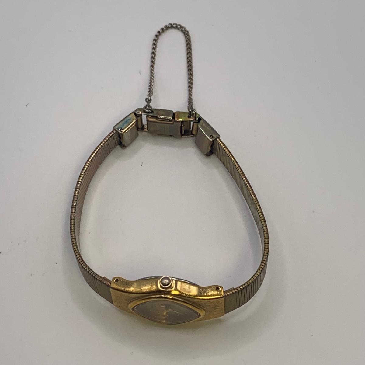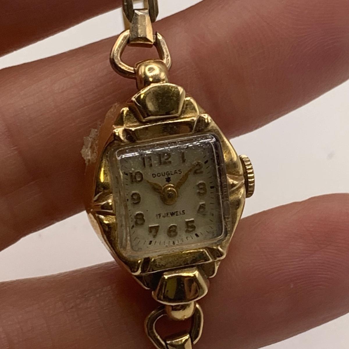 Two ladies watches and two stopwatches. One watch is a Seiko quartz. The other is a Douglas 17 Jewels. The clasp of the Douglas does not close and it has some tape on the back.