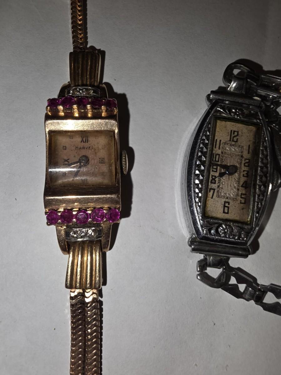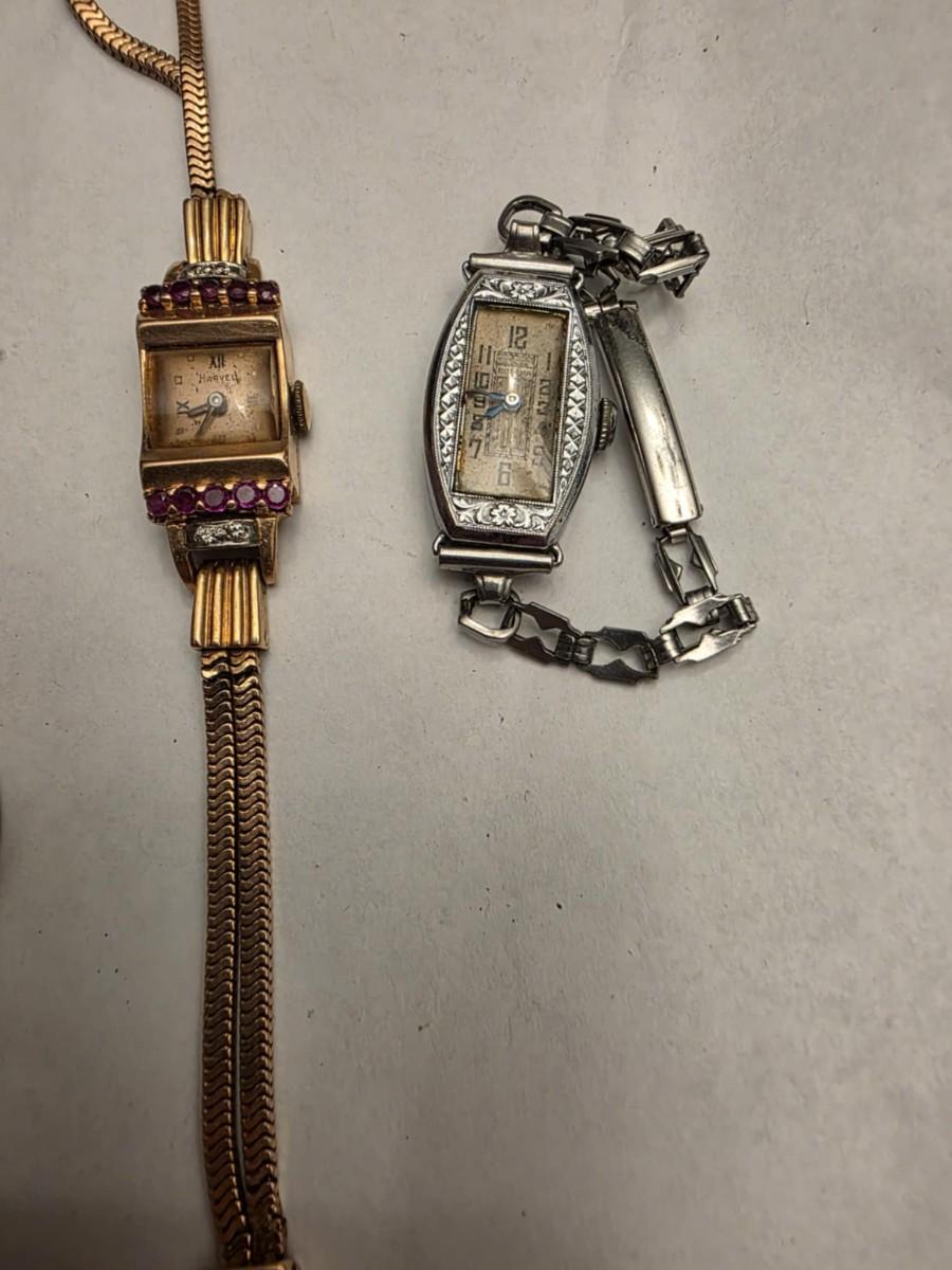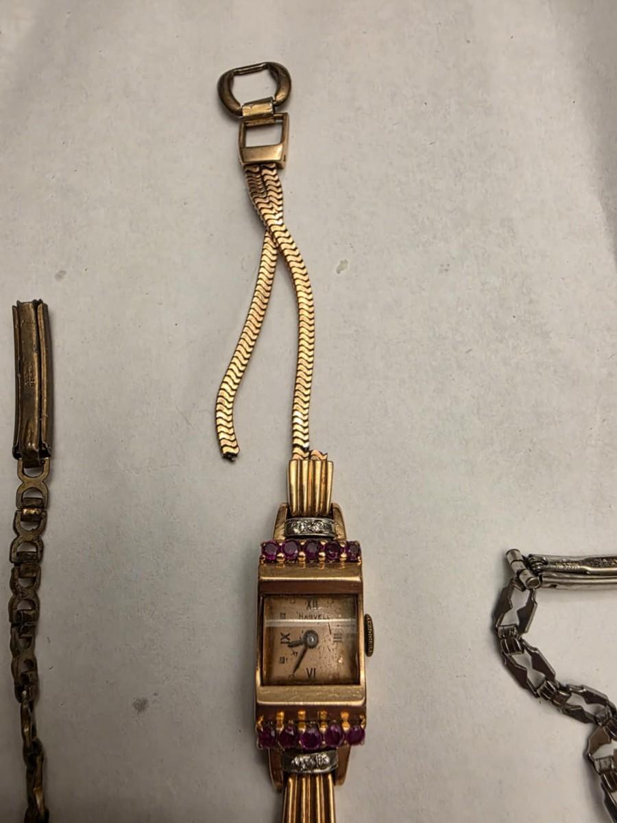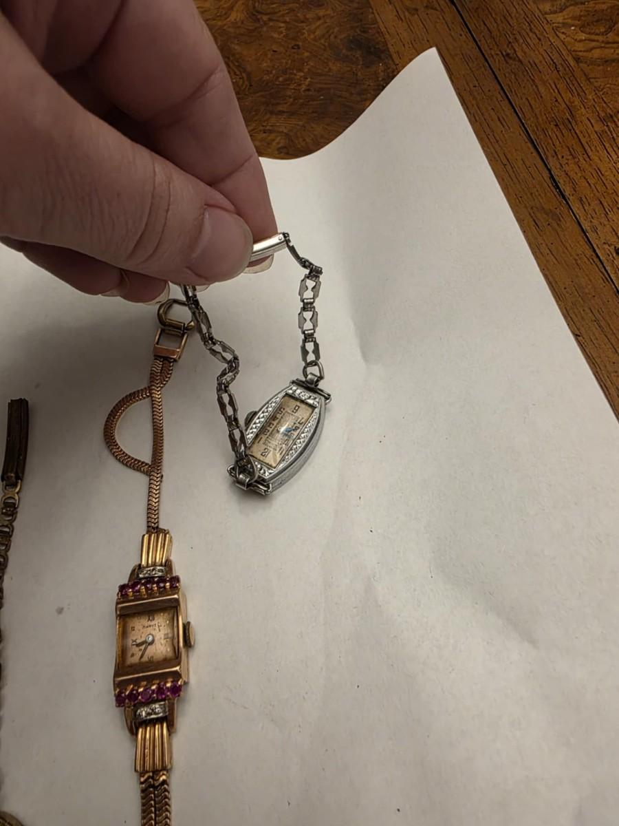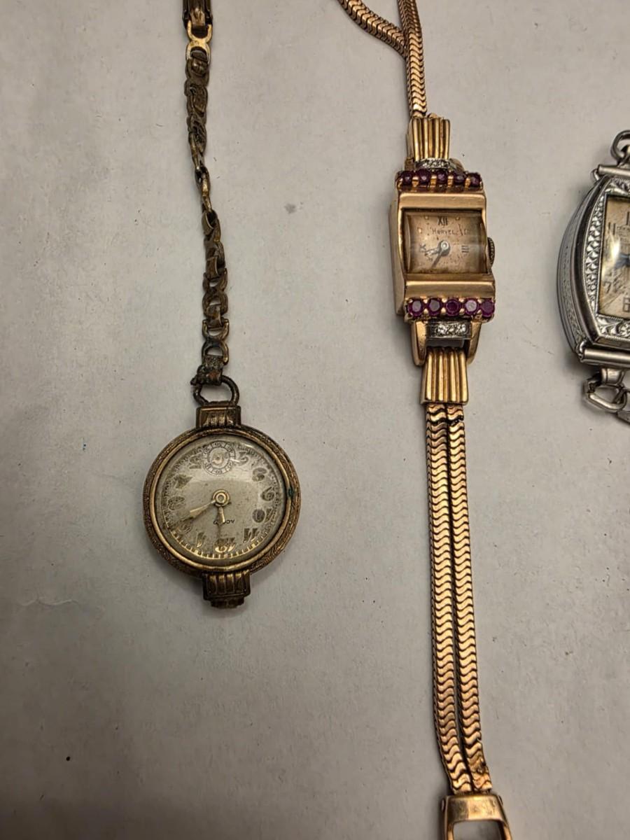 Three vintage watches. None are currently telling time. One is gold toned with red stones, One is silver toned and small, only about 4 inches of strand. One is on a chain pendant style but the chain is just a few inches long and looks like it should connect to a necklace.