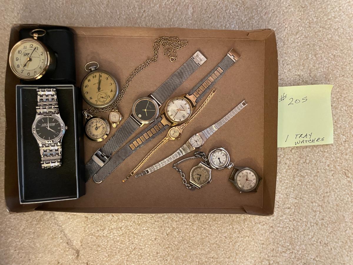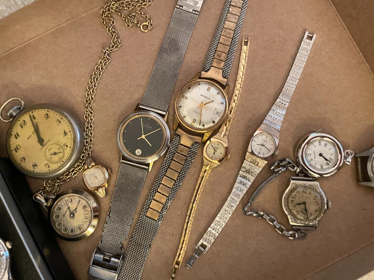1 Tray of 12 watches - wrist, pocket and necklace watches