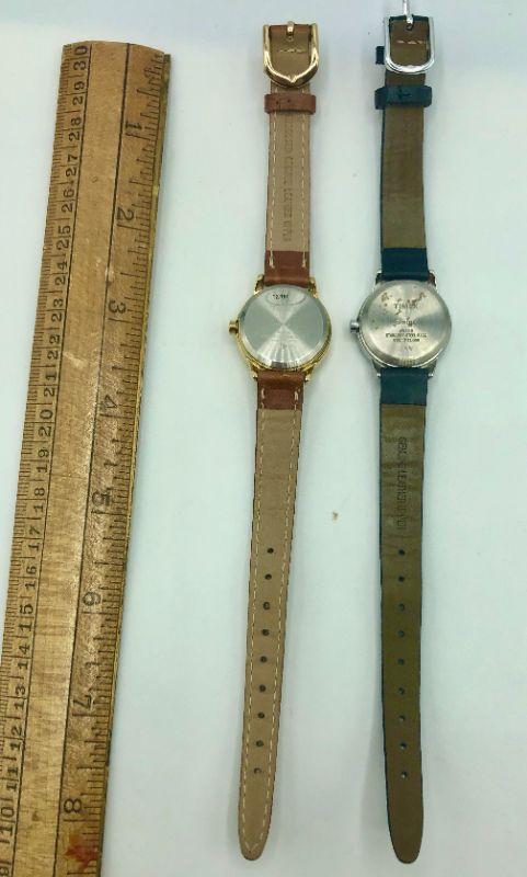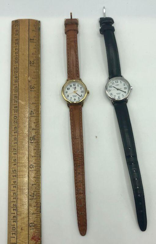 Pair of women’s Timex Indiglo watches. Leather straps. White-faced dials.