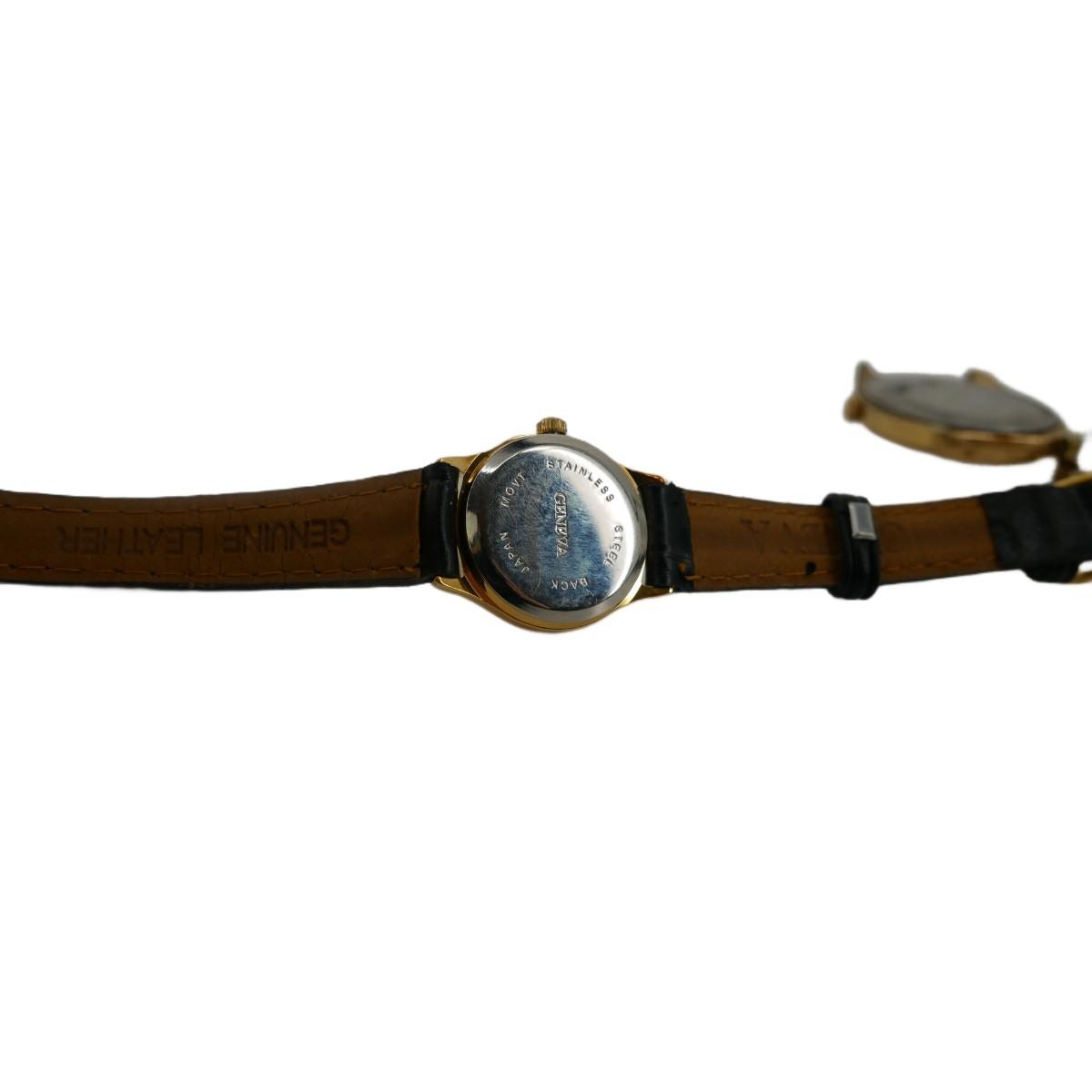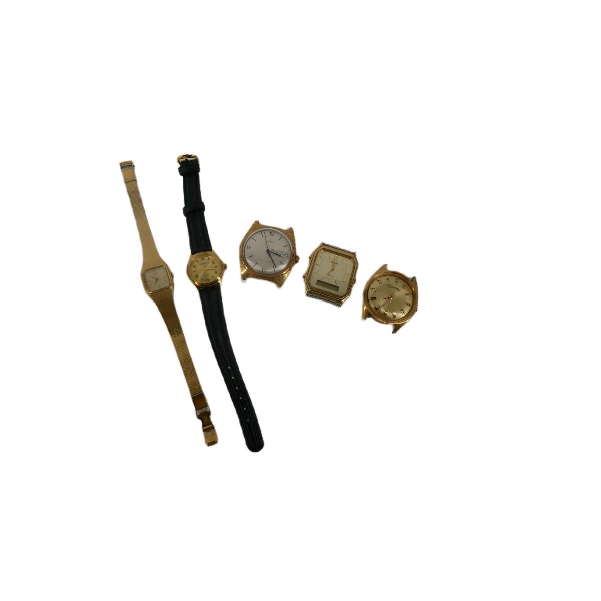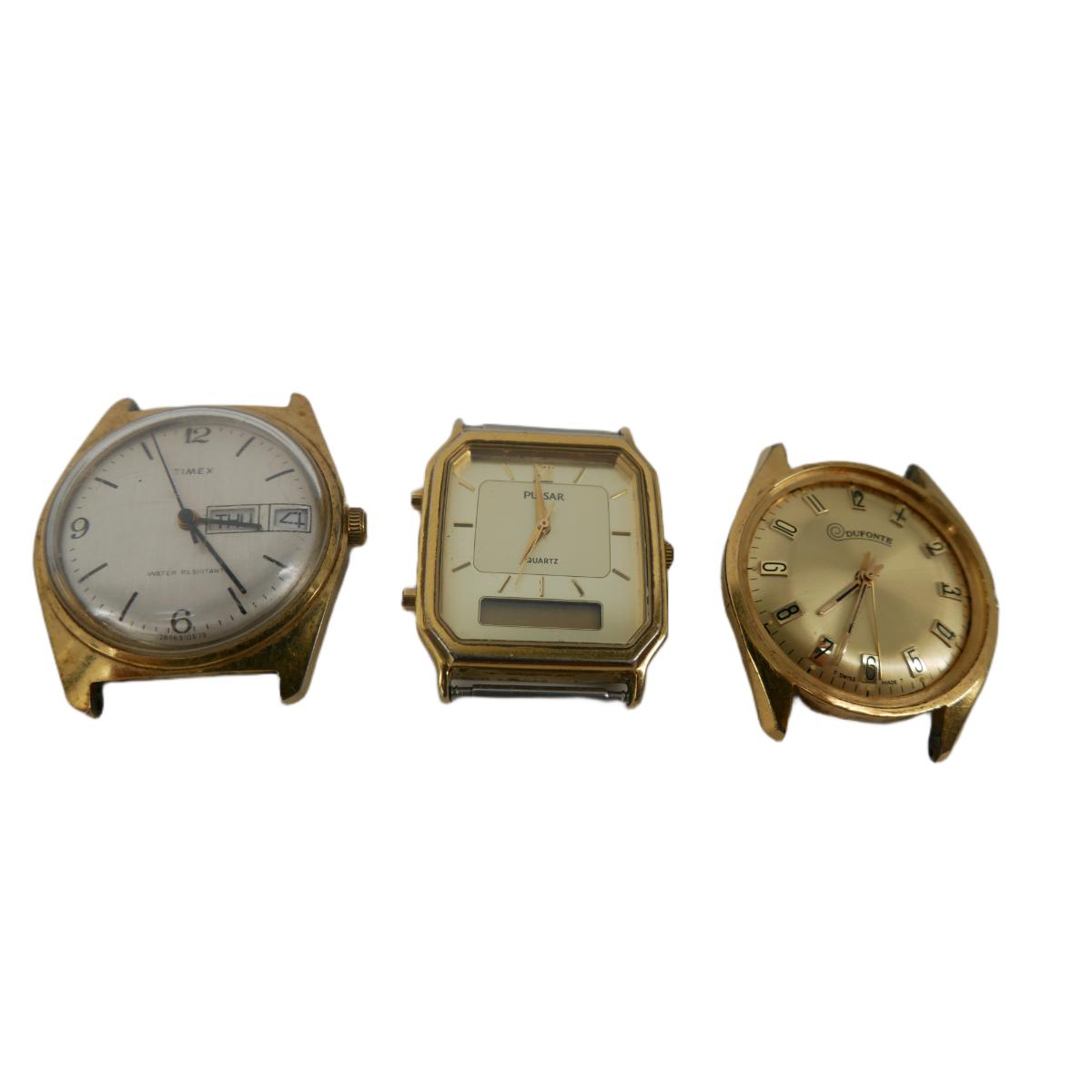 Various watches and faces. Seiko watch is 6" long with a 15mm face. Geneva watch is 7.5" long with a 25mm face. Timex face is 35mm, Dufonte face is 38mm and does not have glass, Pulsar electronic face is 30mm. Lot weighs 4 oz. All are in used, non-operational condition. (J9)