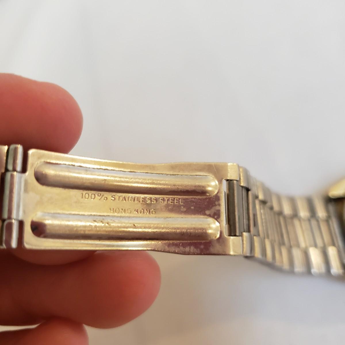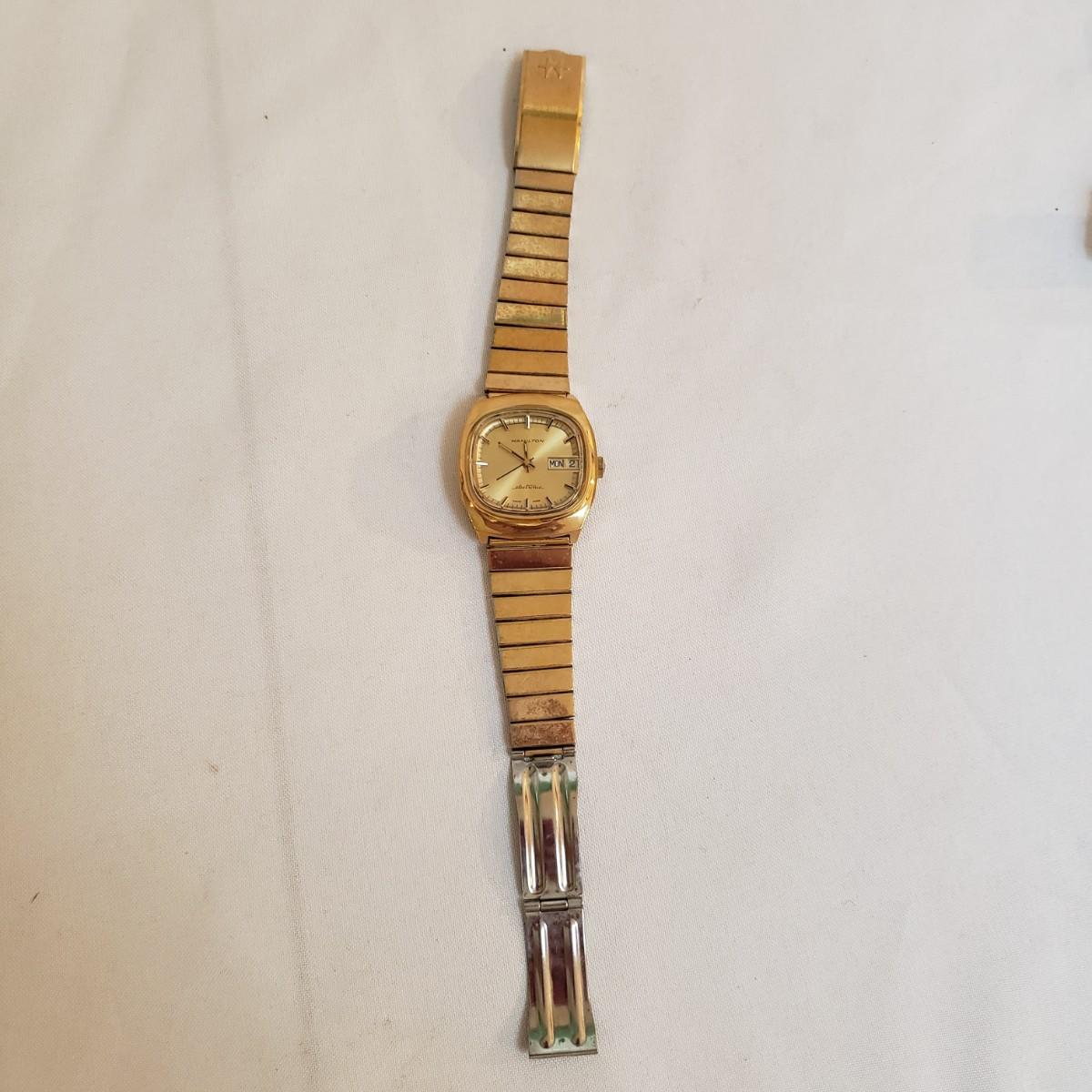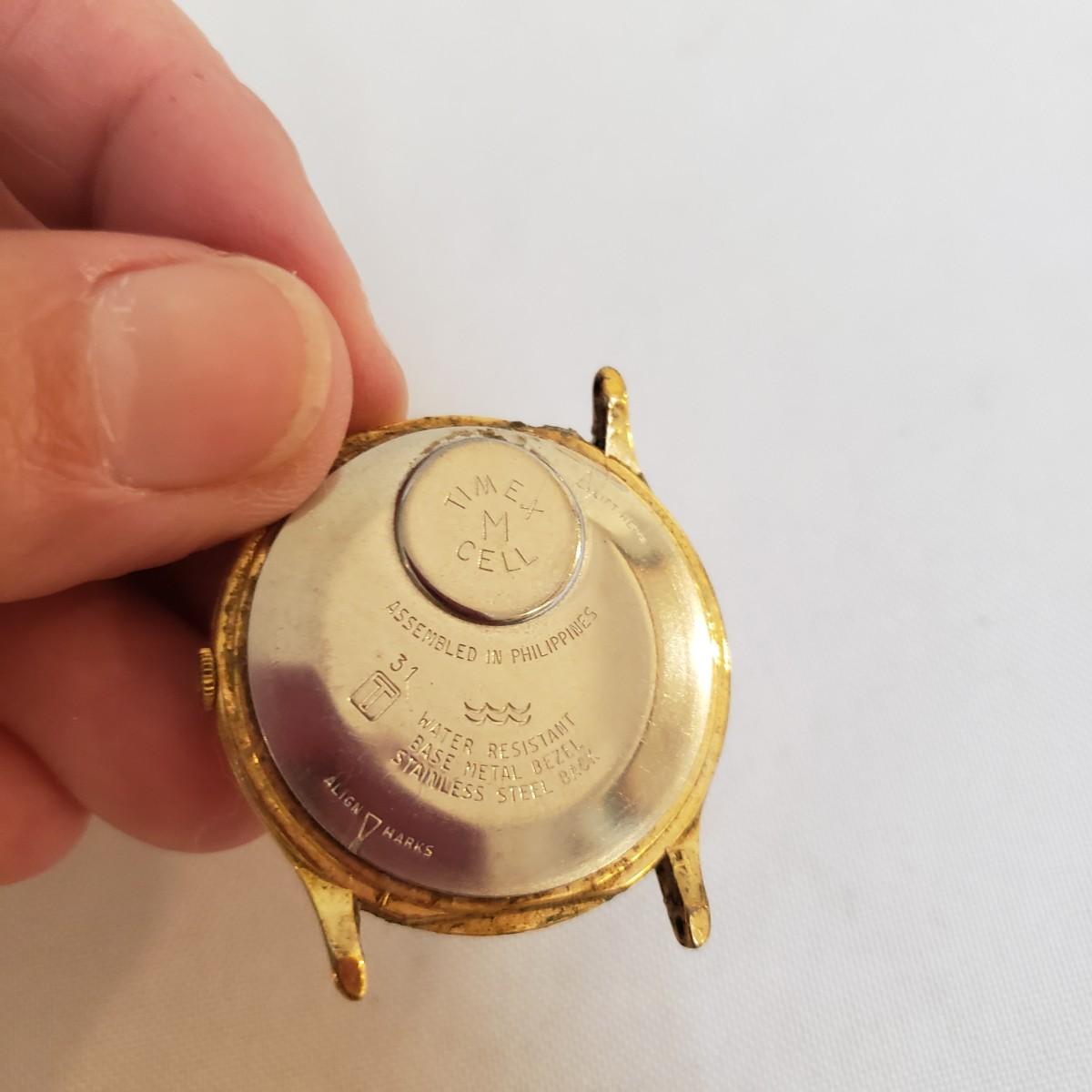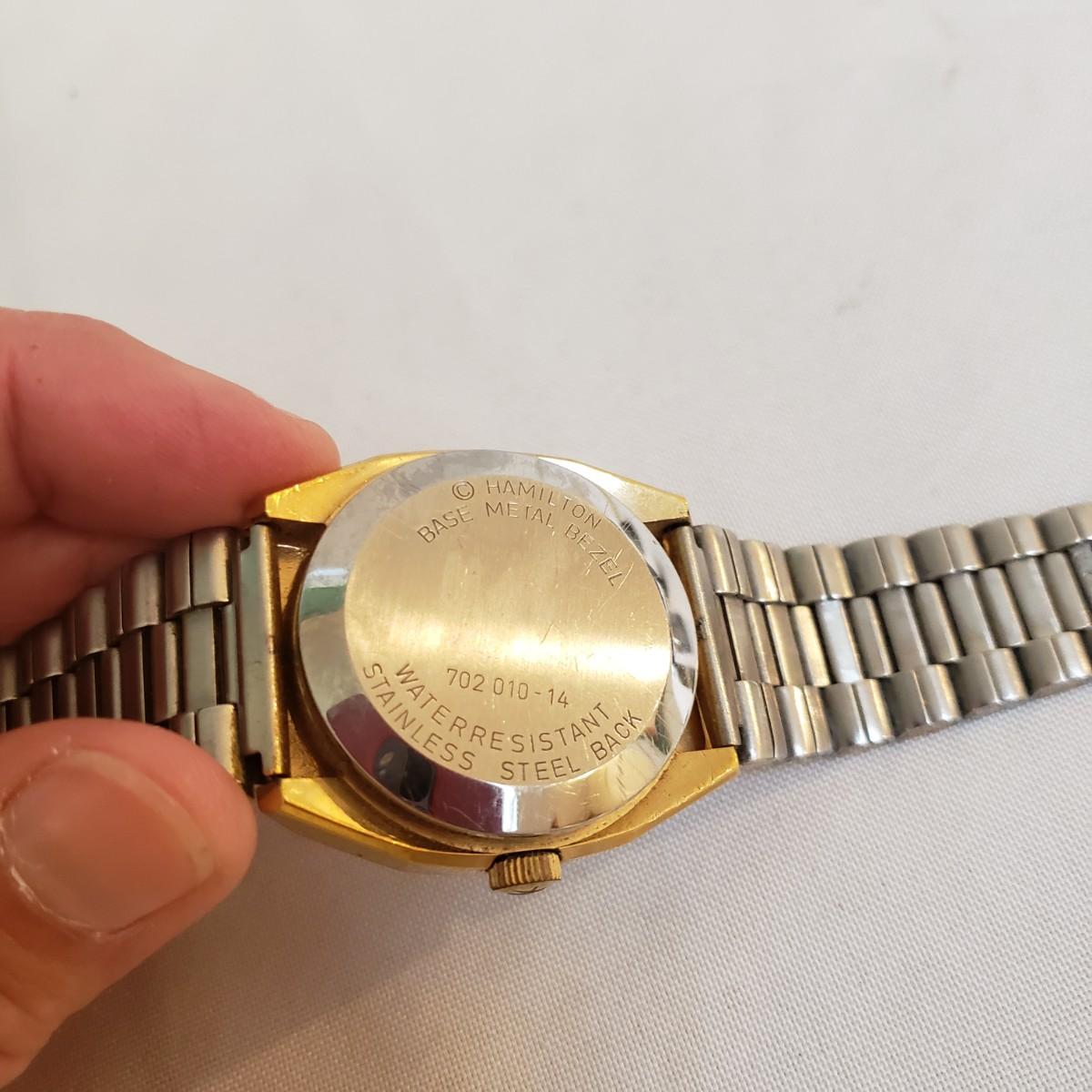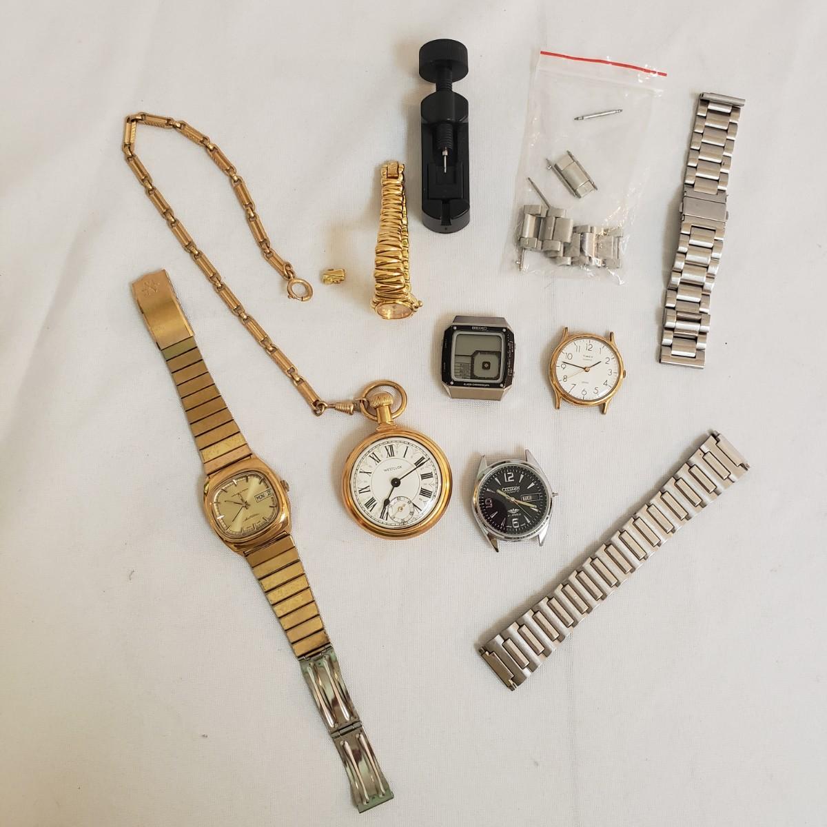 The Citizen automatic clock face has a stainless steel back. The gold style Timex and the Seiko digital watch face say that they are water resistant, see picture for details. The women's gold style Elgin watch measures 7" and comes with an extra link. The men's Hamilton gold style watch measures 7" and has "stainless steel" stamped on the band. Next, is a link remover tool and finally a Westclox pocket watch with a chain. There is an engraved train on the back of the pocket watch. The back does not open, as in some pocket watches. None of the watches are currently working.