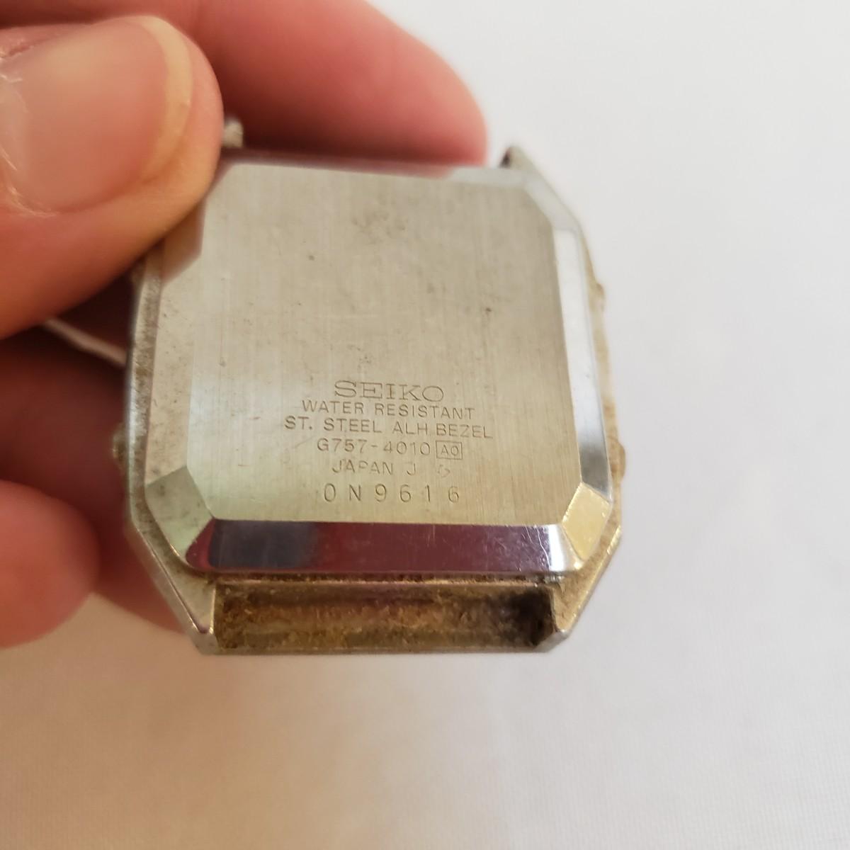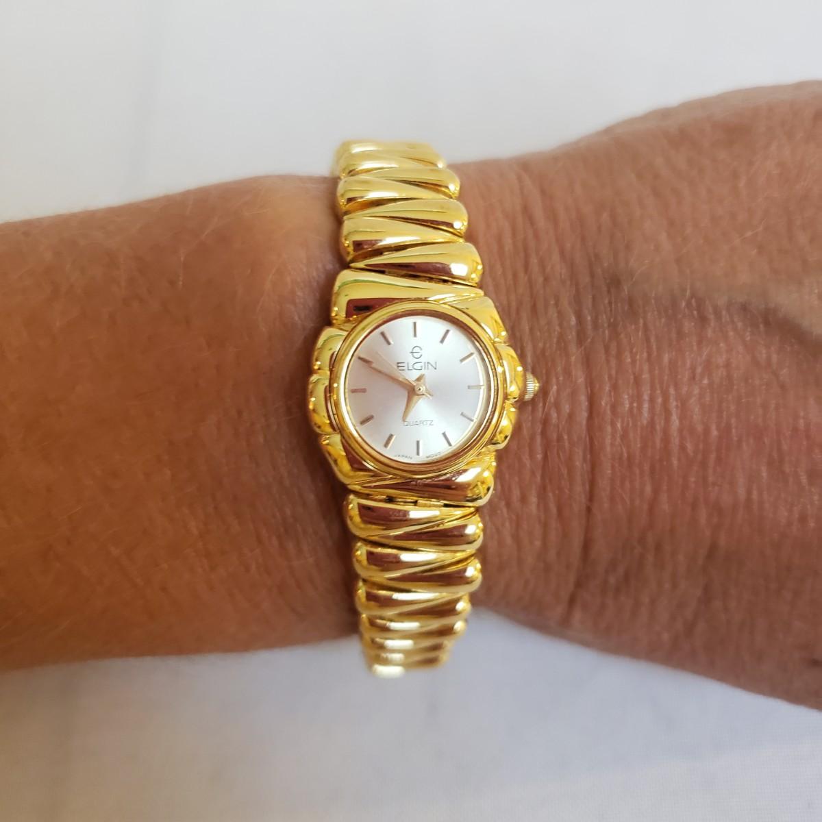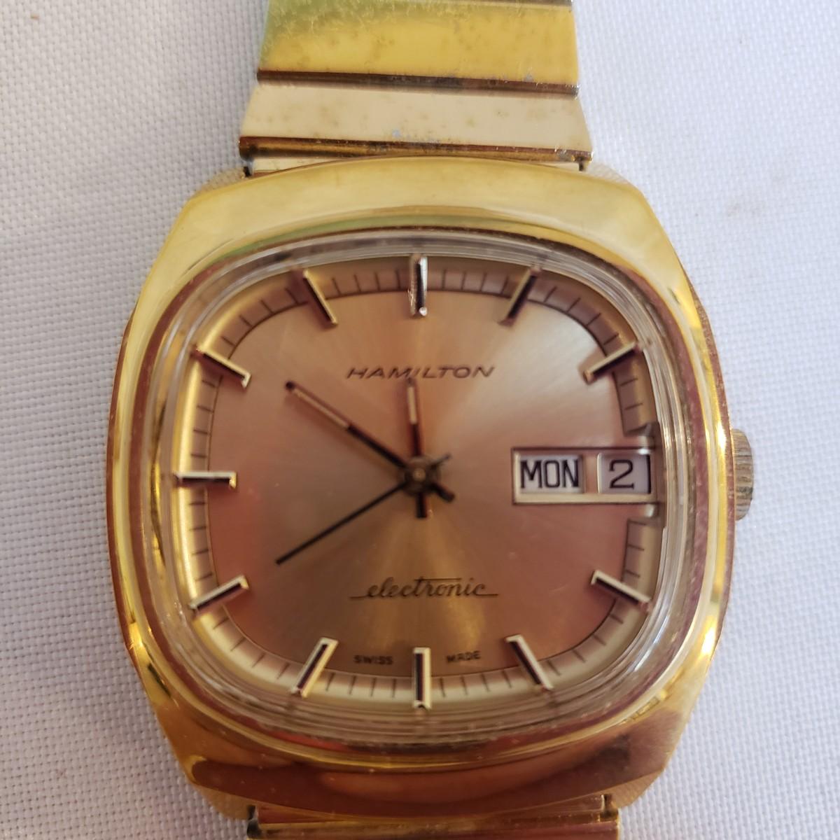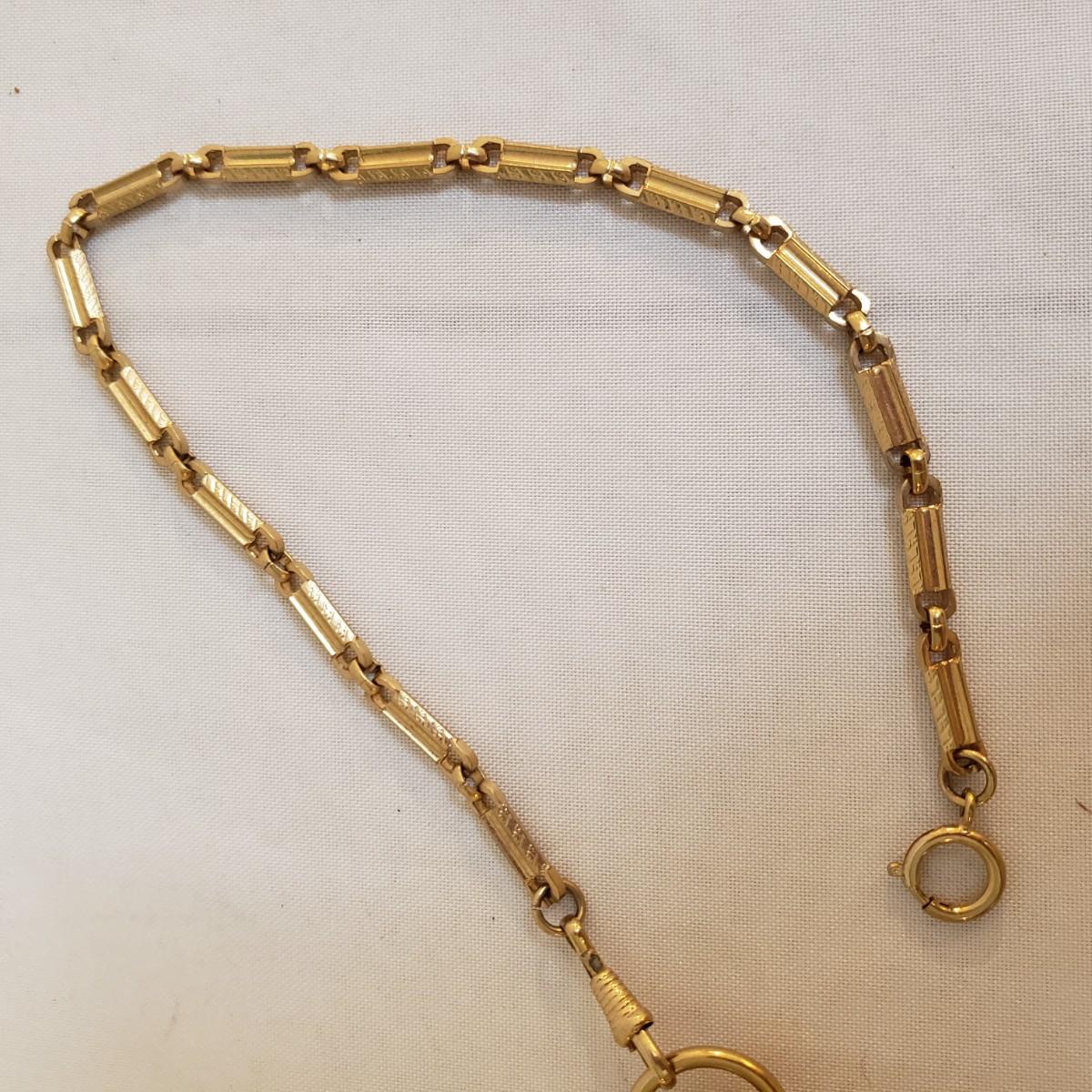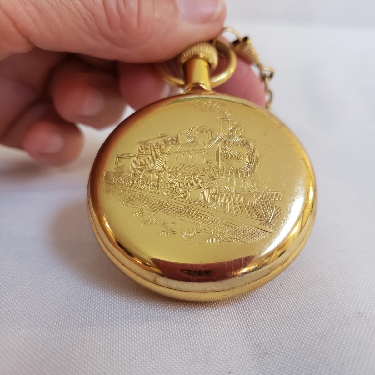 The Citizen automatic clock face has a stainless steel back. The gold style Timex and the Seiko digital watch face say that they are water resistant, see picture for details. The women's gold style Elgin watch measures 7" and comes with an extra link. The men's Hamilton gold style watch measures 7" and has "stainless steel" stamped on the band. Next, is a link remover tool and finally a Westclox pocket watch with a chain. There is an engraved train on the back of the pocket watch. The back does not open, as in some pocket watches. None of the watches are currently working.