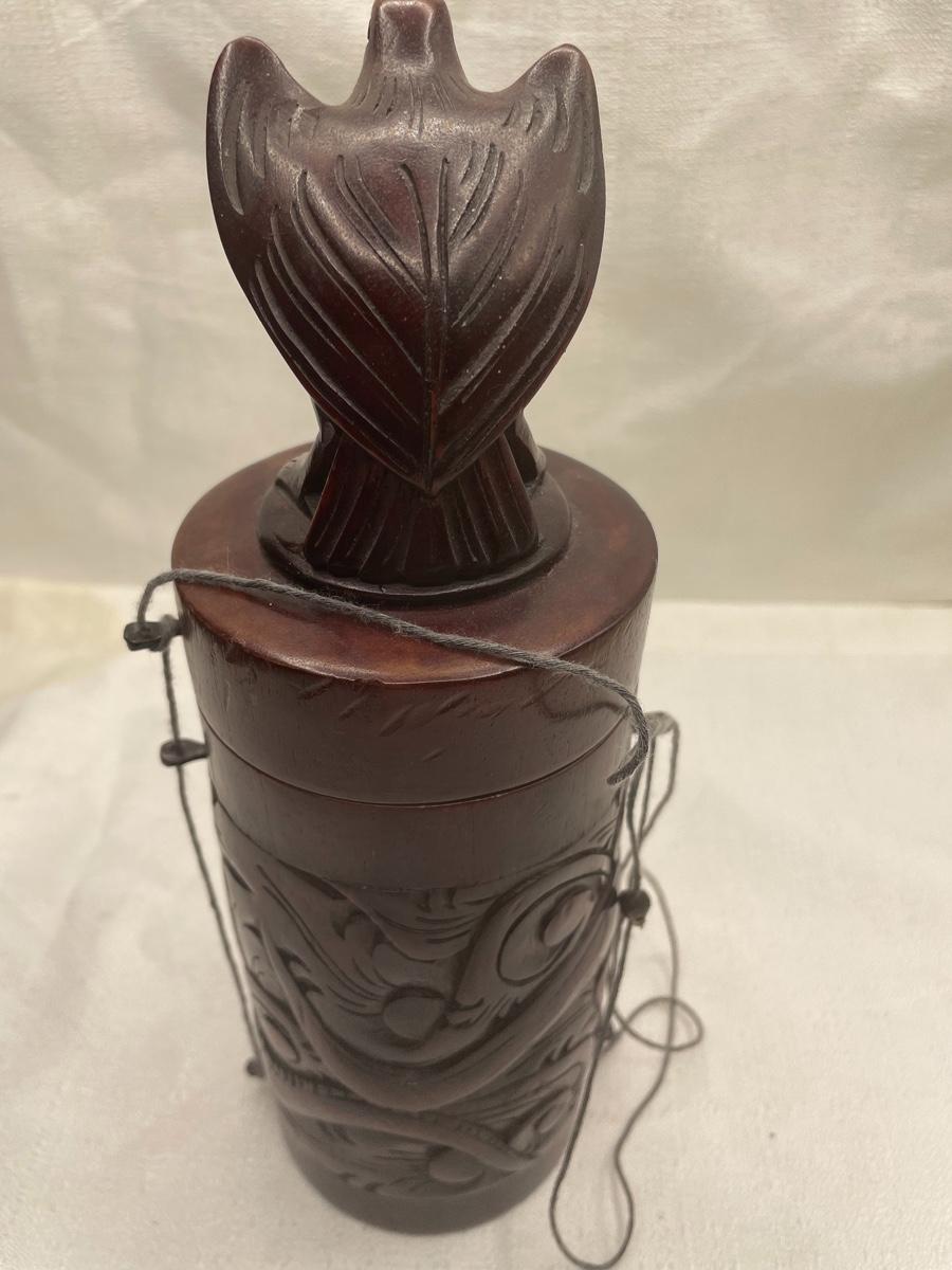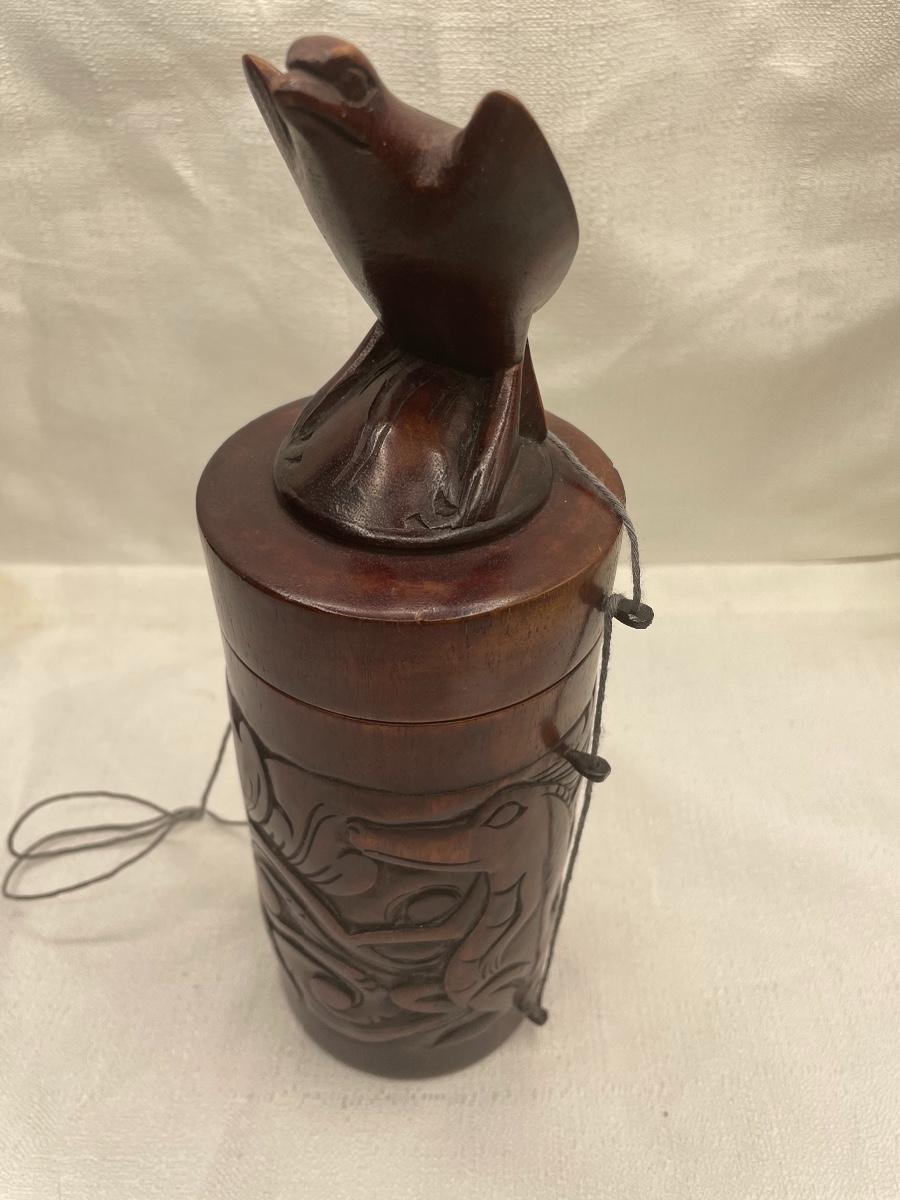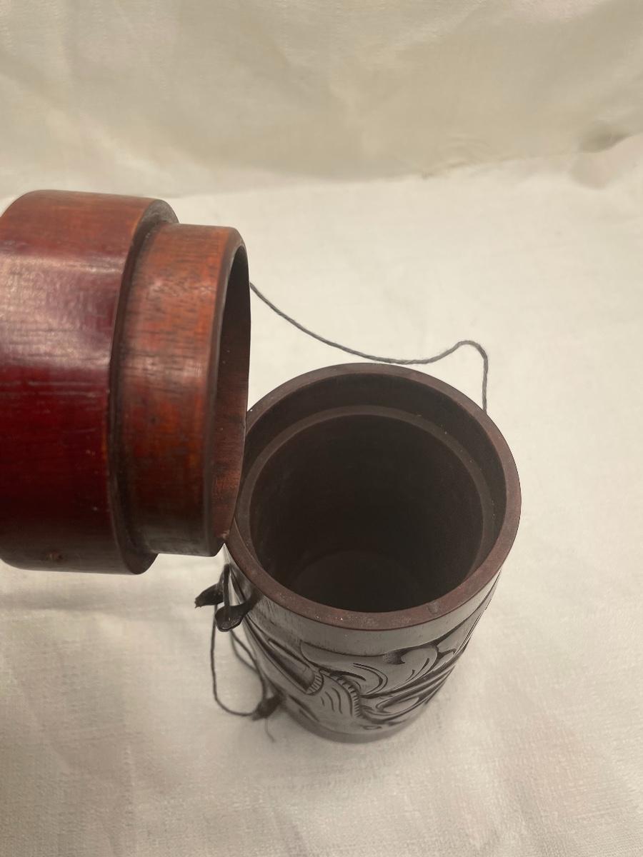 Beautifully crafted container. Could it be a travel tea/tobacco container? Use it as you wish!