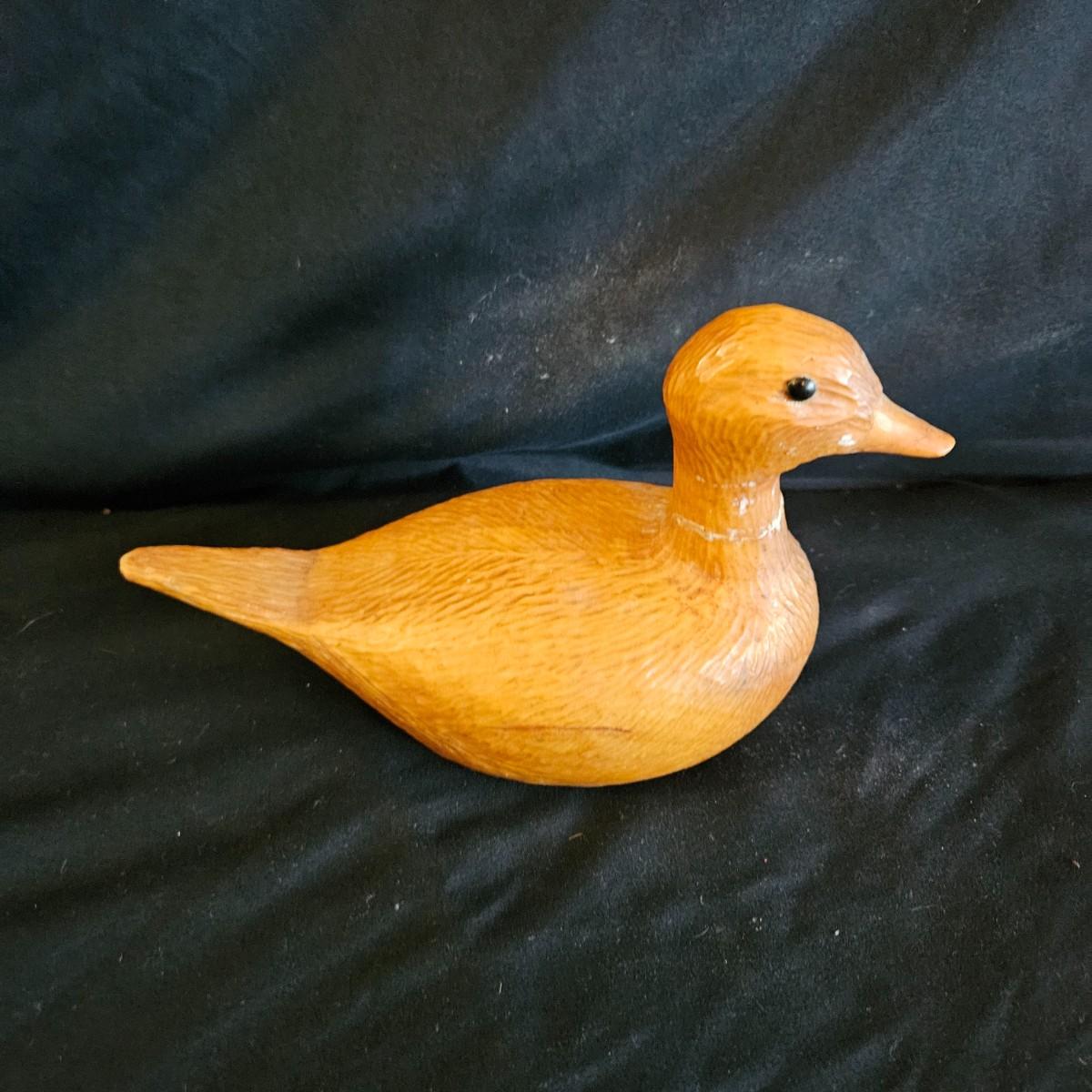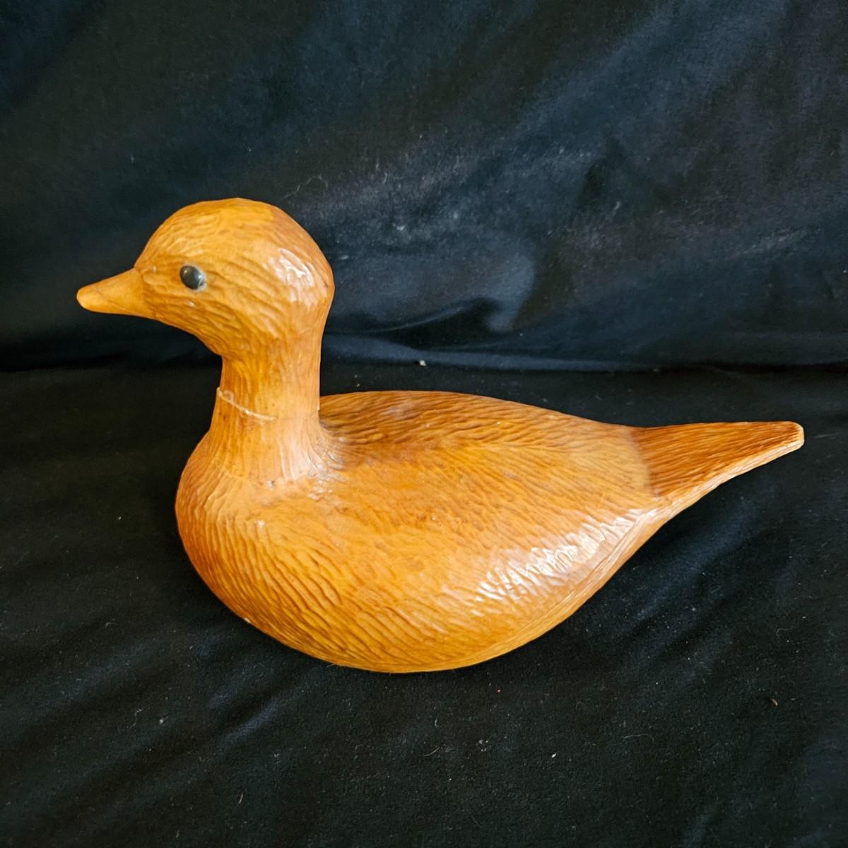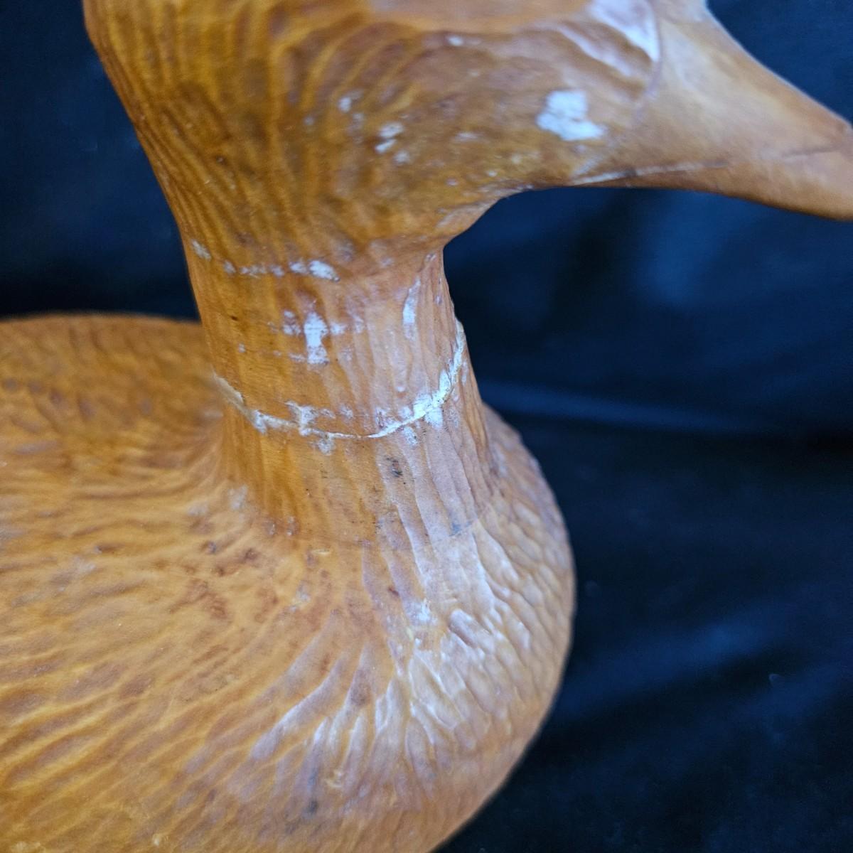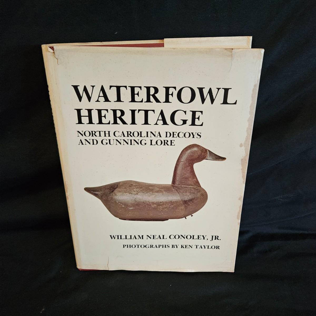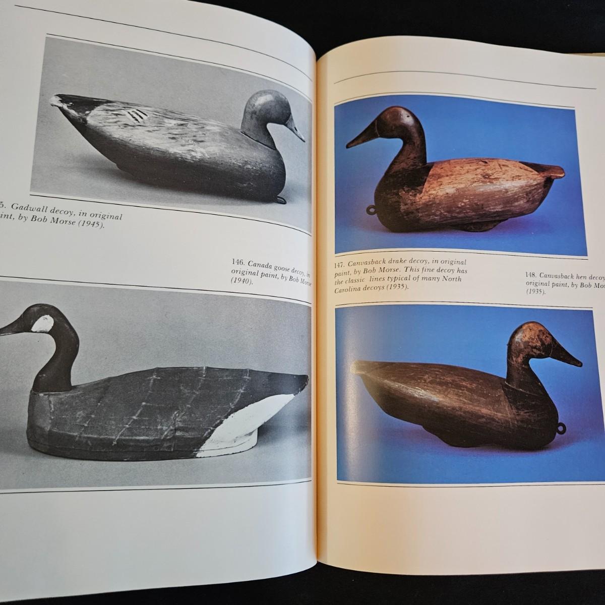A collection of five water fowl decoys and a book on North Carolina water fowl. Included is two larger wooden decoys, the larger rough carved one measures approximately 17" x 6.5" x 8"H. There are two smaller decoys and the unpainted one appears to have had its head repaired. The smaller piece is made of metal. Shipping available