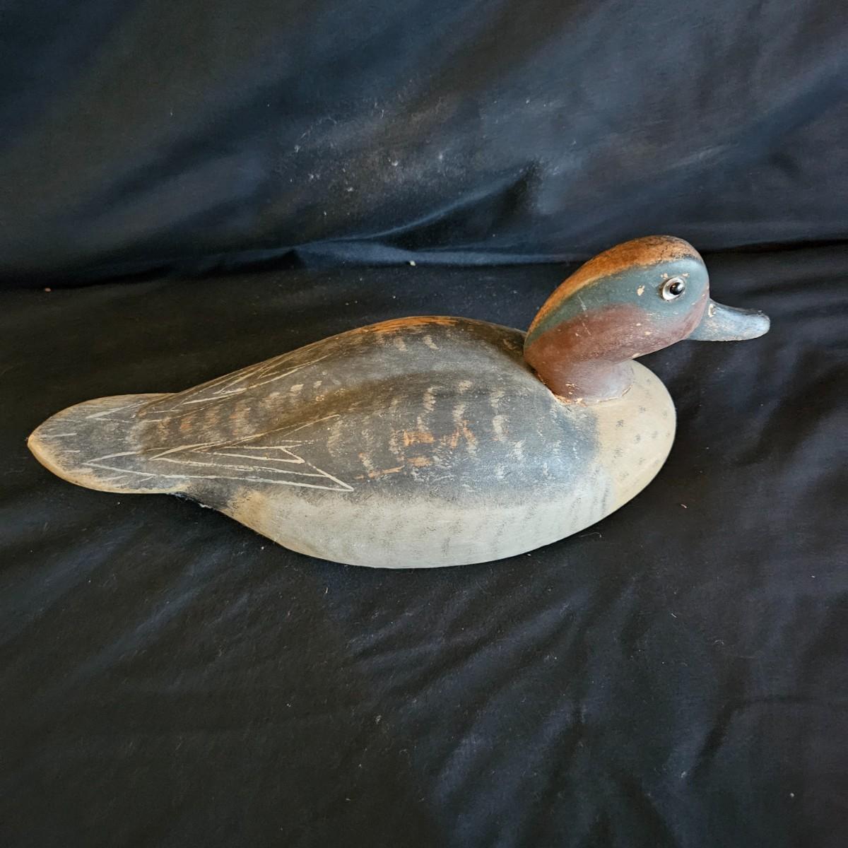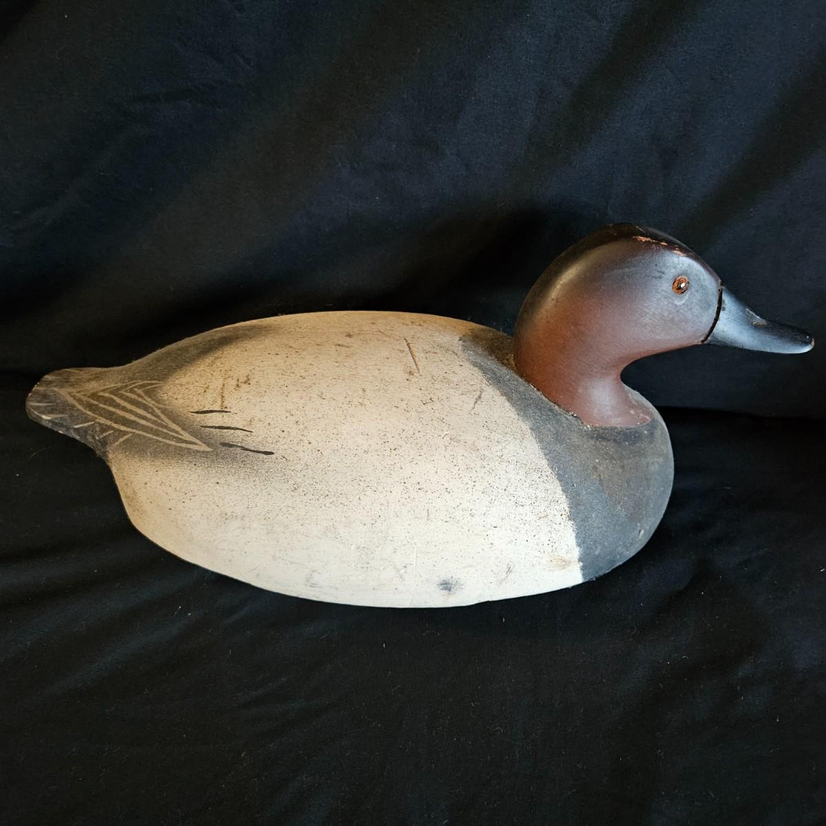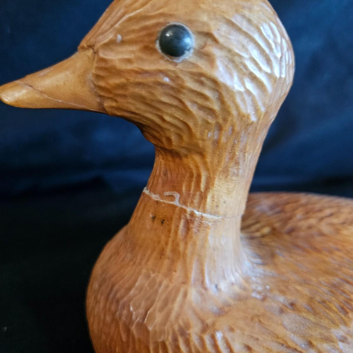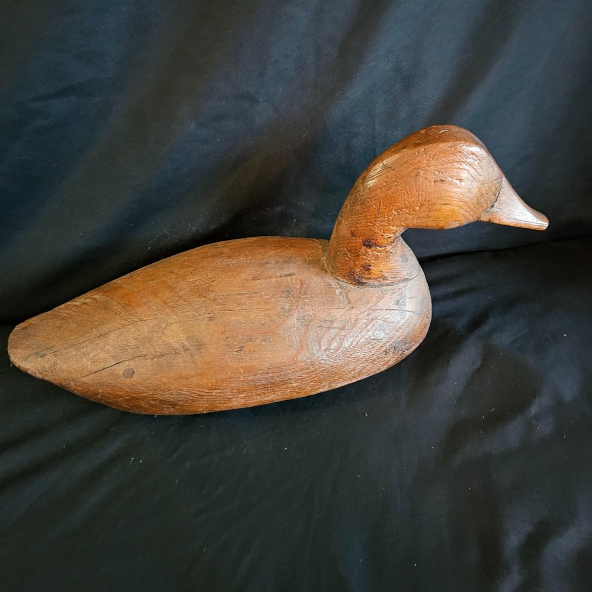 A collection of five water fowl decoys and a book on North Carolina water fowl. Included is two larger wooden decoys, the larger rough carved one measures approximately 17" x 6.5" x 8"H. There are two smaller decoys and the unpainted one appears to have had its head repaired. The smaller piece is made of metal. Shipping available