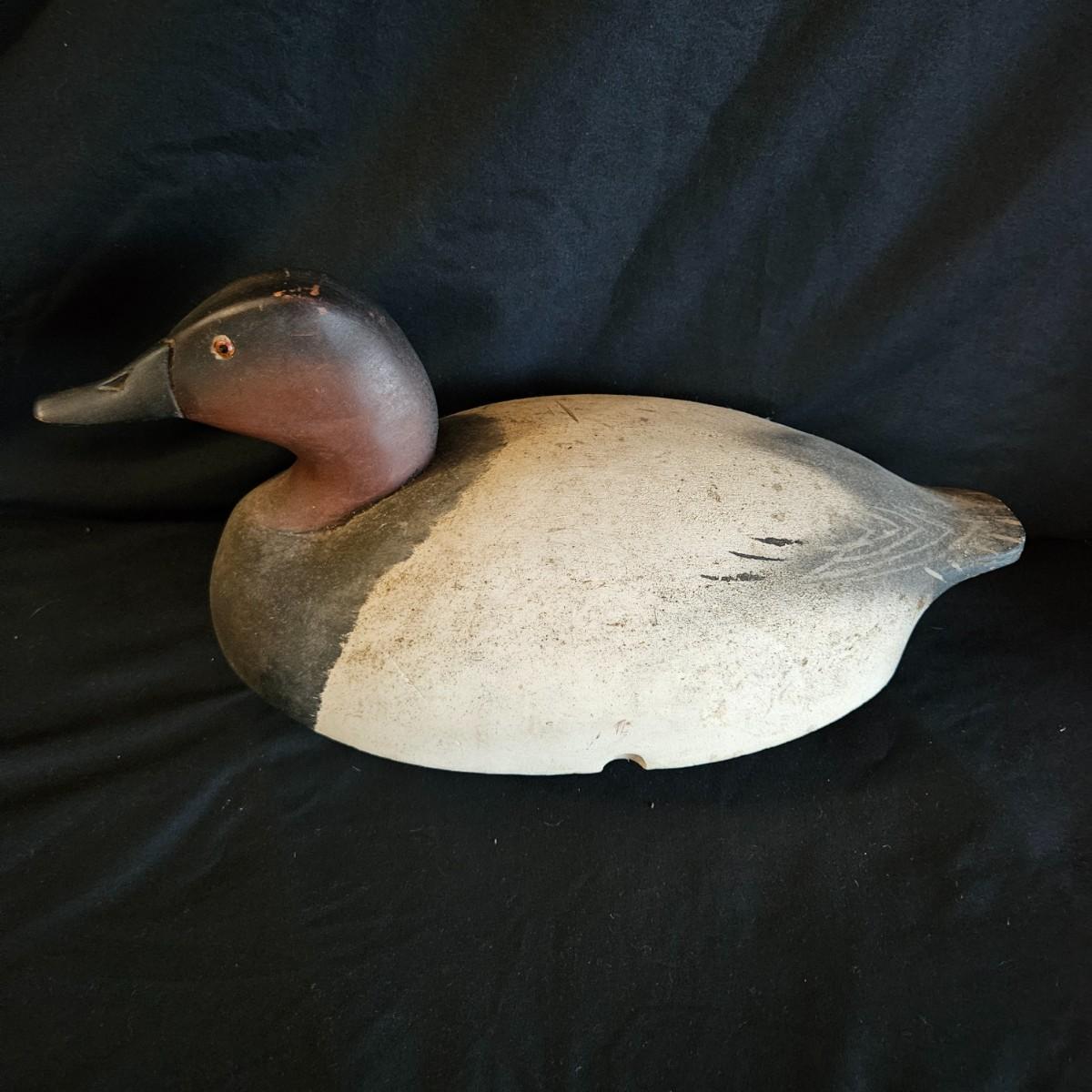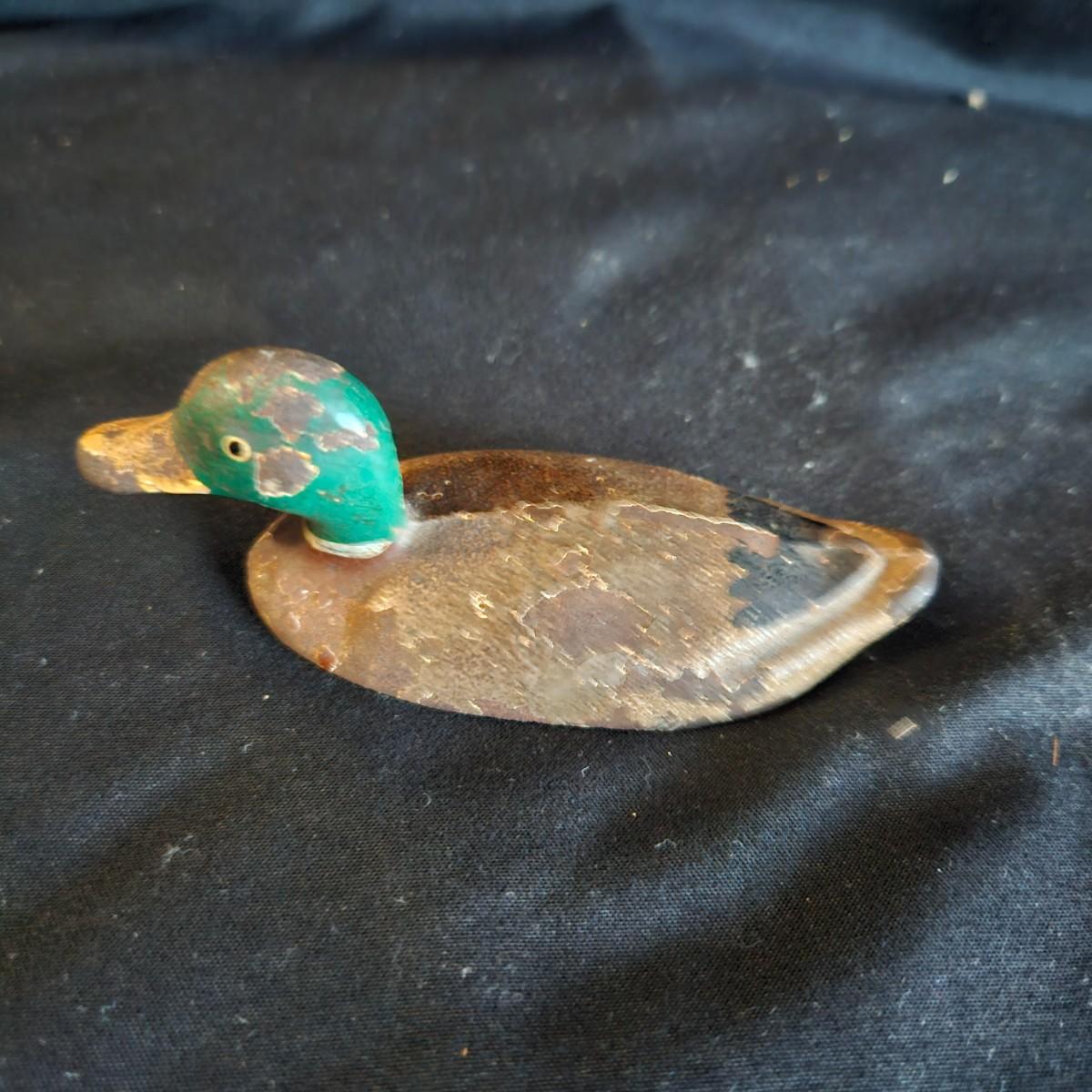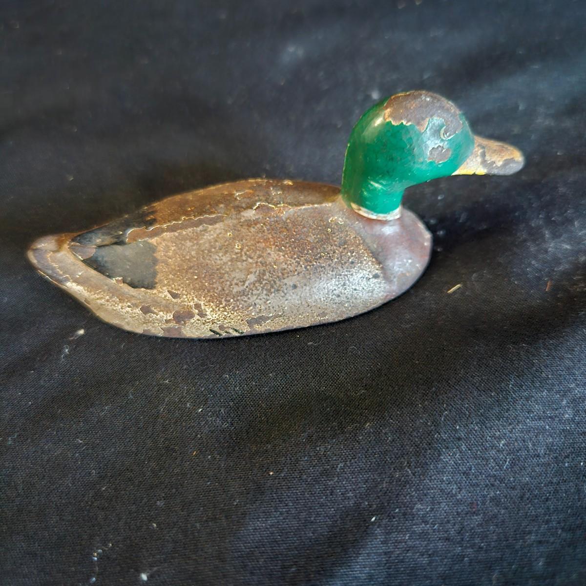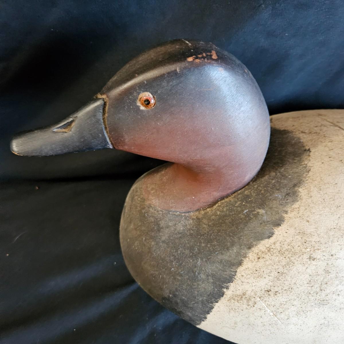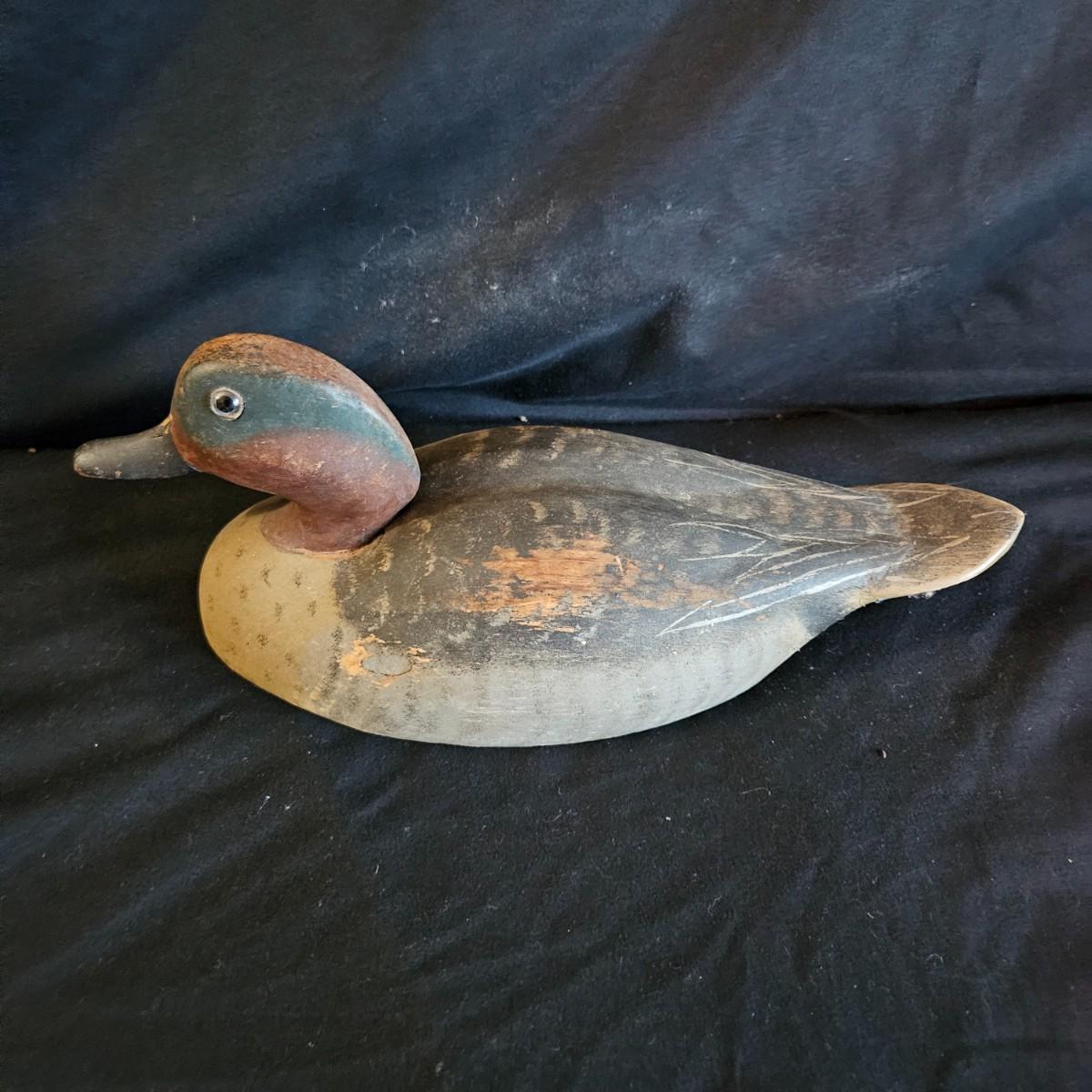 A collection of five water fowl decoys and a book on North Carolina water fowl. Included is two larger wooden decoys, the larger rough carved one measures approximately 17" x 6.5" x 8"H. There are two smaller decoys and the unpainted one appears to have had its head repaired. The smaller piece is made of metal. Shipping available