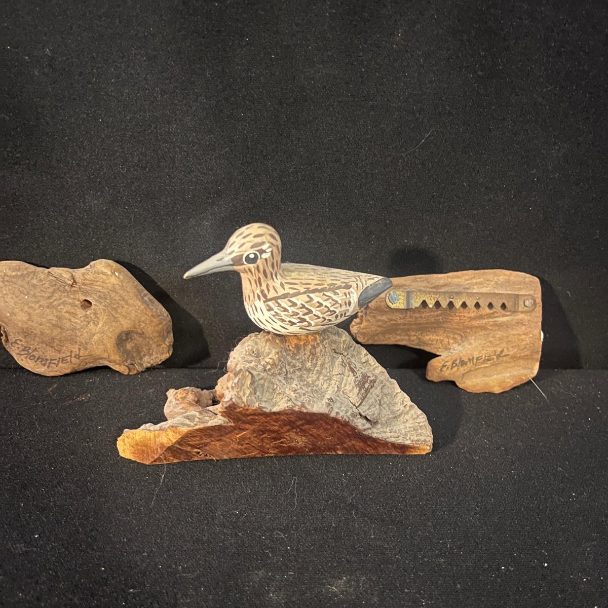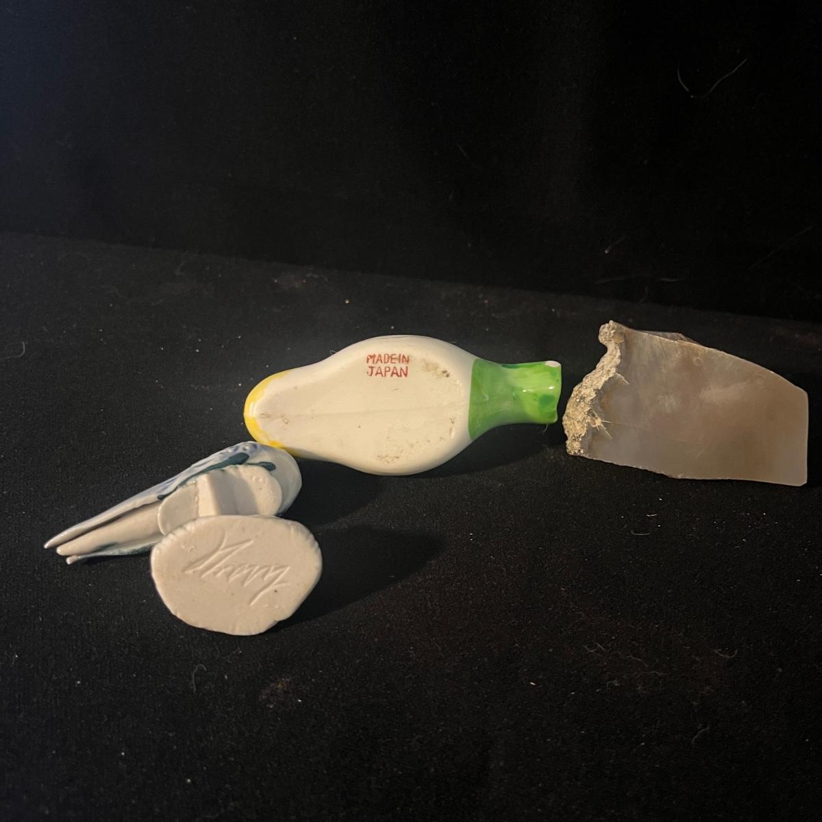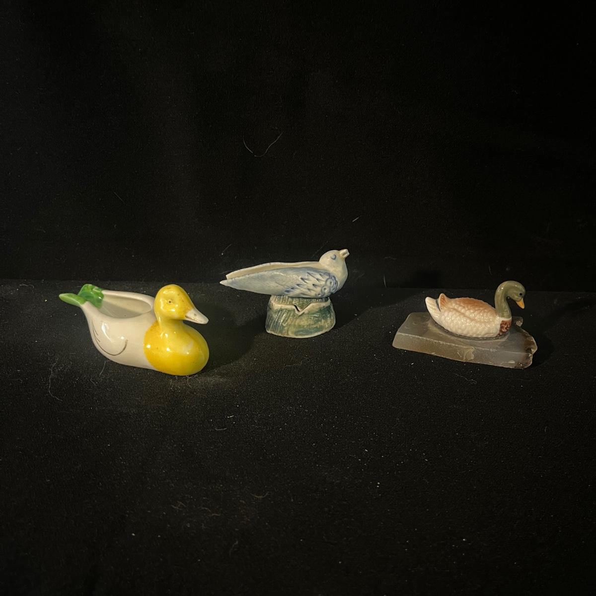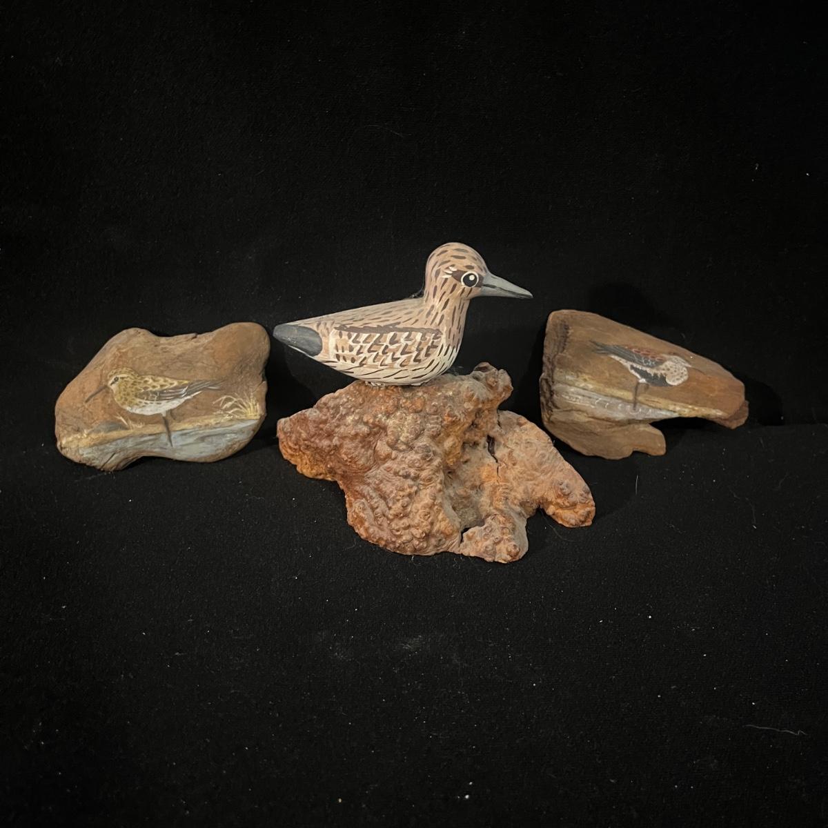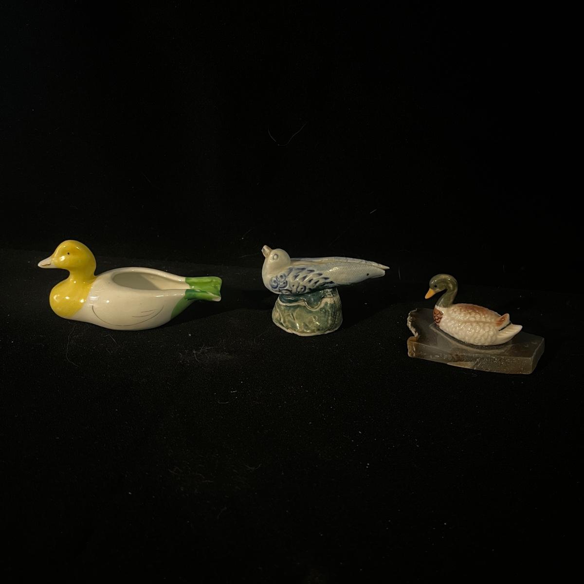 Lot of bird themed art including three framed pieces, ten ceramic birds, three wooden pieces and a resin bird. The largest framed piece of art measures 17.5” x 14.5”H.