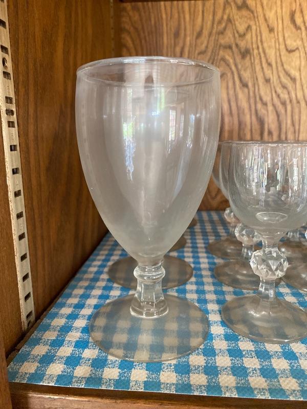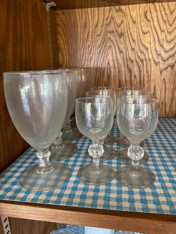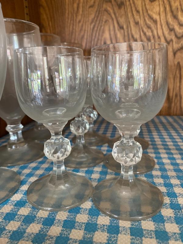 Set of 4 water goblets and 6 cordial glasses. All are in good condition, no chips, they are dusty/dirty from being in cupboard.