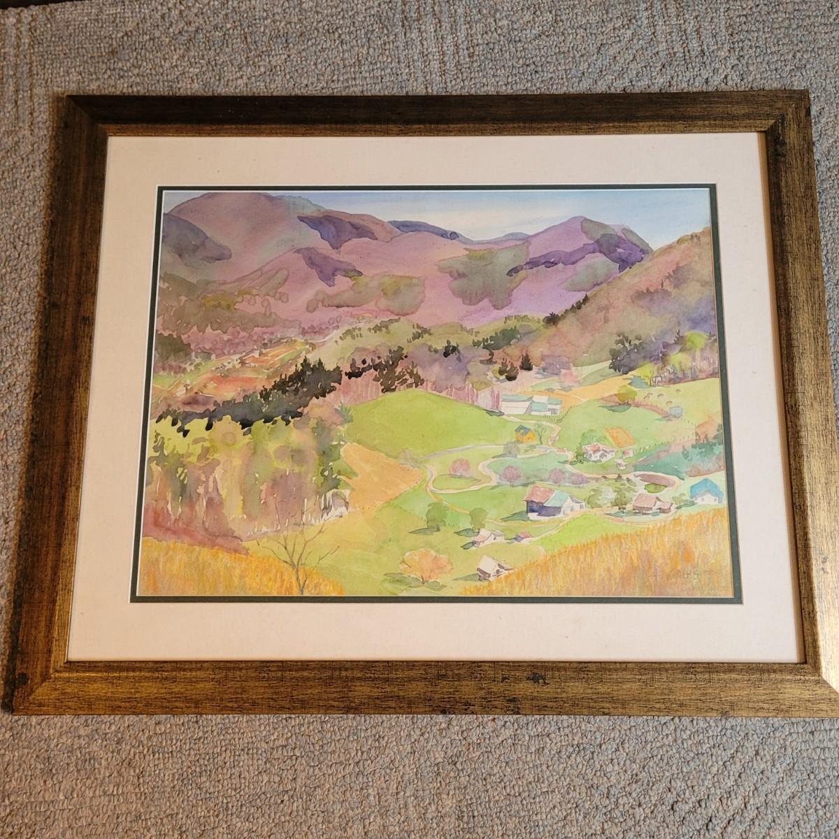 This lot includes an original piece of art by an unknown artist. The piece is signed in the bottom right corner but it is illegible. See photos. The image depicts a farm valley surrounded by mountains and is done in watercolor and pastel. The image is double matted, under glass, and framed in wood. The frame measures 41" x 33"H.