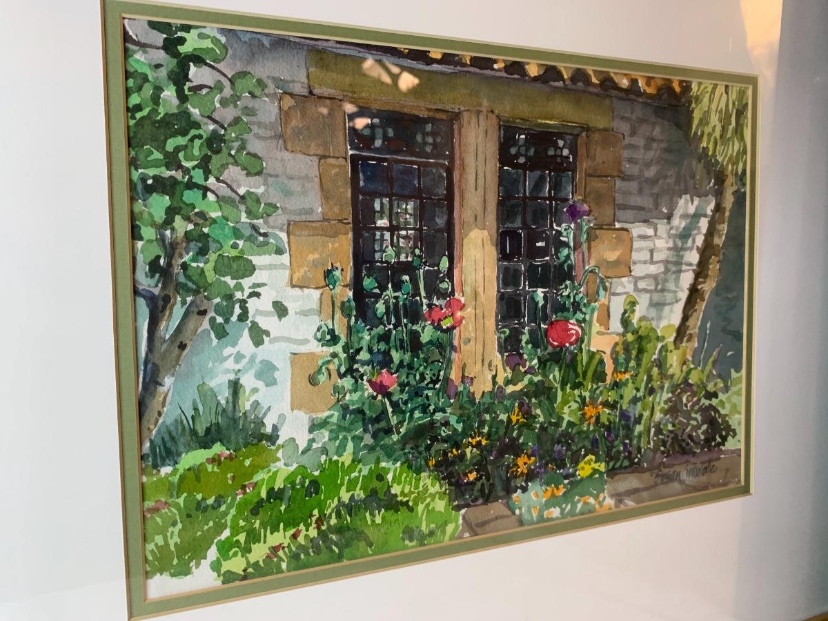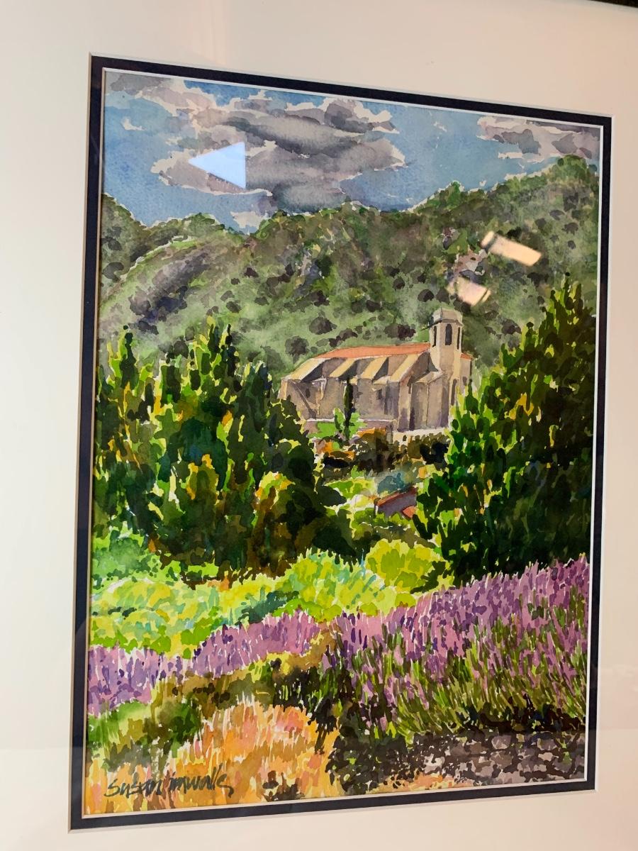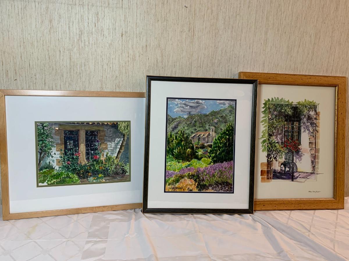 Three watercolor paintings with wooden frames in excellent condition (far left- 23X19) (middle-18X22) (Far right- 19X23)