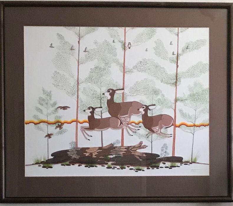 Measures 31 inches tall x 36 inches wide framed. Very good condition.