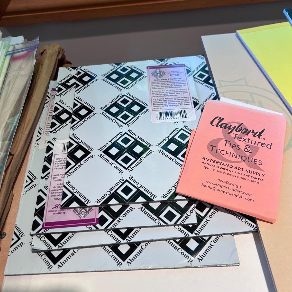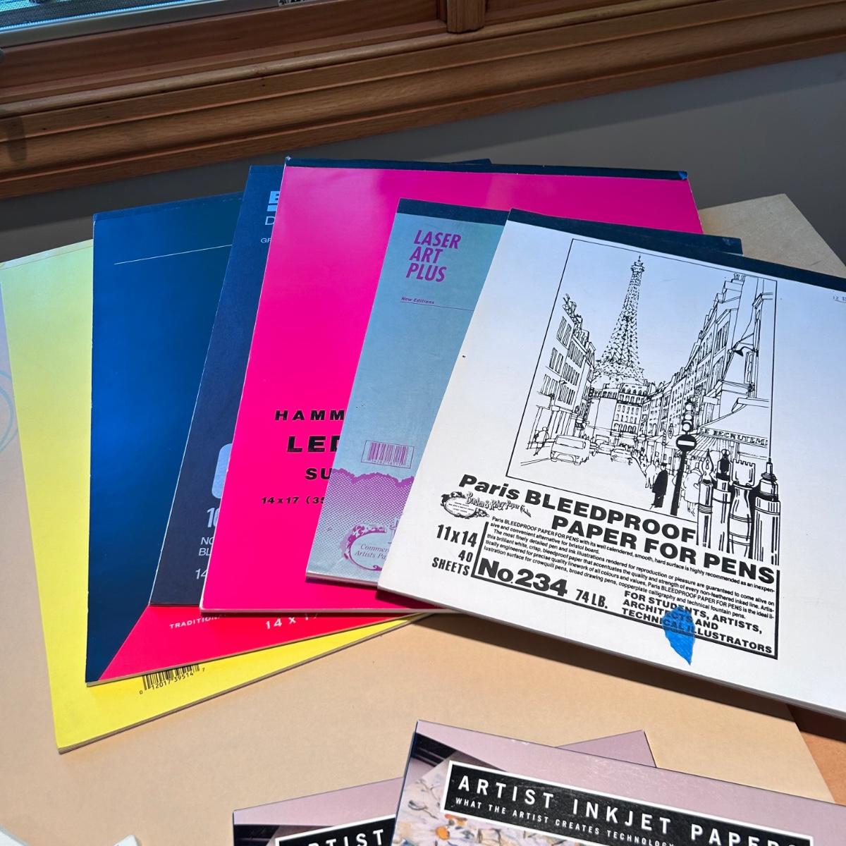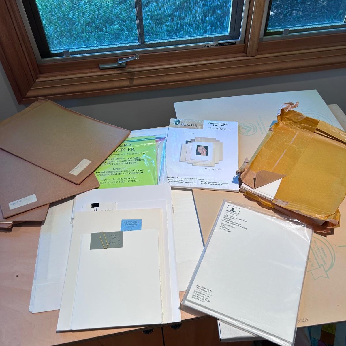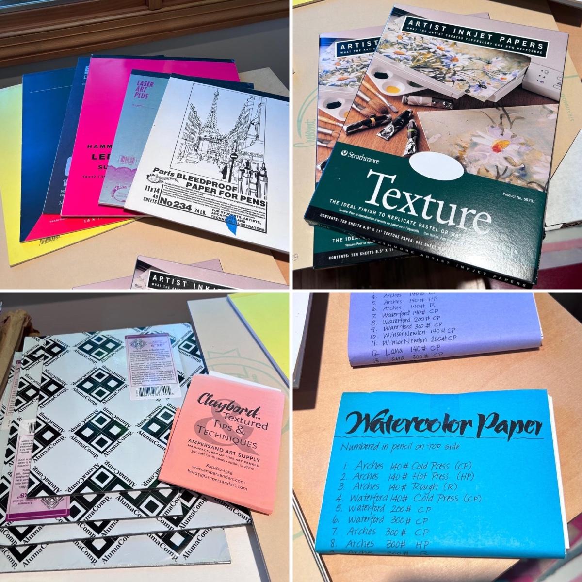 Artist Inkjet paper packs, four 14” x 17” pads, three very small canvases, textured paper, four Aluminum pieces, lots of watercolor samples and folders of textured paper in this artist’s lot. Three watercolor boards that measure 20” x 30”.