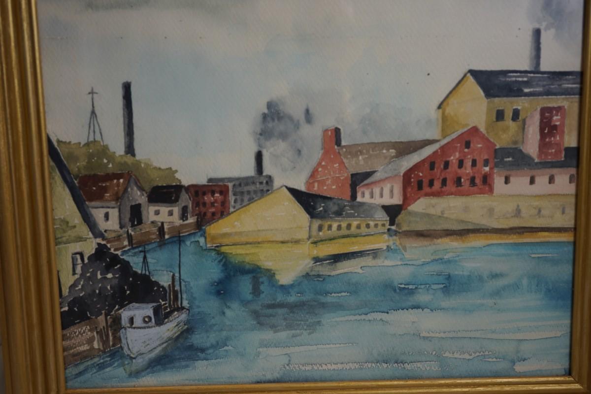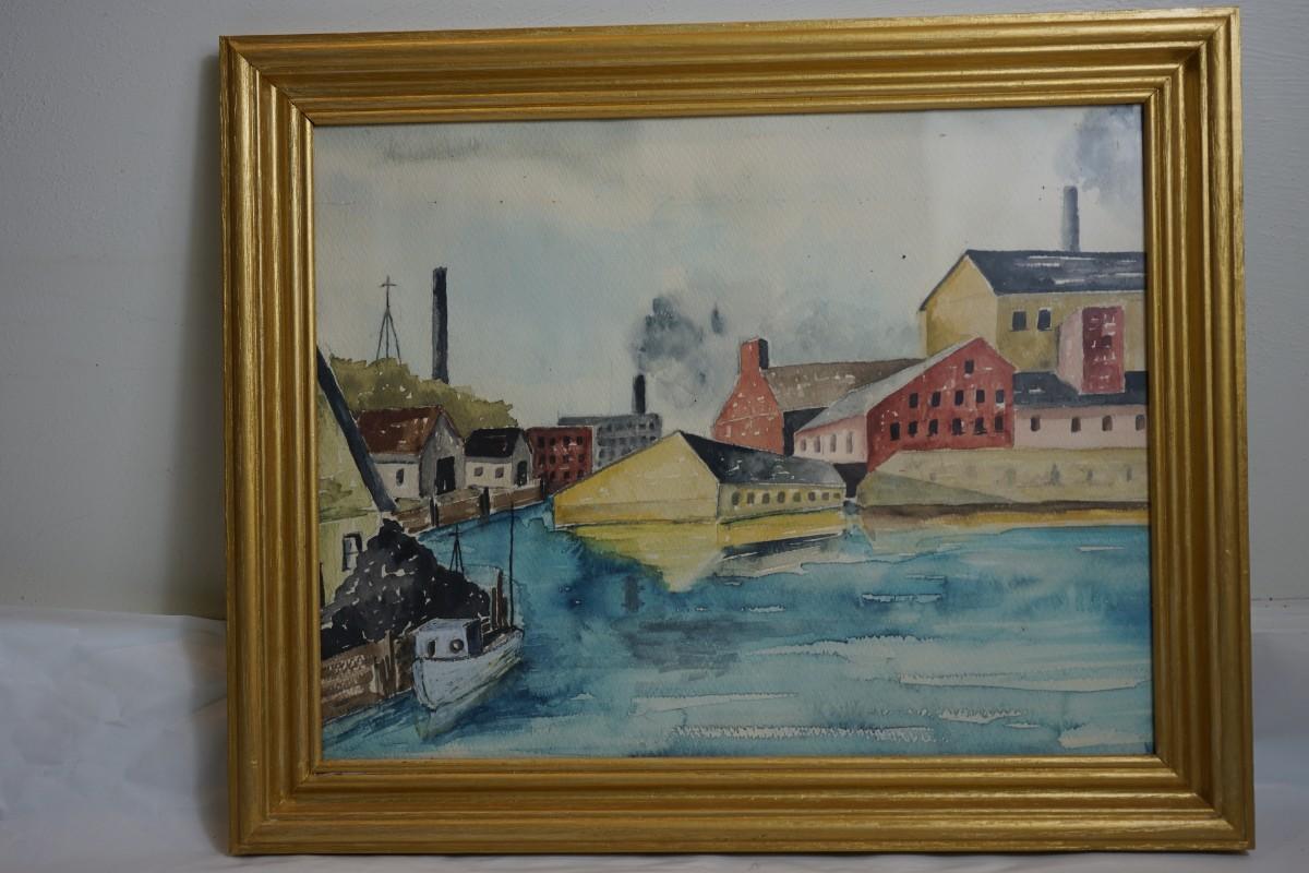 WATERCOLOR OF AN INDUSTRIAL SCENE BY WATER FRONT. ARTIST UNKNOWN FRAMED IN GOLD PTD WOODEN FRAME