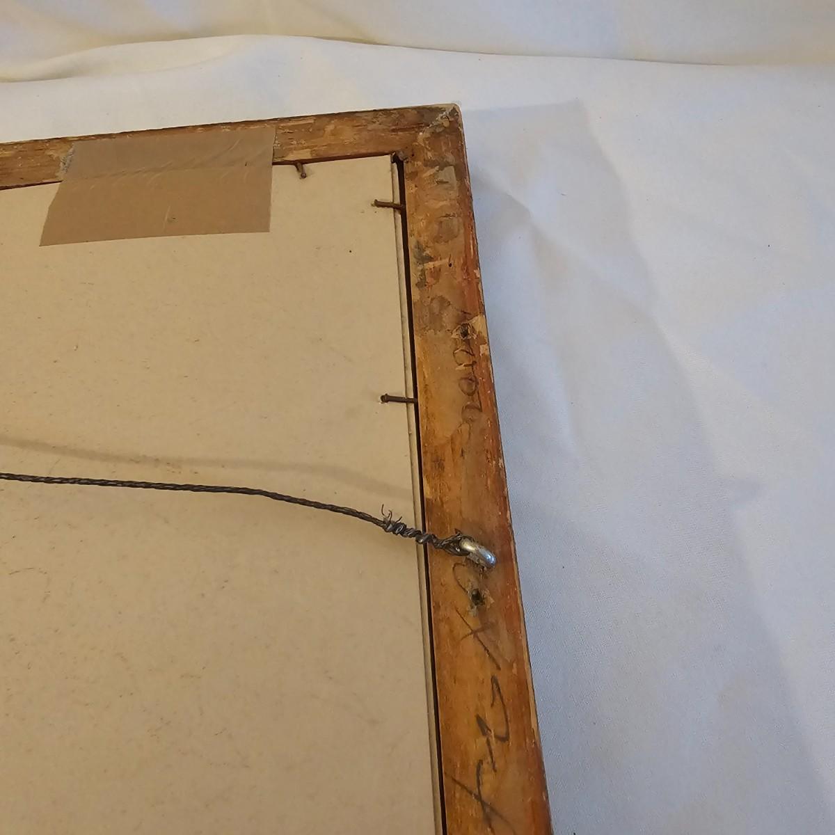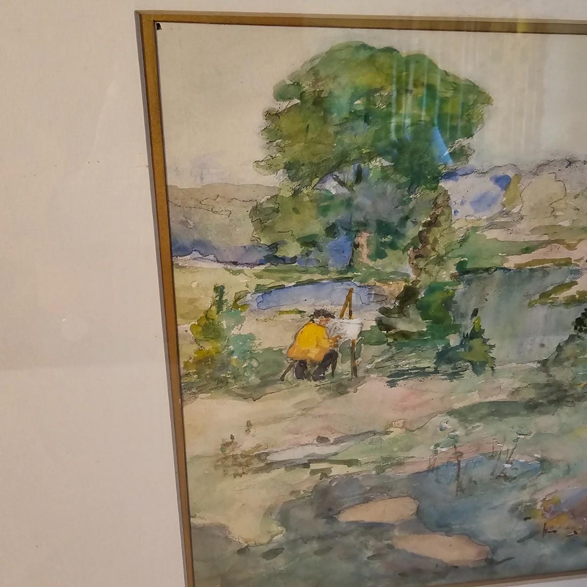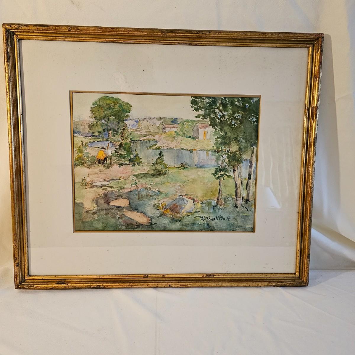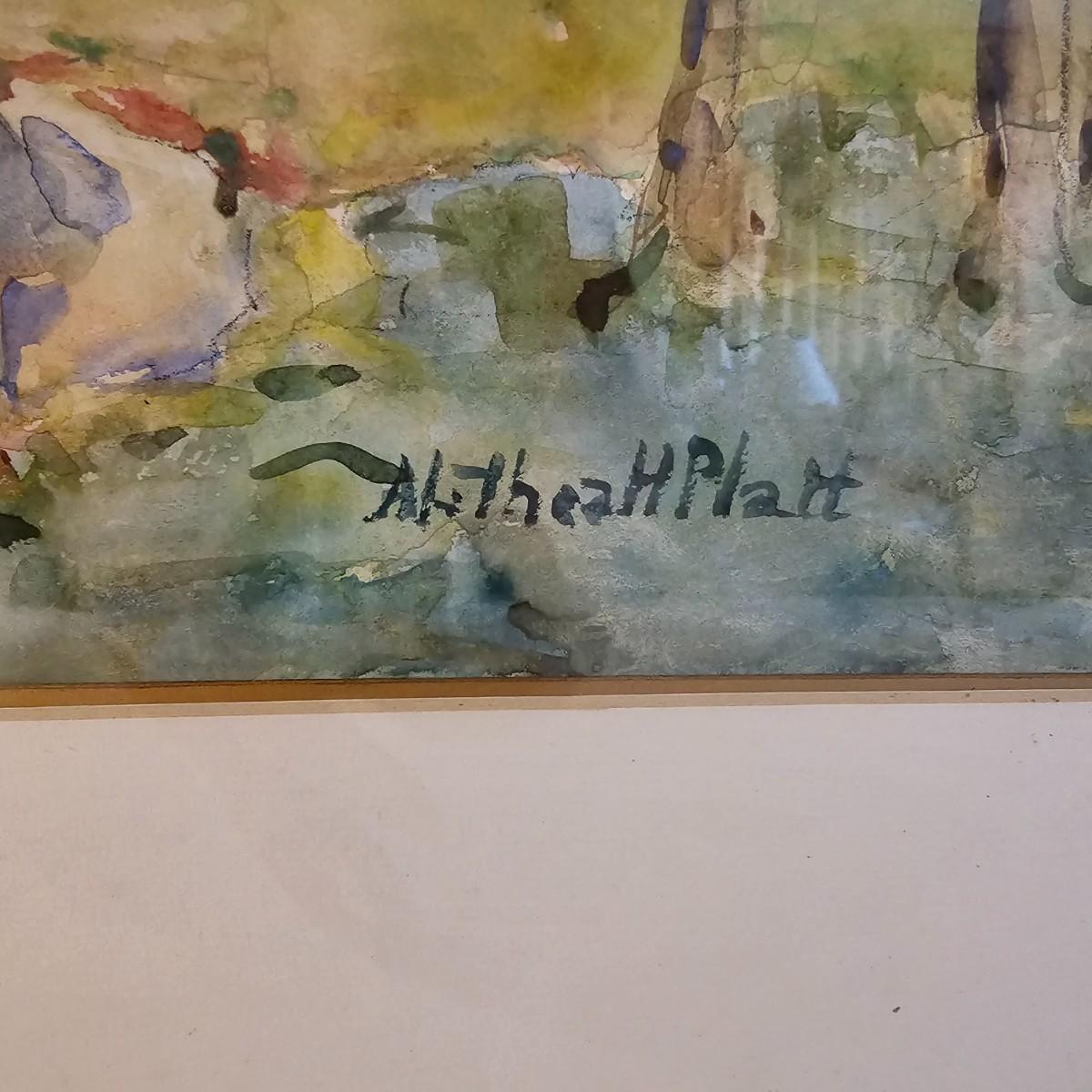 Art appears to be a soft pastel watercolor rendering of an artist working on a landscape. Painting is by Althea H. Platt, measures 26" x 22"H. Frame is a bit weathered, see photos for details. Shipping available. Shipping can be costly. We suggest contacting our preferred local shipping provider, Postage Express, with dimensions and getting an estimate before bidding: (828) 670-5501 or postageexpress@yahoo.com.