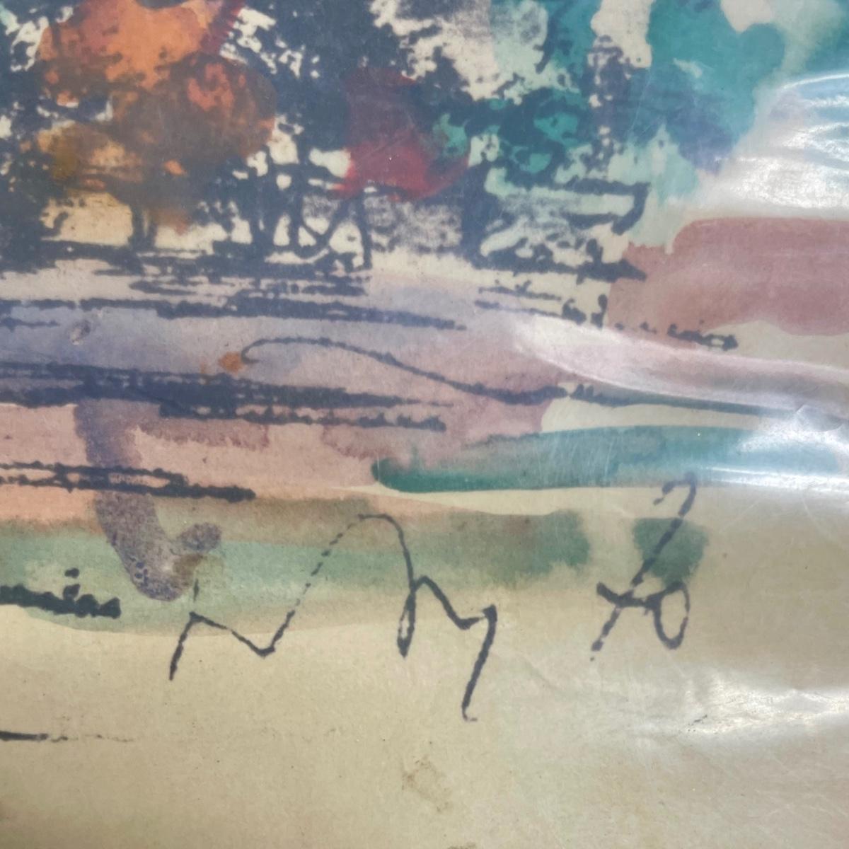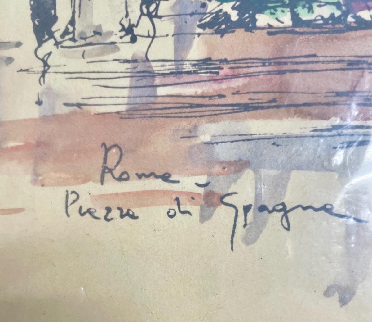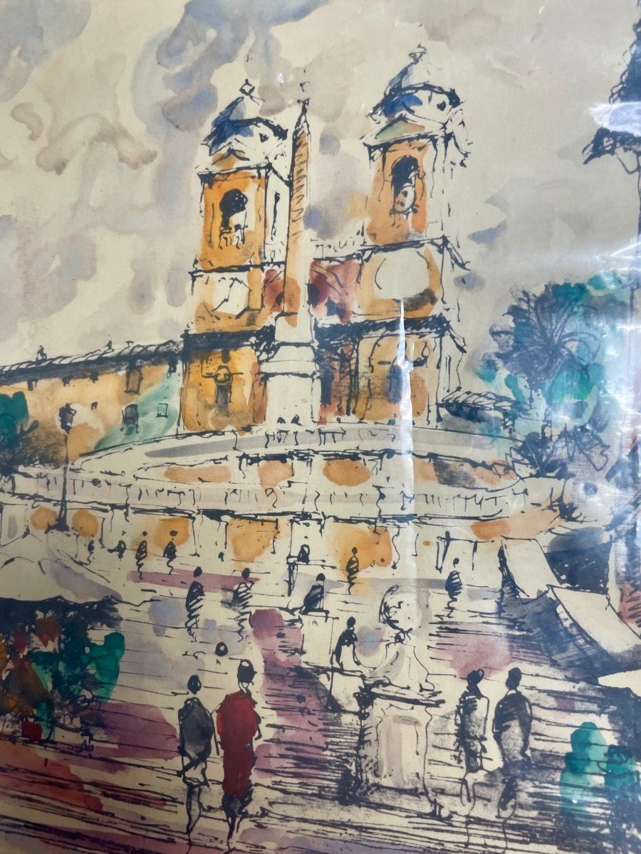 Watercolor don in Rome by a street artist. It depicts the Piazza di Spagna, which is a square in Rome at the foot of the Spanish Steps, near the Fontana della Barcaccia (Fountain of the Boat). This view is looking up the steps to the Church of Santissima Trinita dei Monti (Church of the Most Holy Trinity on the Mounts). The notation in the right bottom corner suggests is was created in 1970. Sealed in plastic, approx. 14" x 20".