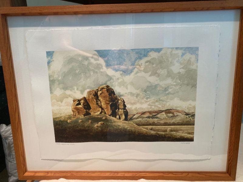 Watercolor Painting by David Kennedy entitled "Deer Medicine Rock" depicting landscape of rocks in desert , signed lower right with title of painting written in pencil on left of matte measurements of framed piece 25.5" wide x 19.5" tall