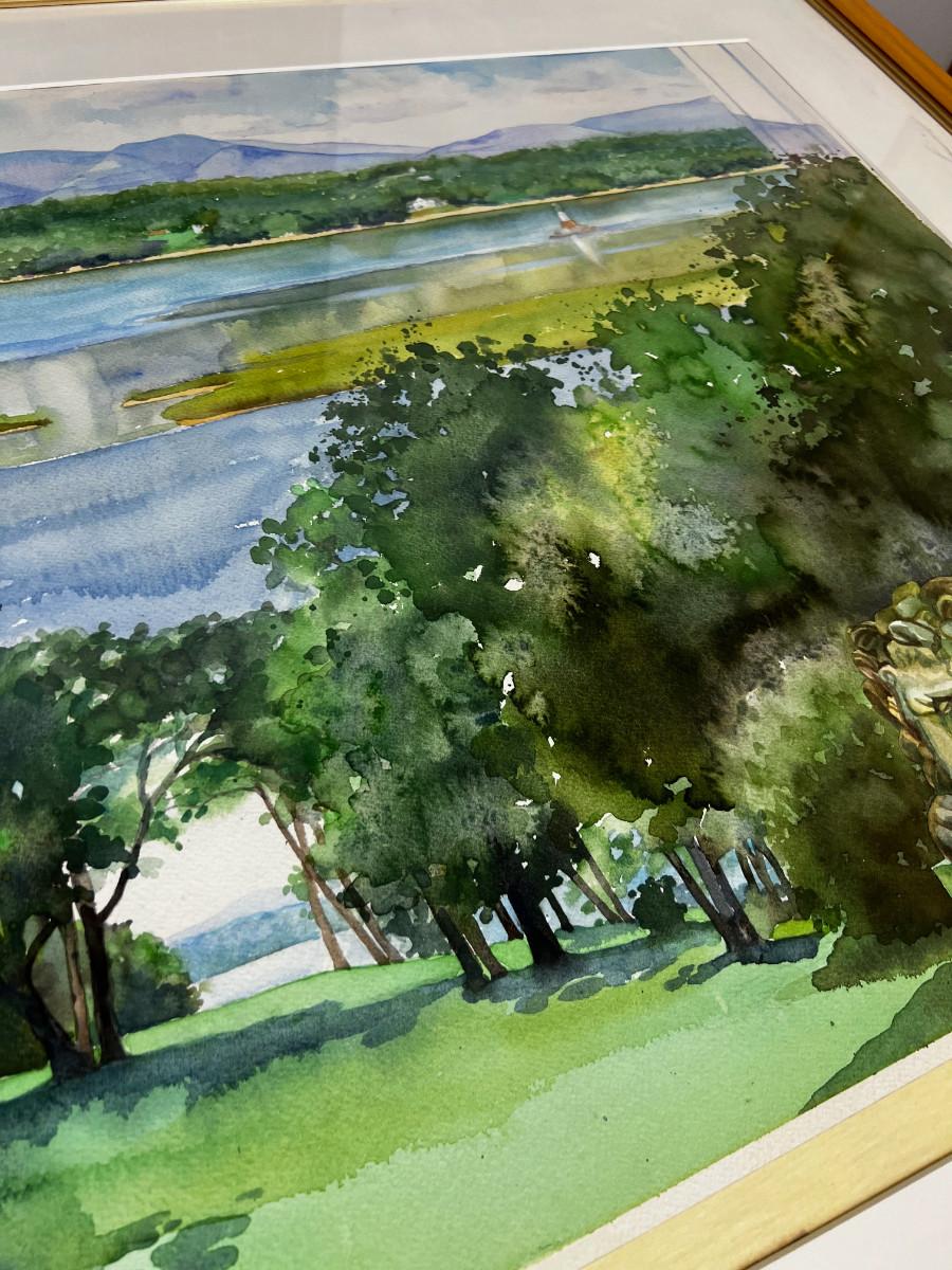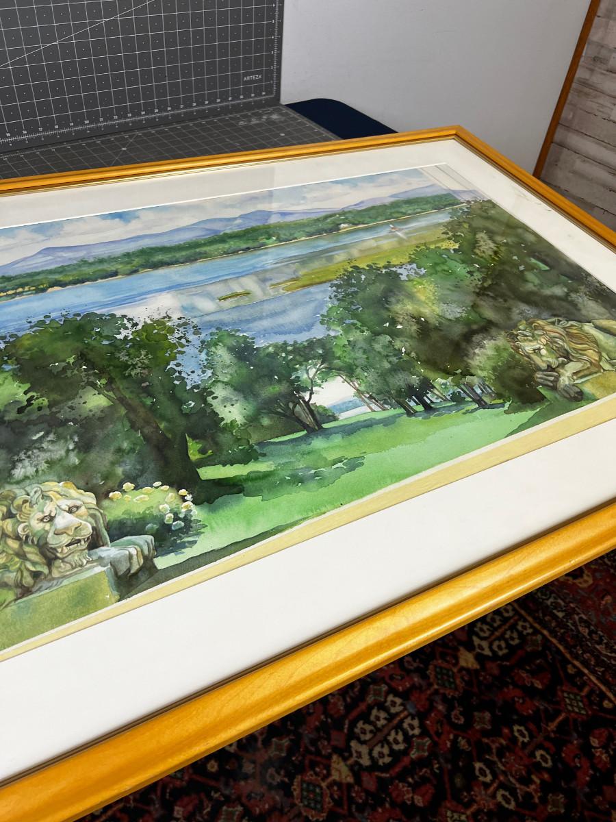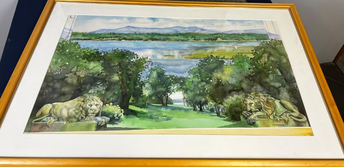 Watercolor Signed  Casdebroskey ? Of Lake and Stone Lions