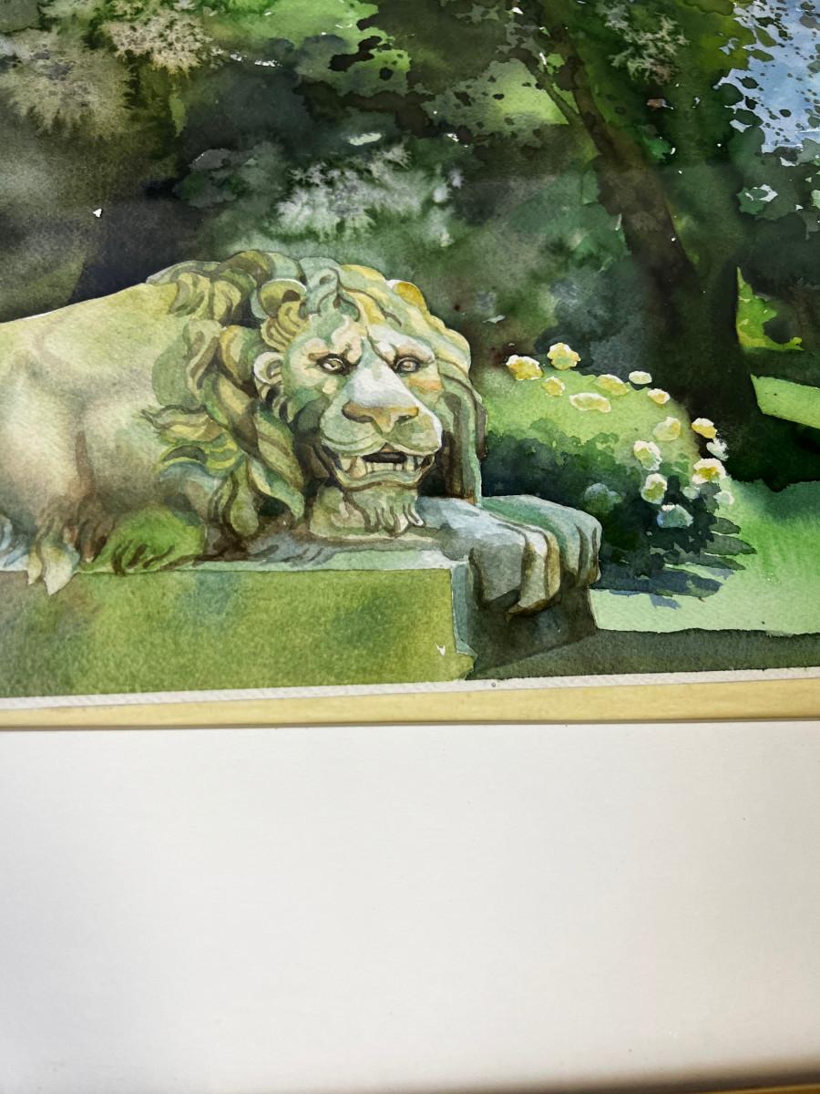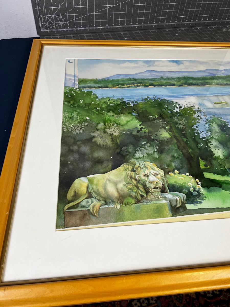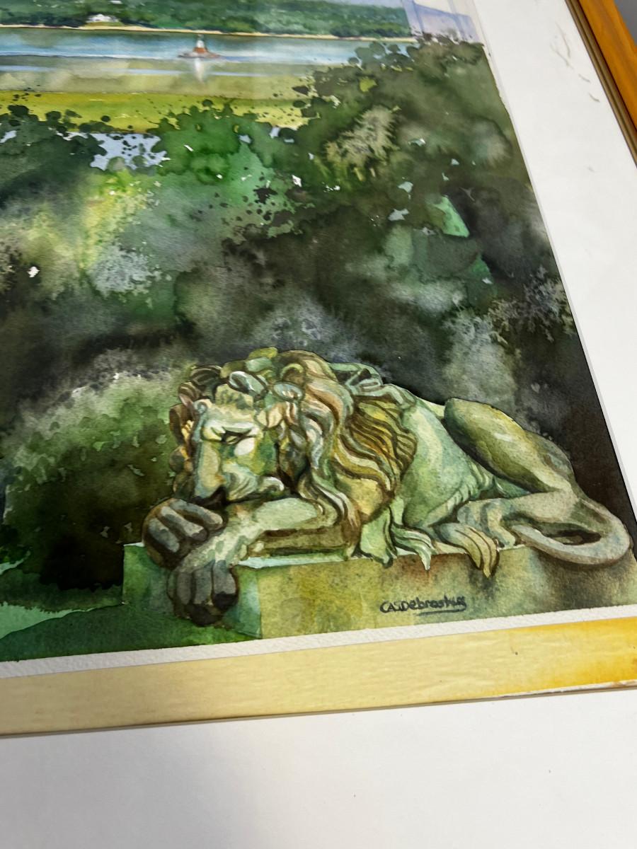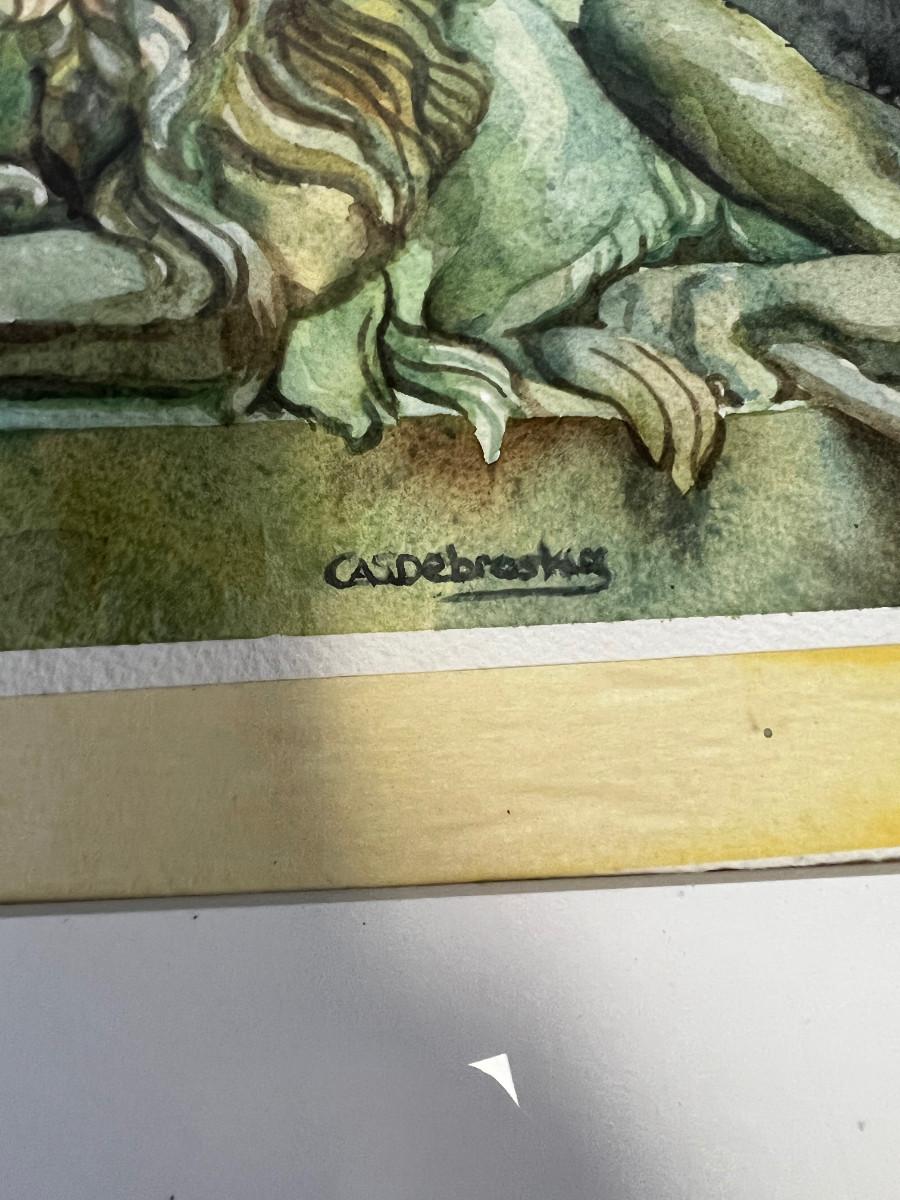 Watercolor Signed Casdebroskey ? Of Lake and Stone Lions