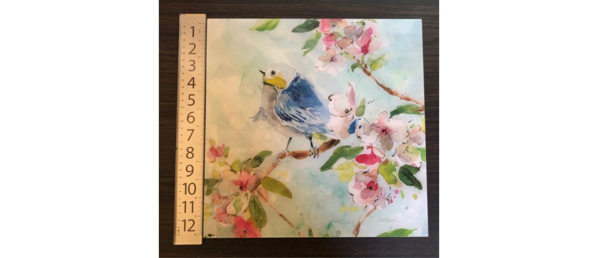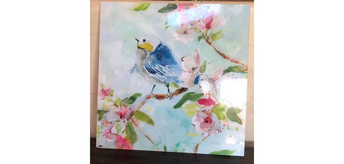Very cute watercolor print on plastic, design of a bird and flowers. Perfect for any home! Measures approximately 12" x 12".