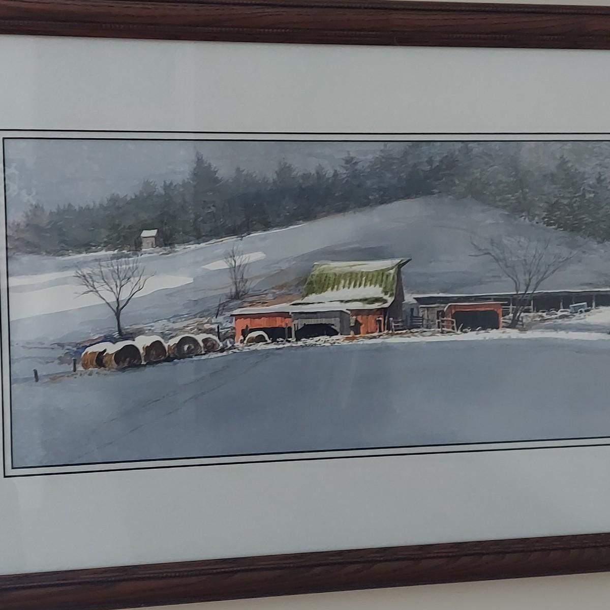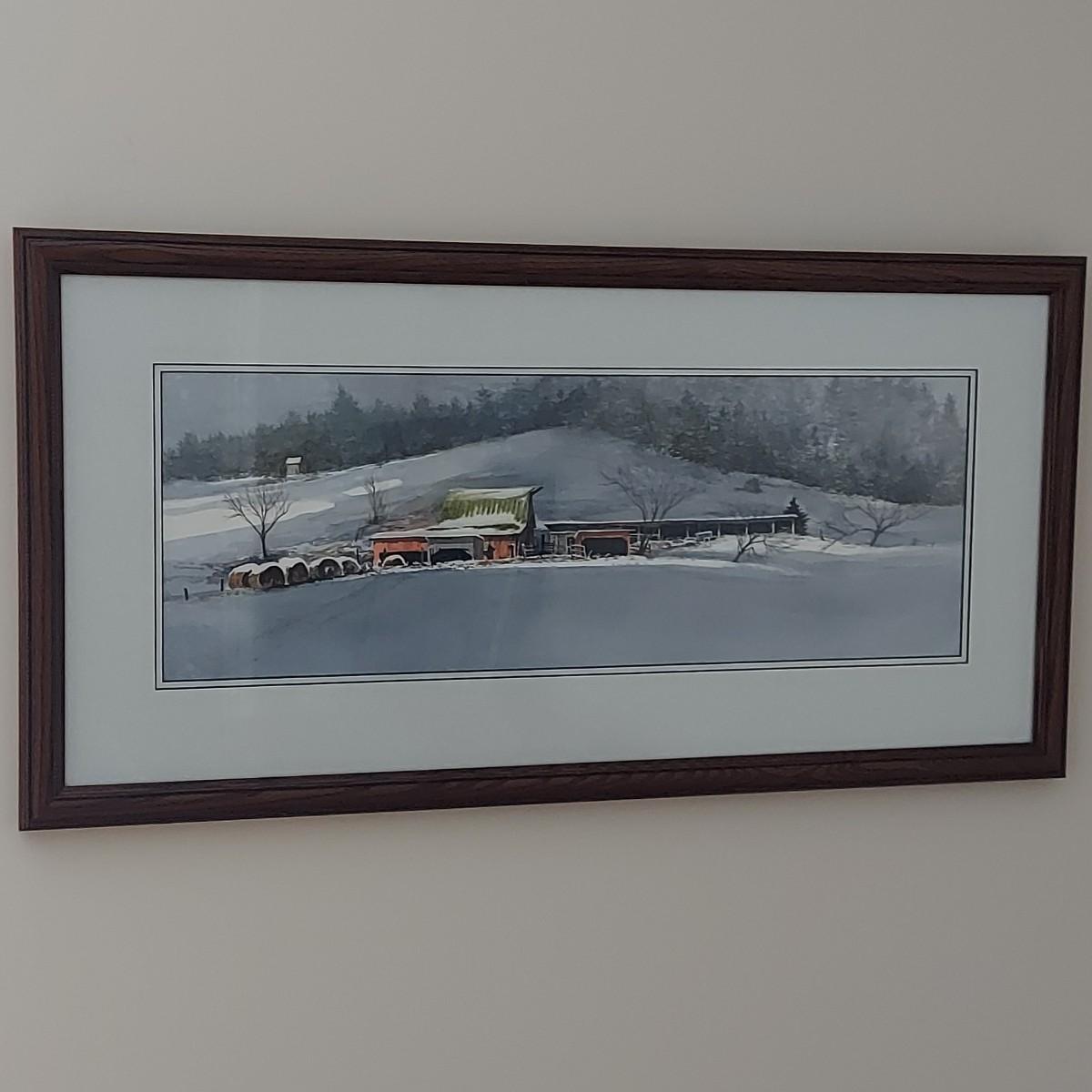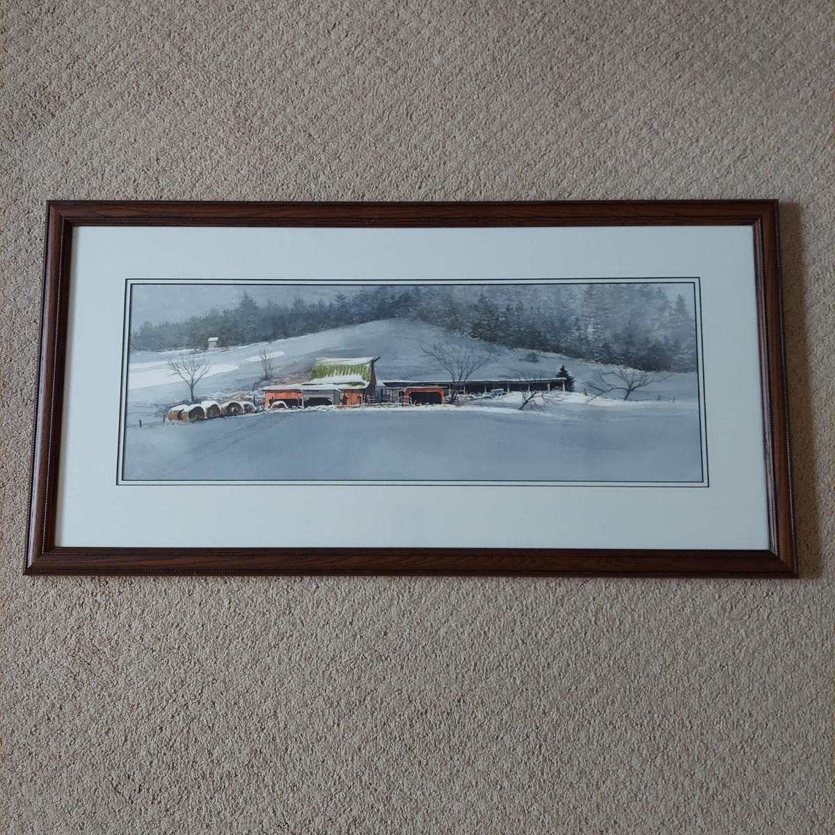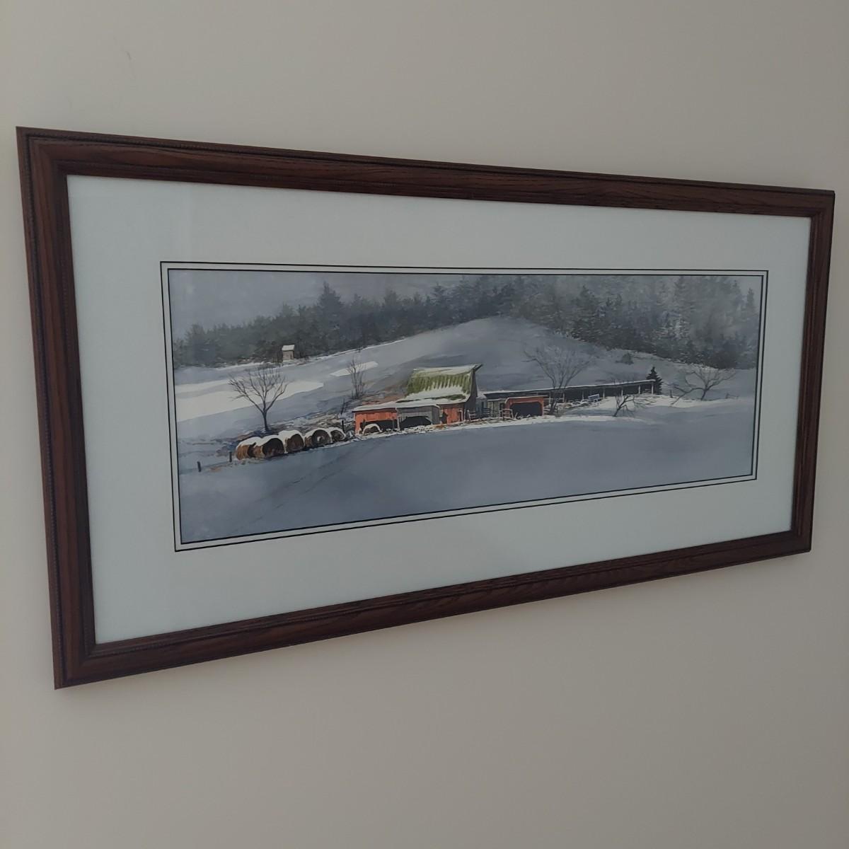 Custom framed watercolor landscape painting of an old barn during Winter. No visible signature. Solid wood frame measures 36" x 18"H. Shipping available.
