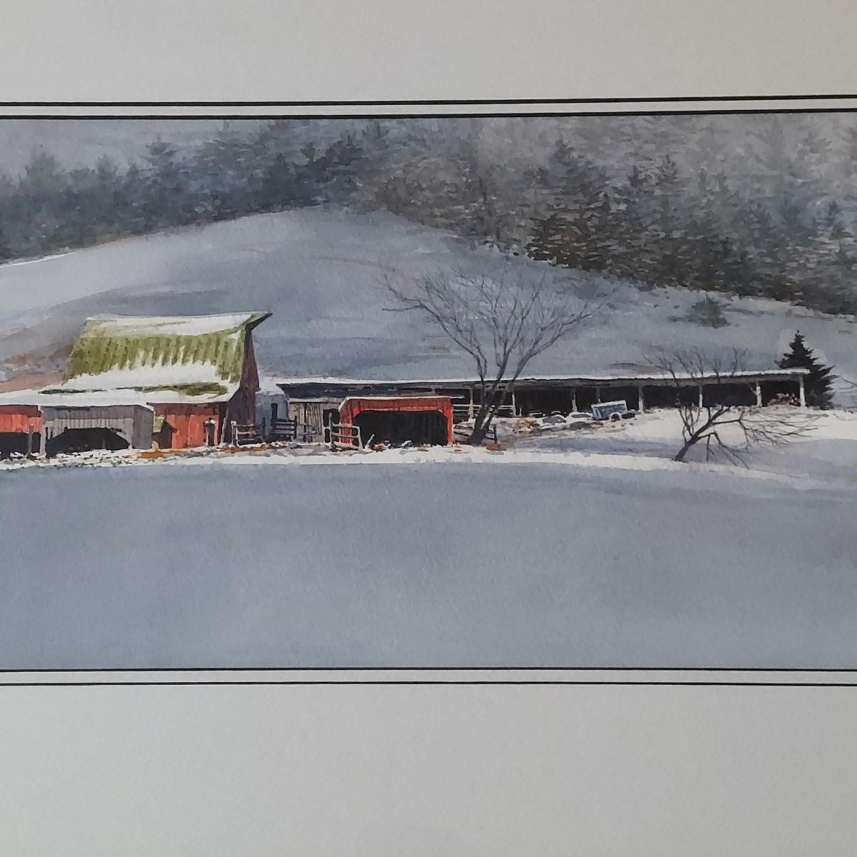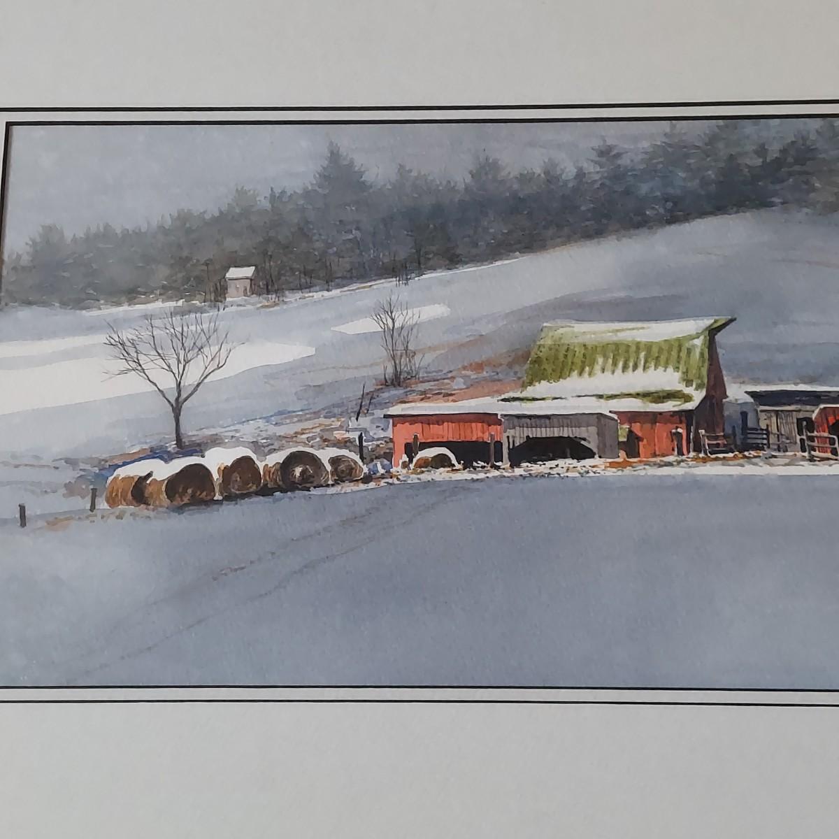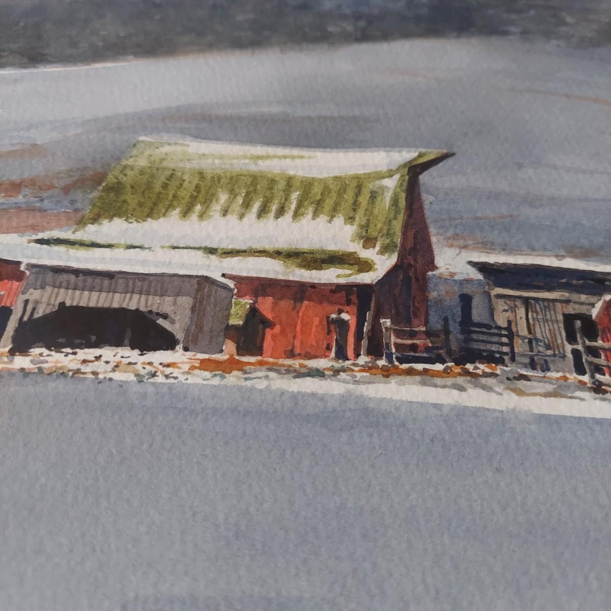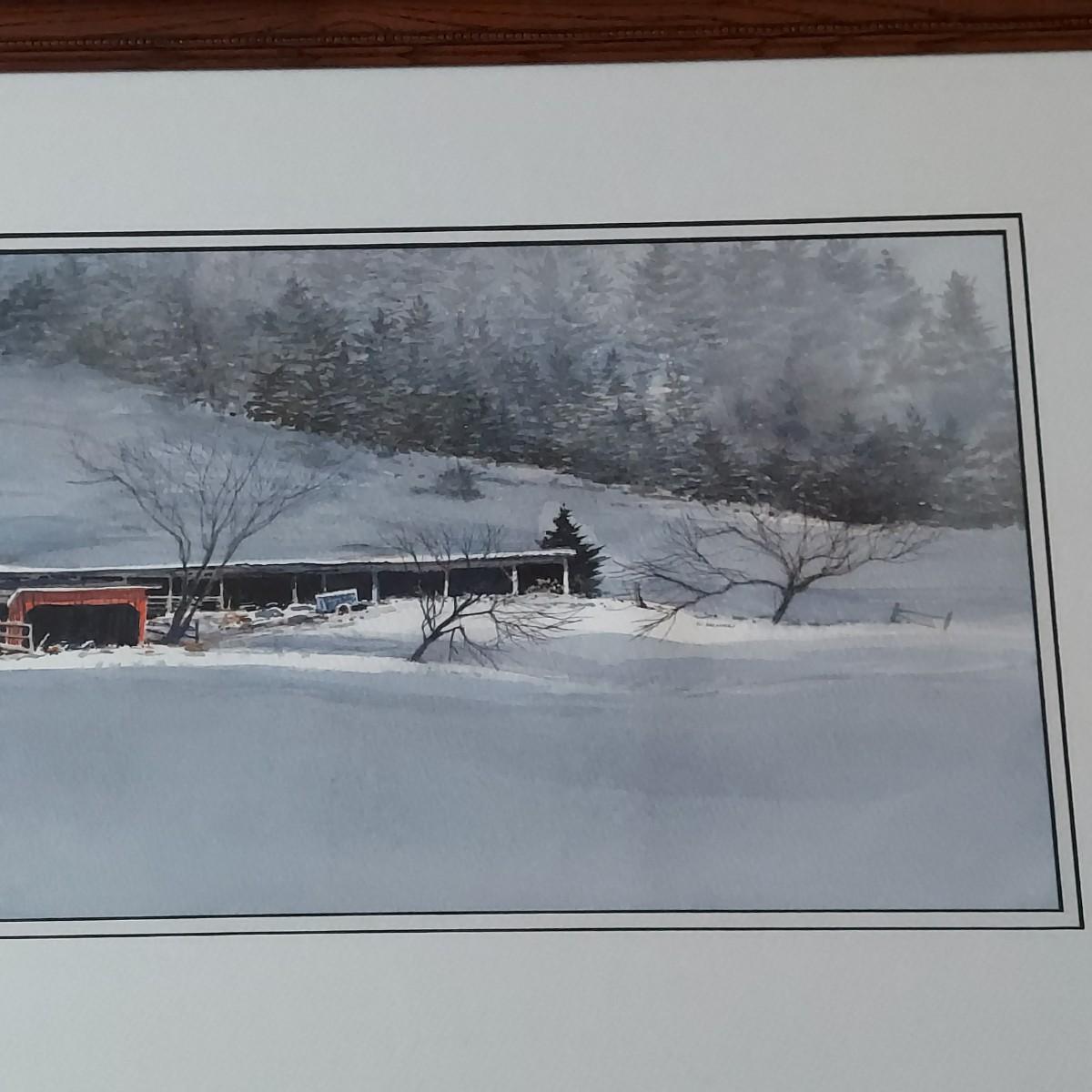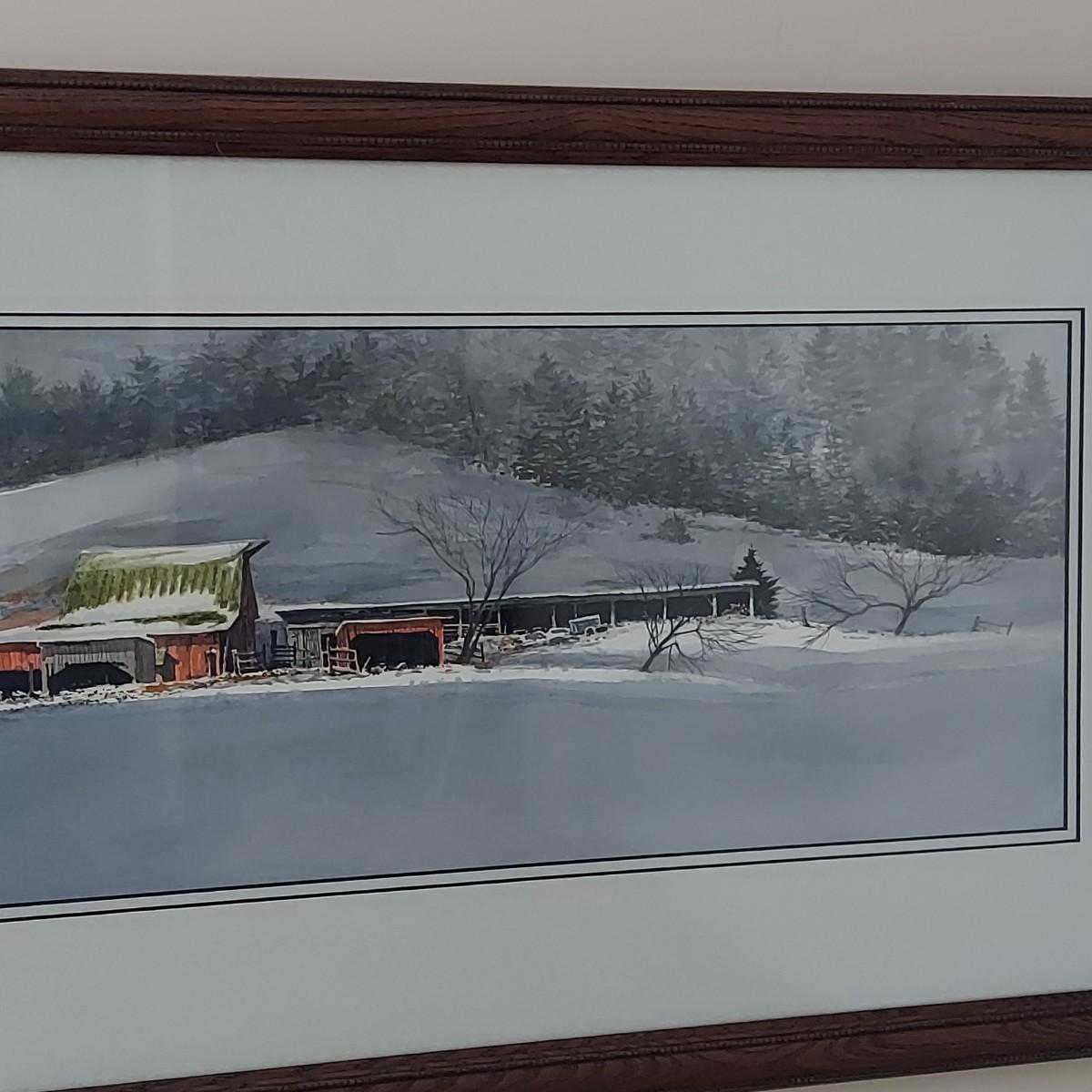 Custom framed watercolor landscape painting of an old barn during Winter. No visible signature. Solid wood frame measures 36" x 18"H. Shipping available.
