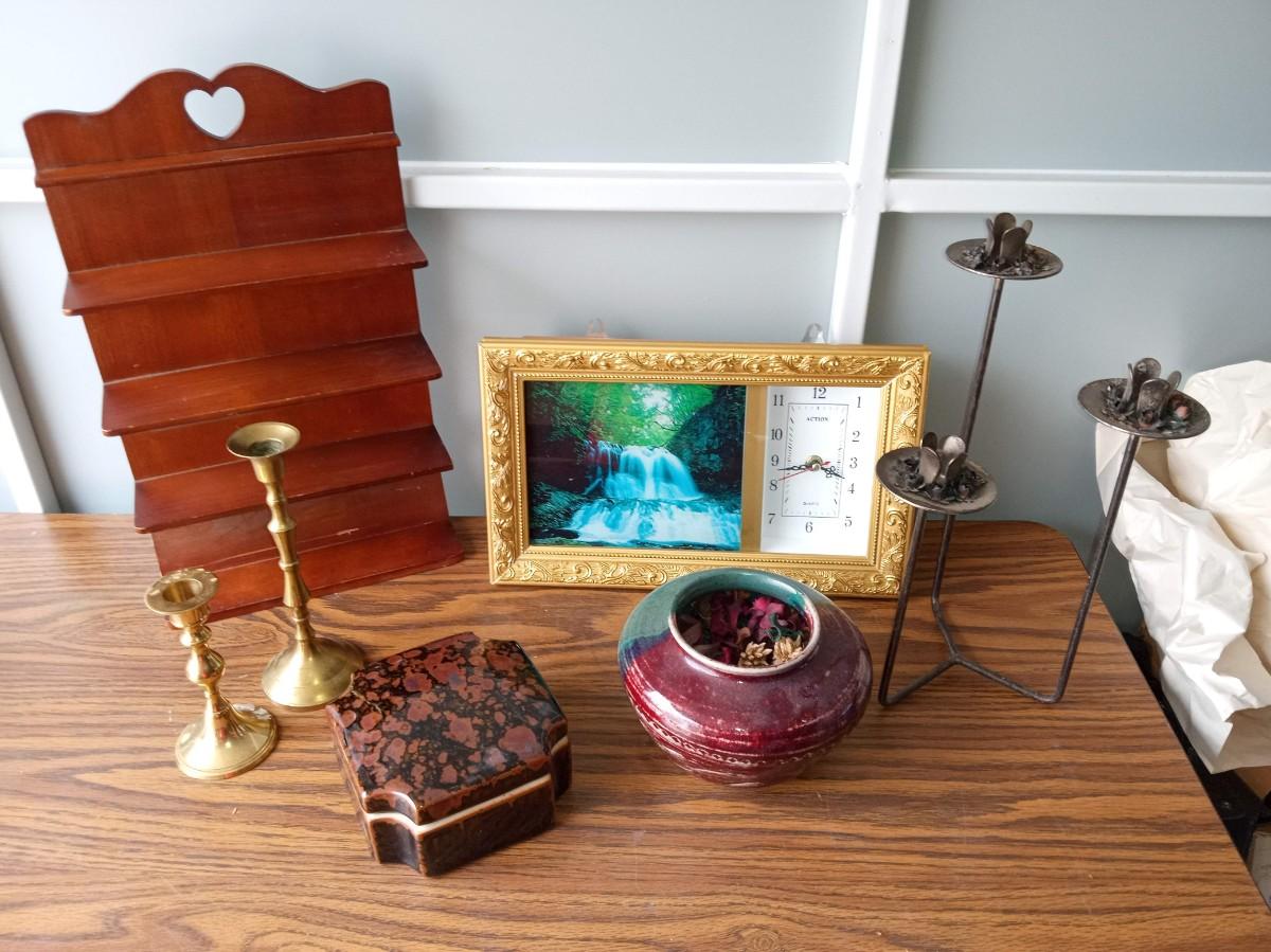 WATERFALL CLOCK, CANDLE HOLDERS, WALL SHELF, CLAY POT AND A TRINKET BOX