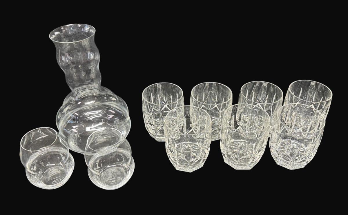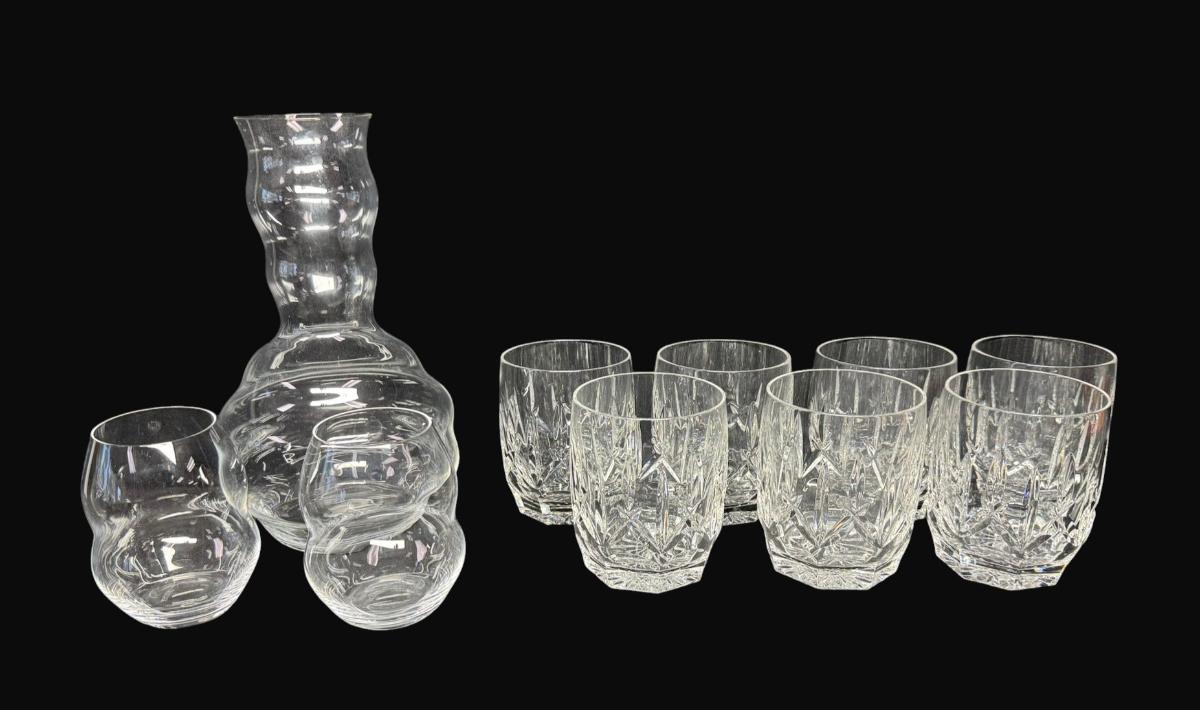 Includes seven Waterford Westhampton double glasses, and a Reidel swirl crystal wire decanter with two matching wine glasses. Total of ten pieces. Measurement of largest: 9.5”H. [CS]