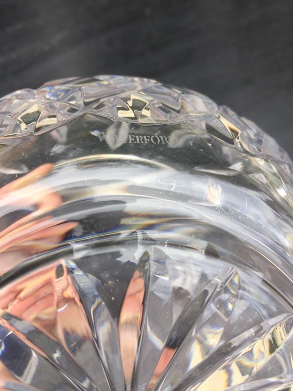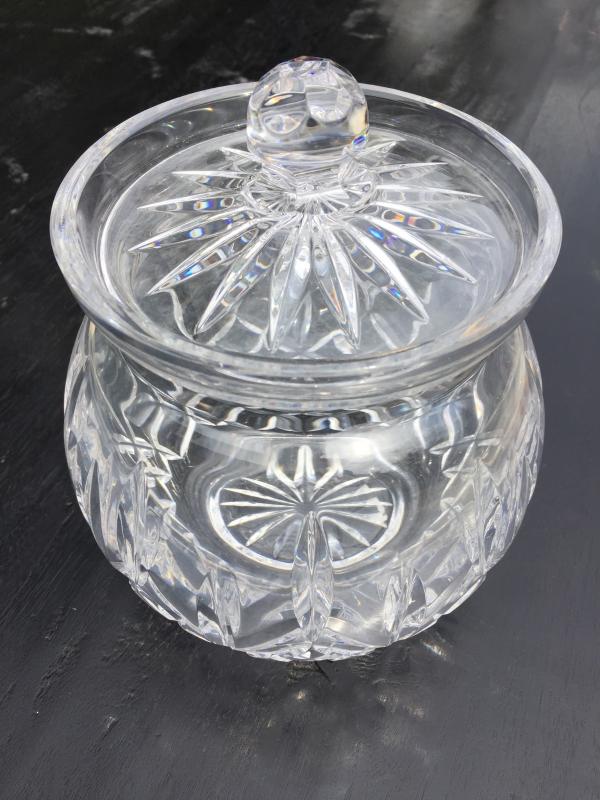 7.5" tall, 6" wide. Very pretty crystal jar with lid.