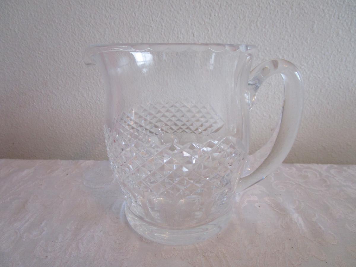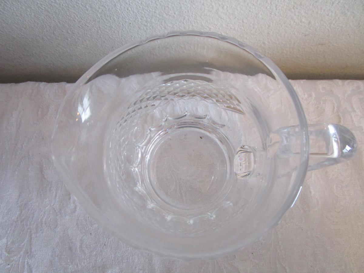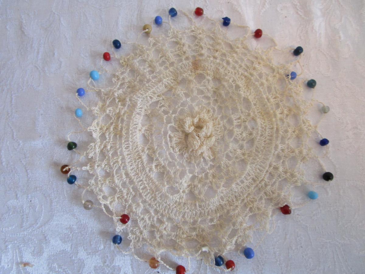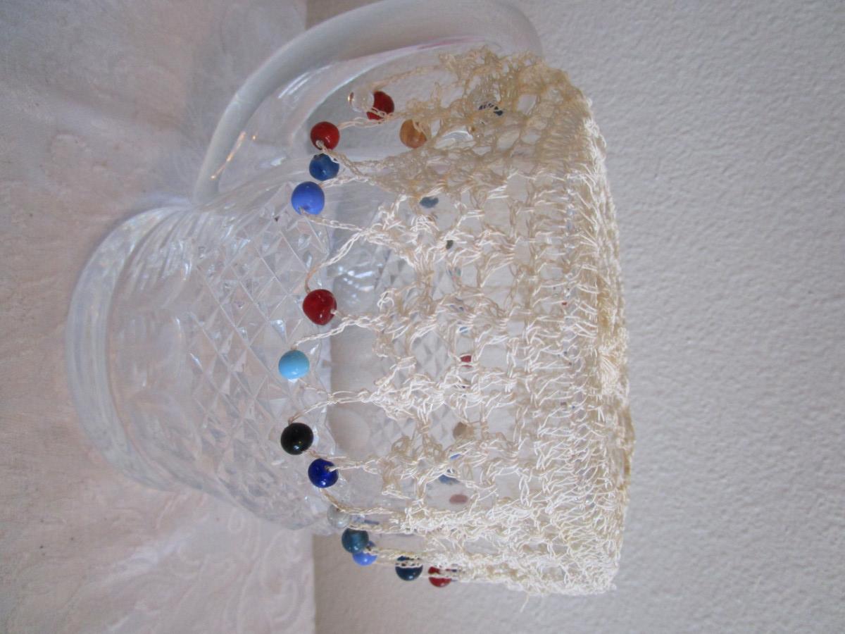 Vintage 32 ounce pitcher, 6" tall, with Beaded lace tatted beverage bonnet from Ireland