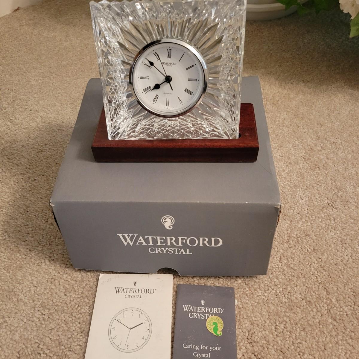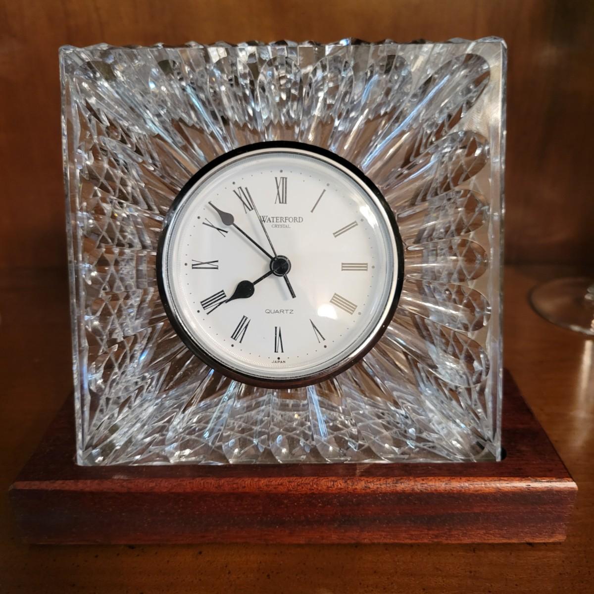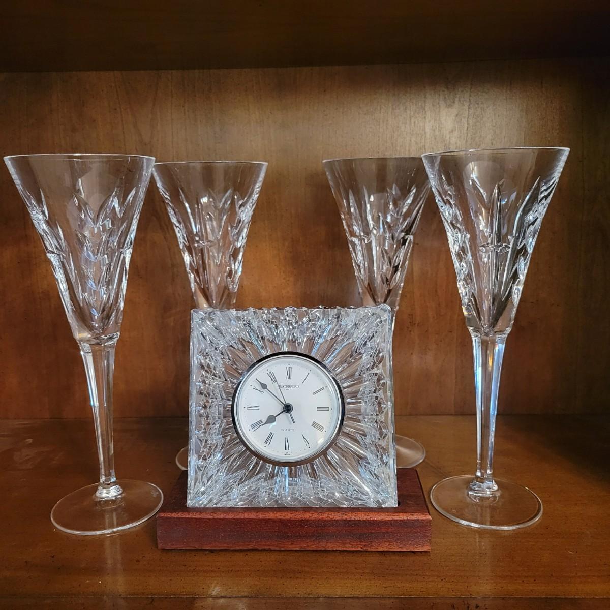 A Waterford crystal clock and four champagne flutes. The clock is in its original packaging and includes a wooden base for the clock to sit on. Measures approximately 5" x 2" x 5"H. Lot also includes four Waterford champagne flutes that measure approximately 3.5"D x 9"H. Shipping available. Shipping can be costly. We suggest contacting our preferred local shipping provider, Postage Express, with dimensions and getting an estimate before bidding: (828) 670-5501 or postageexpress@yahoo.com.