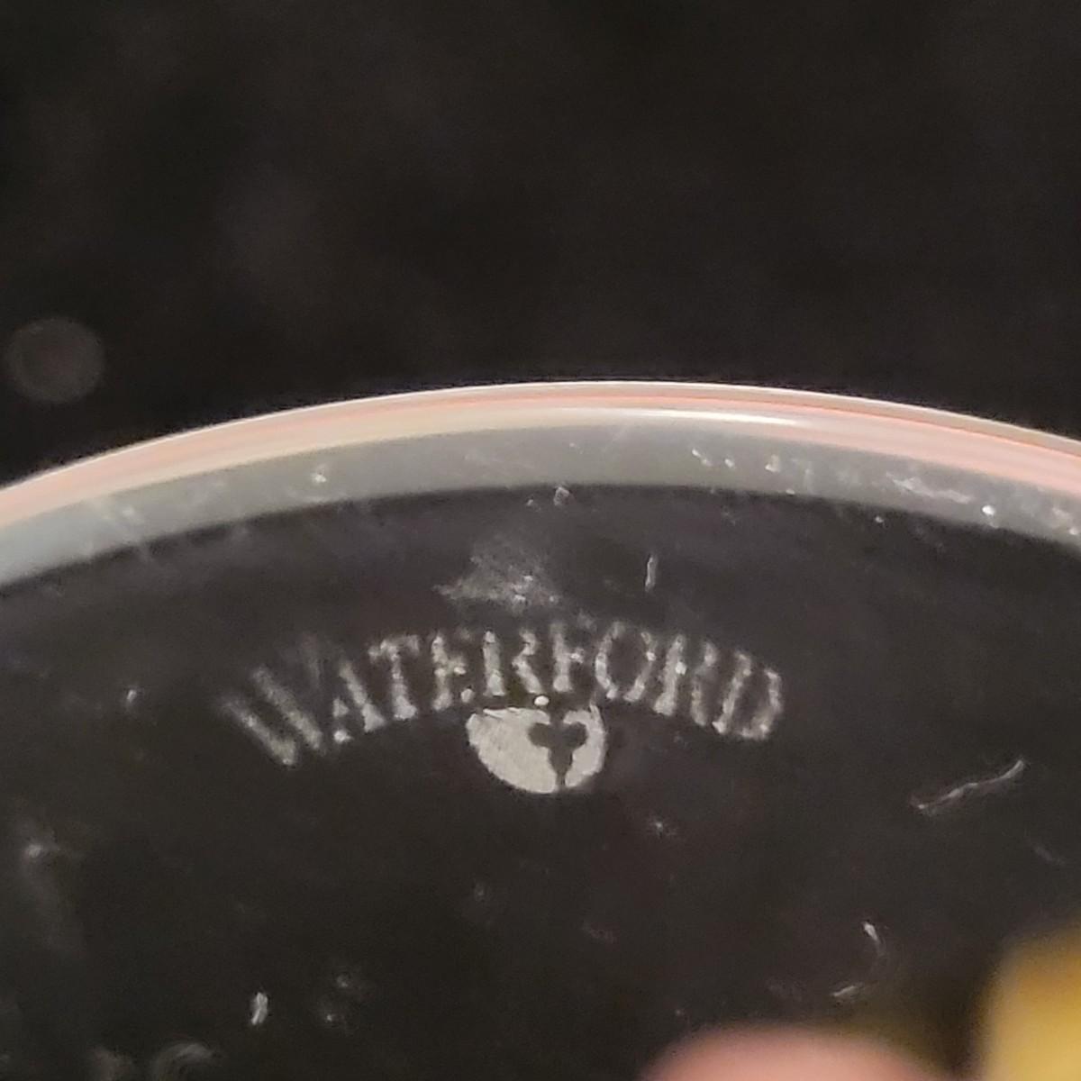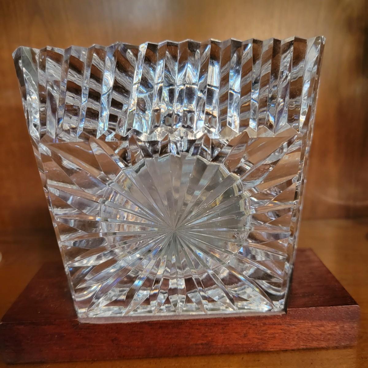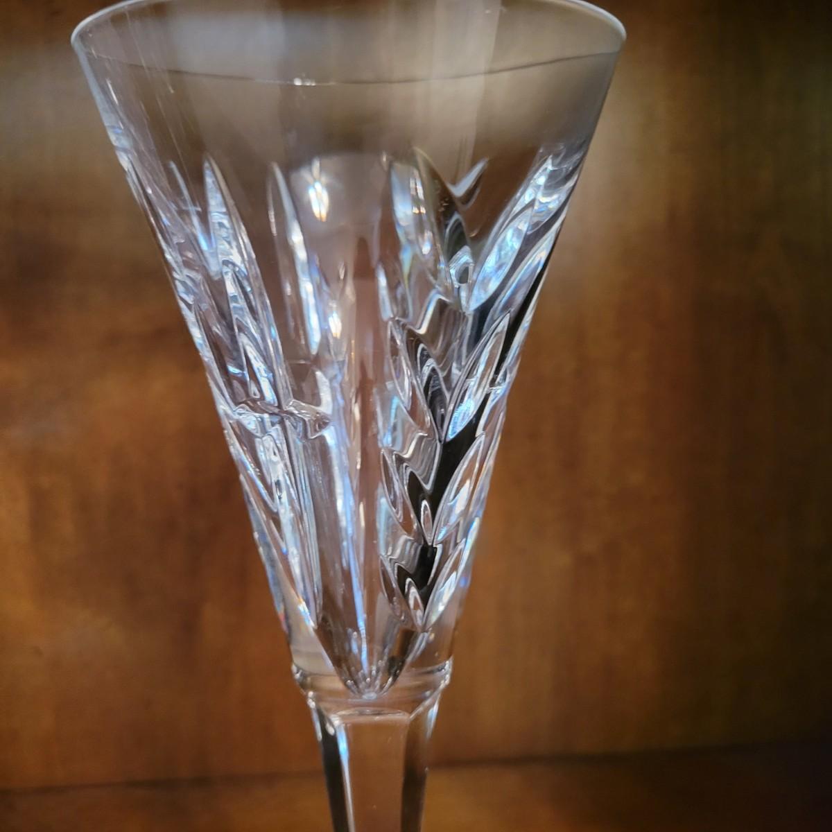 A Waterford crystal clock and four champagne flutes. The clock is in its original packaging and includes a wooden base for the clock to sit on. Measures approximately 5" x 2" x 5"H. Lot also includes four Waterford champagne flutes that measure approximately 3.5"D x 9"H. Shipping available. Shipping can be costly. We suggest contacting our preferred local shipping provider, Postage Express, with dimensions and getting an estimate before bidding: (828) 670-5501 or postageexpress@yahoo.com.