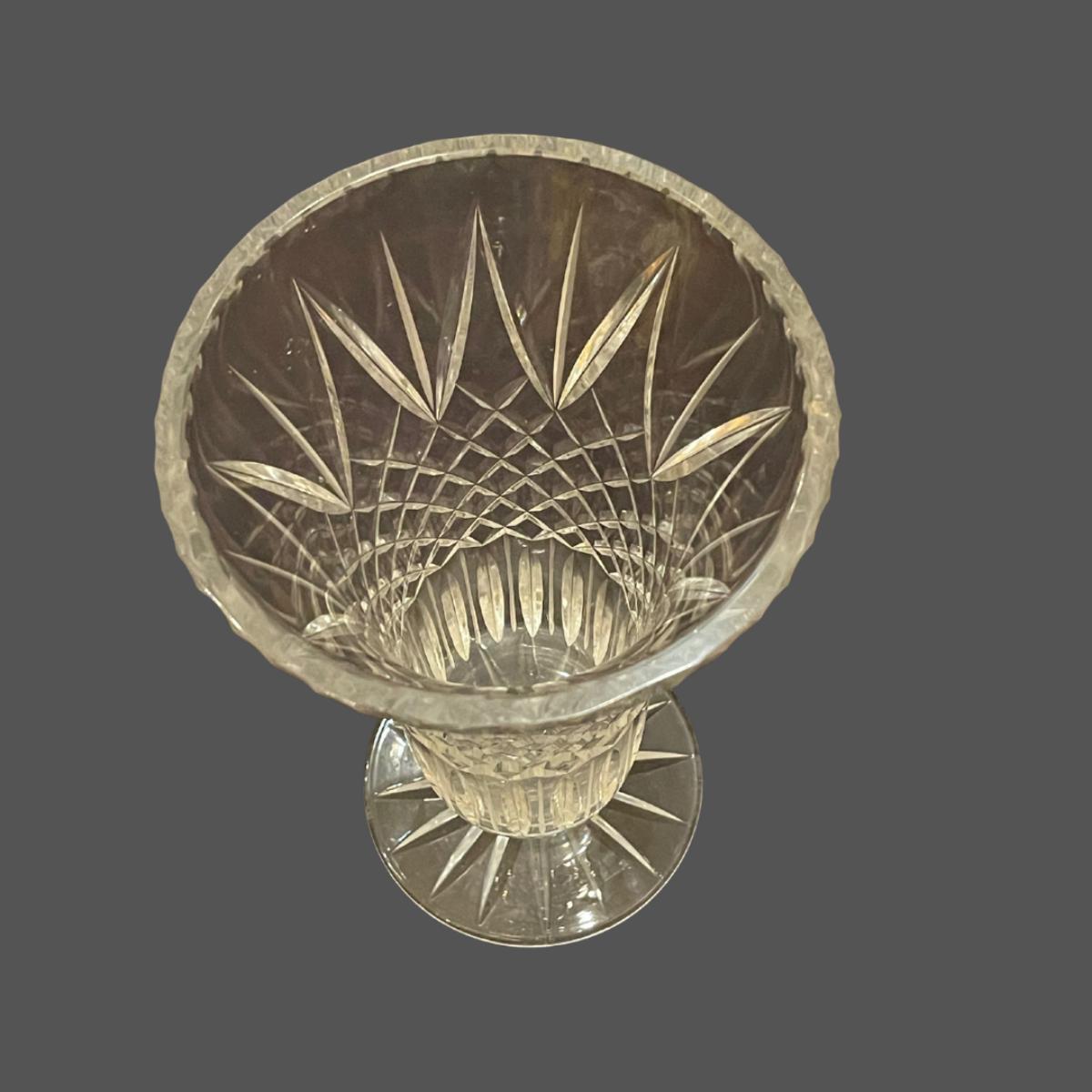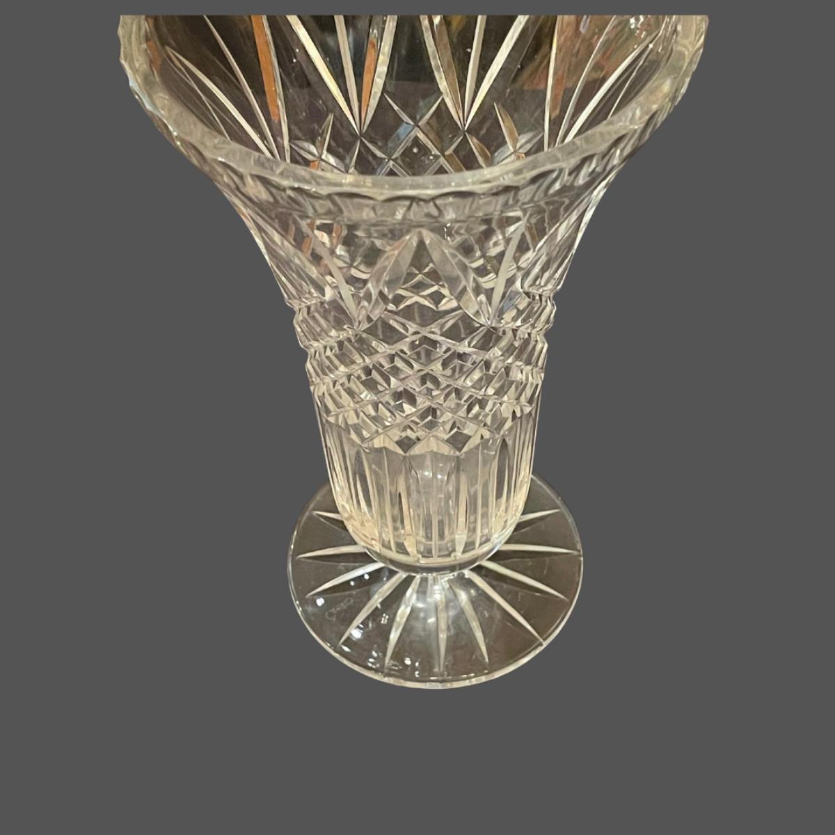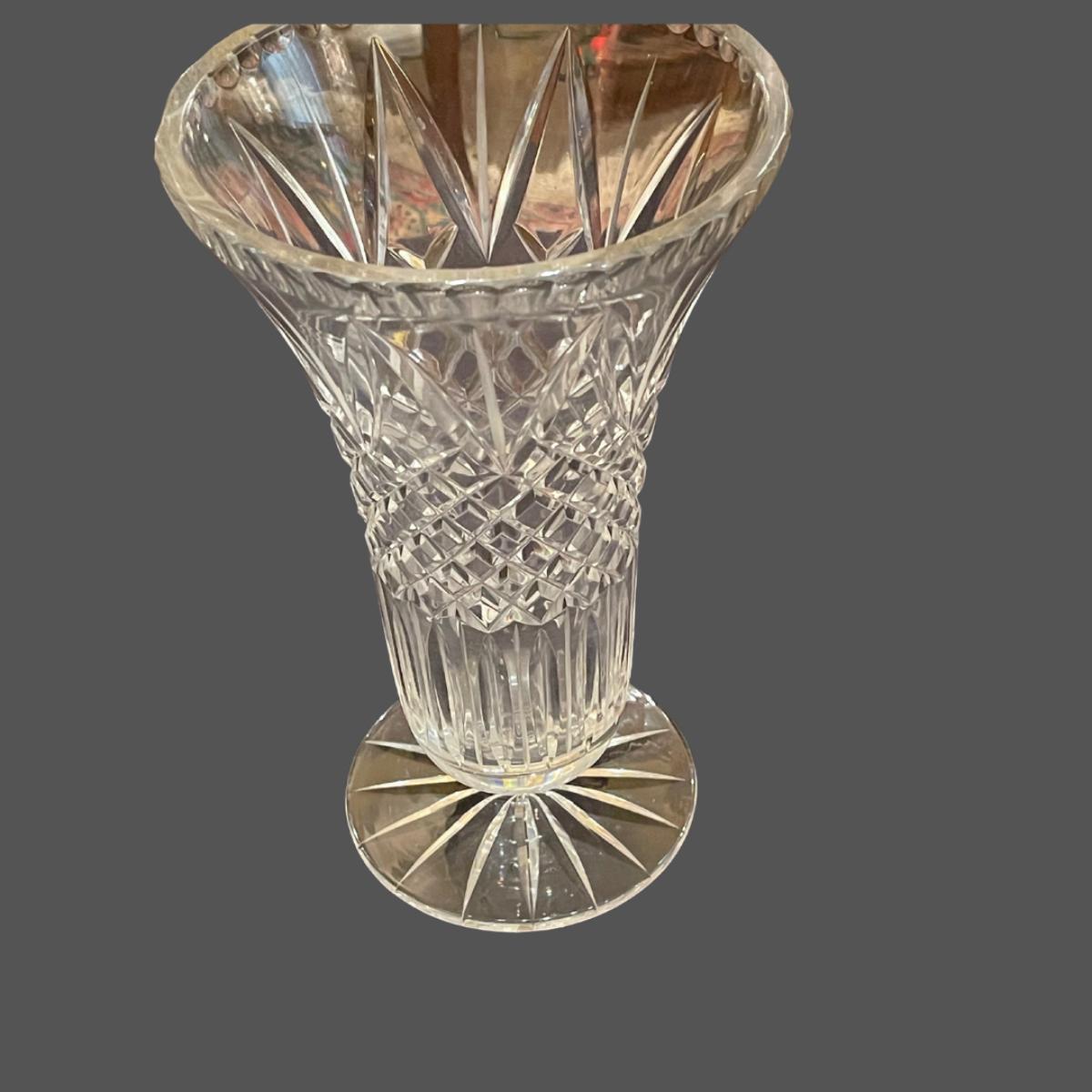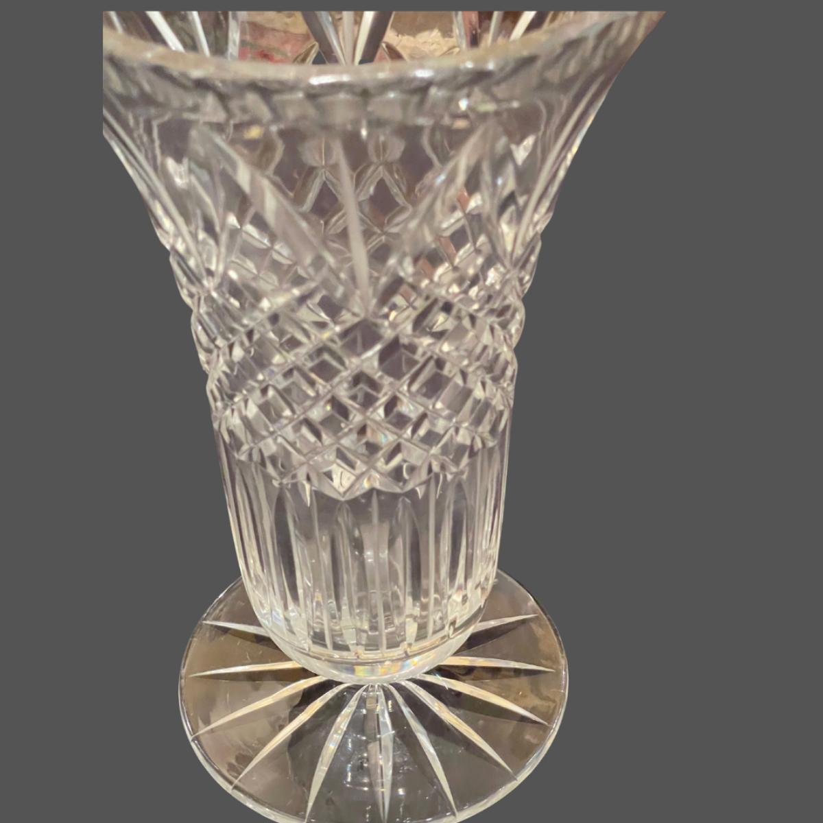 This beautiful Waterford vase is an inverted bell shape featuring a wedge and cross cut motif.