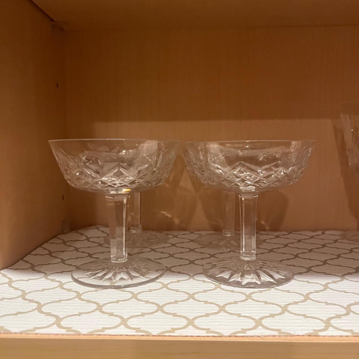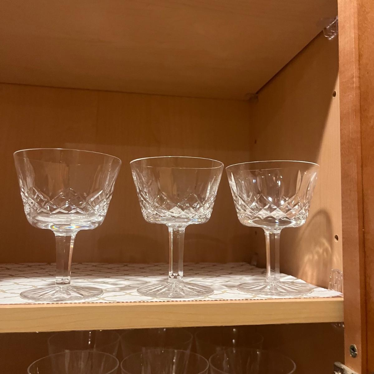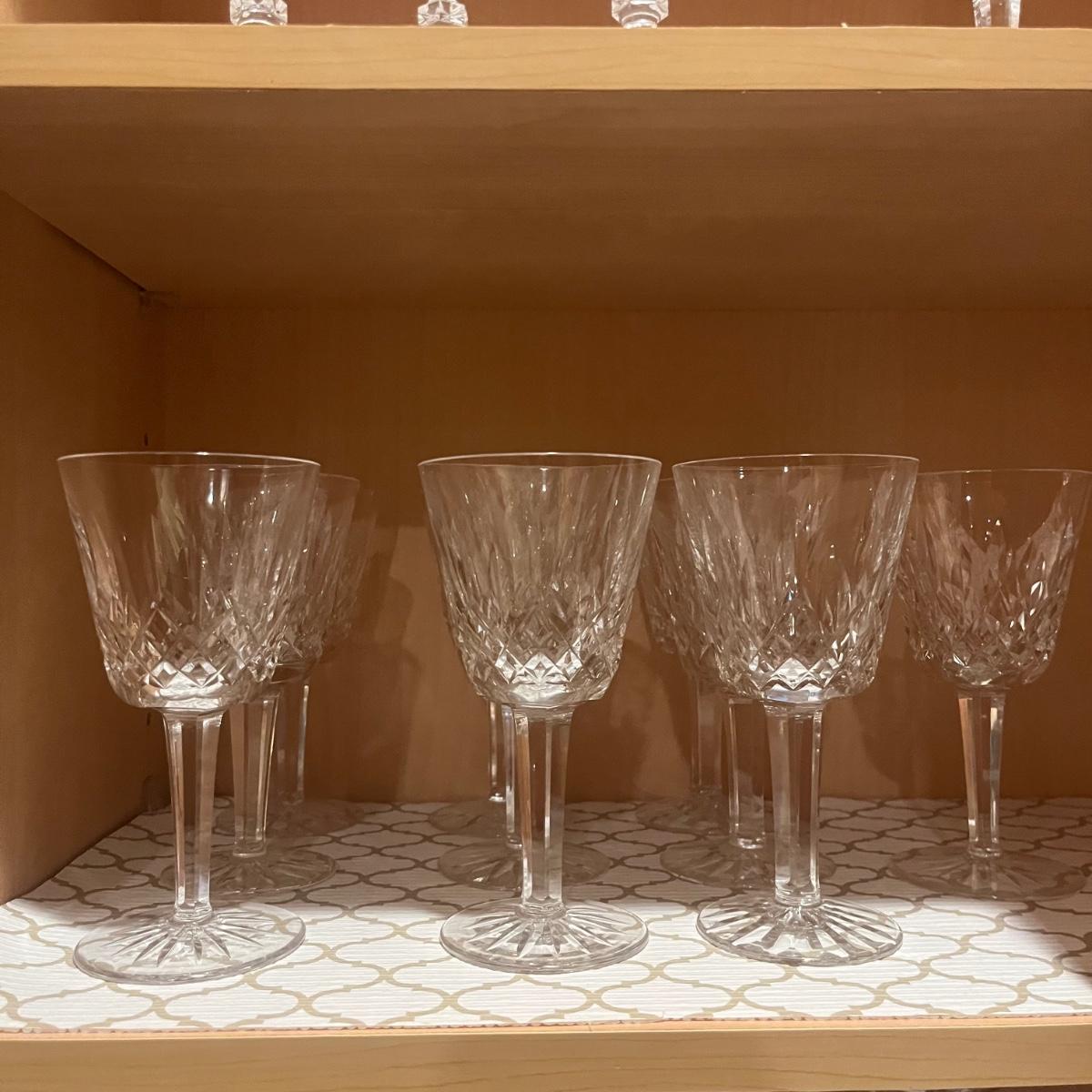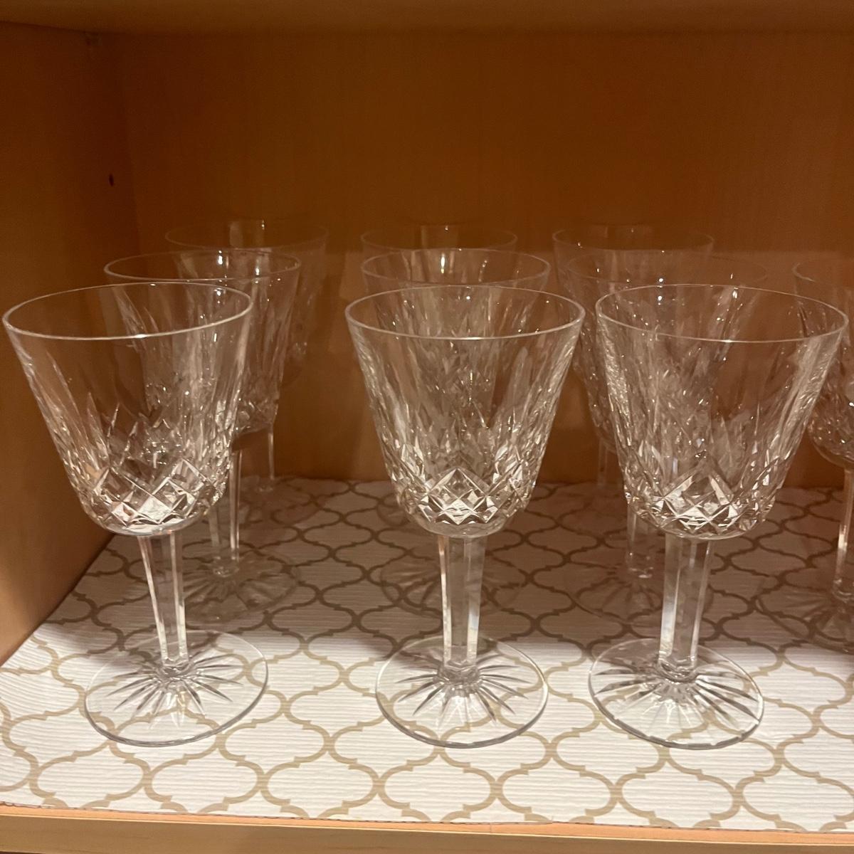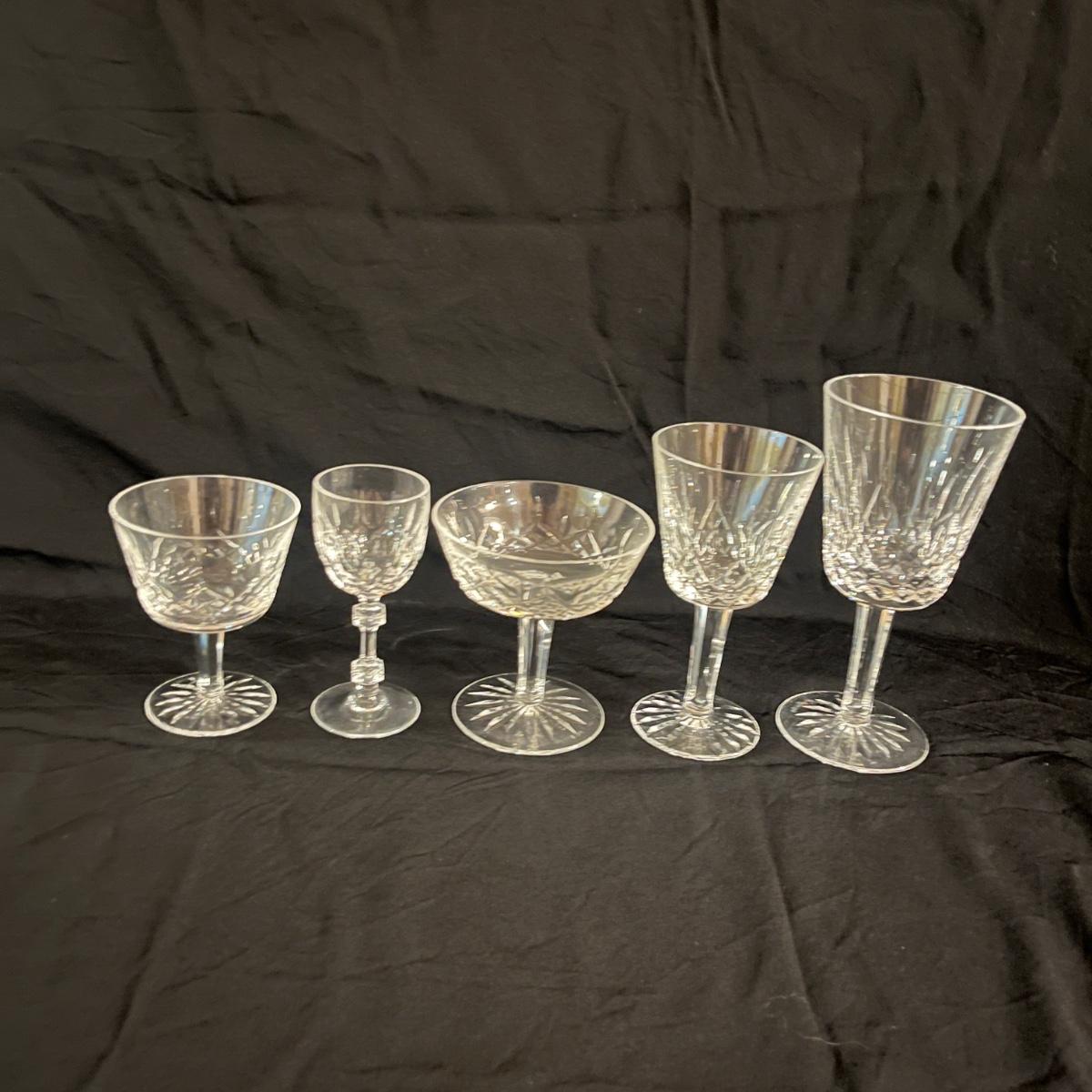 Lot contains a selection of Waterford Crystal glasses that includes ten small goblets, eight larger goblets, four champagne glasses and six smaller glasses. All glasses appear the same but not all are marked Waterford. Tallest glass measures 7”H.